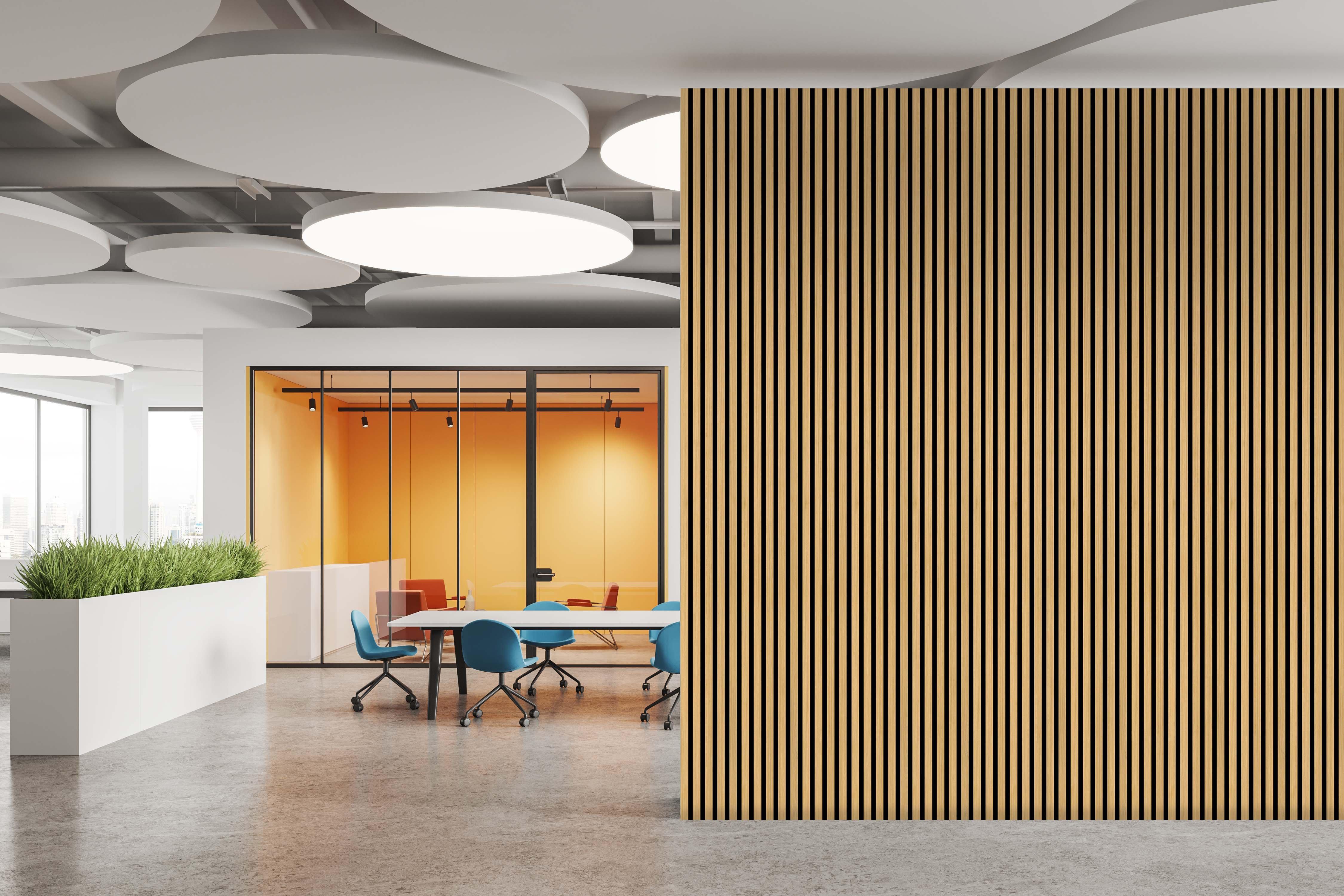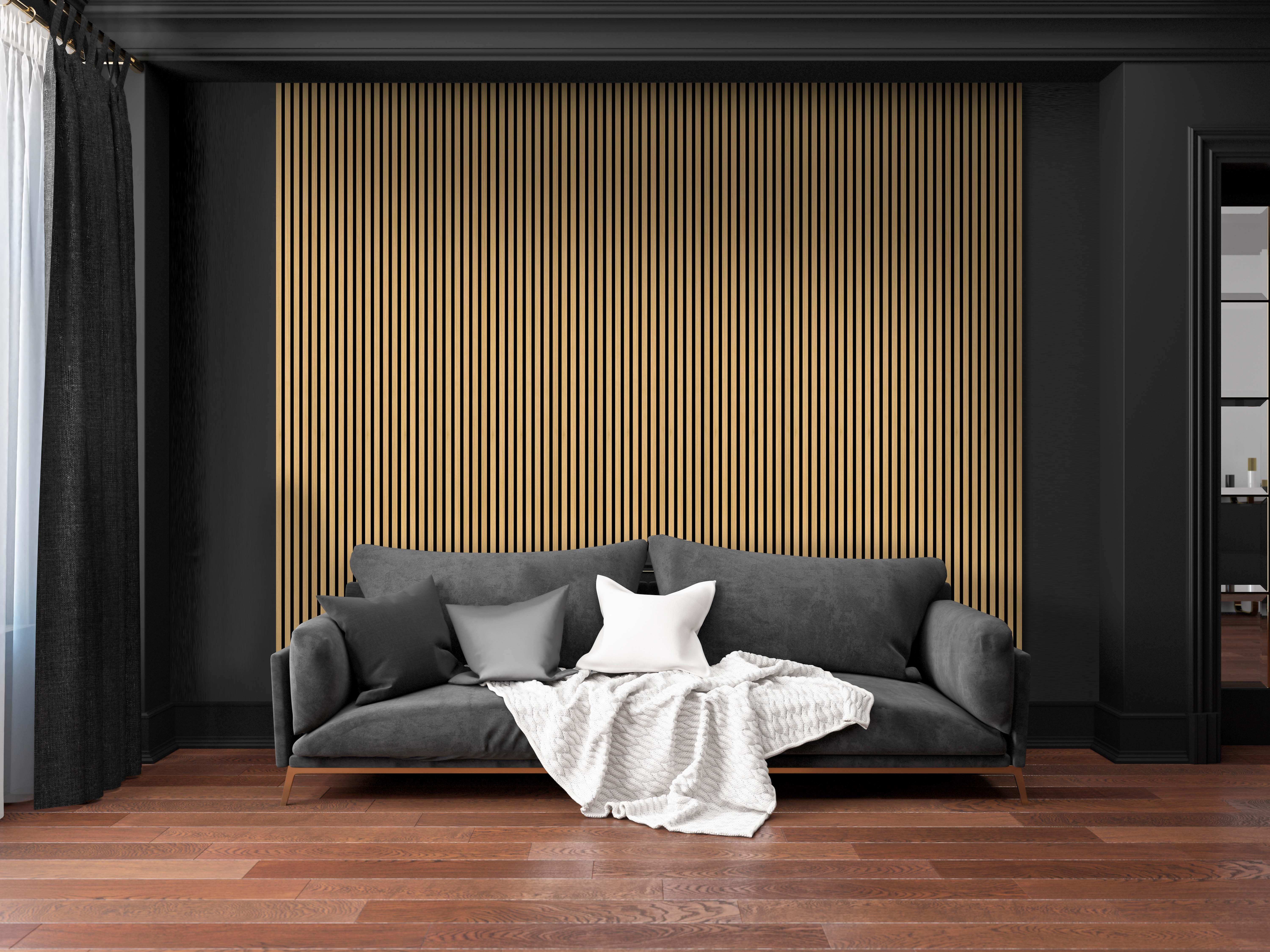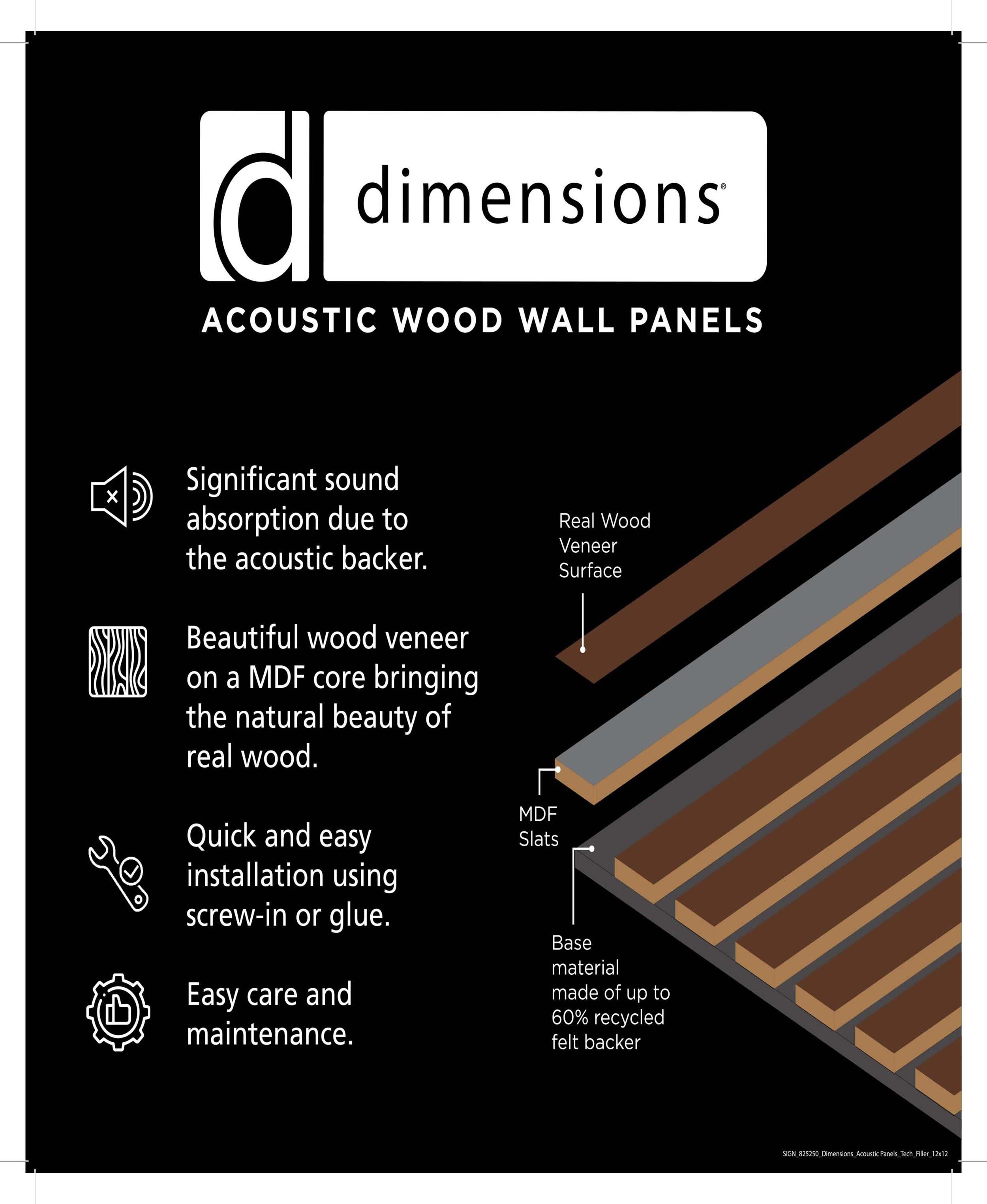 Acoustic Wall Panels are made up of recycled PET panel backer, MDF slat with real wood veneer. Black acoustic backing with real wood veneer give a modern and trendy look for any room. With a quick and easy install, transform any space in a day. Perfect for walls, ceilings, and even cabinet paneling. The acoustic backing dampens the reflective noises within a home, office, or commercial space.