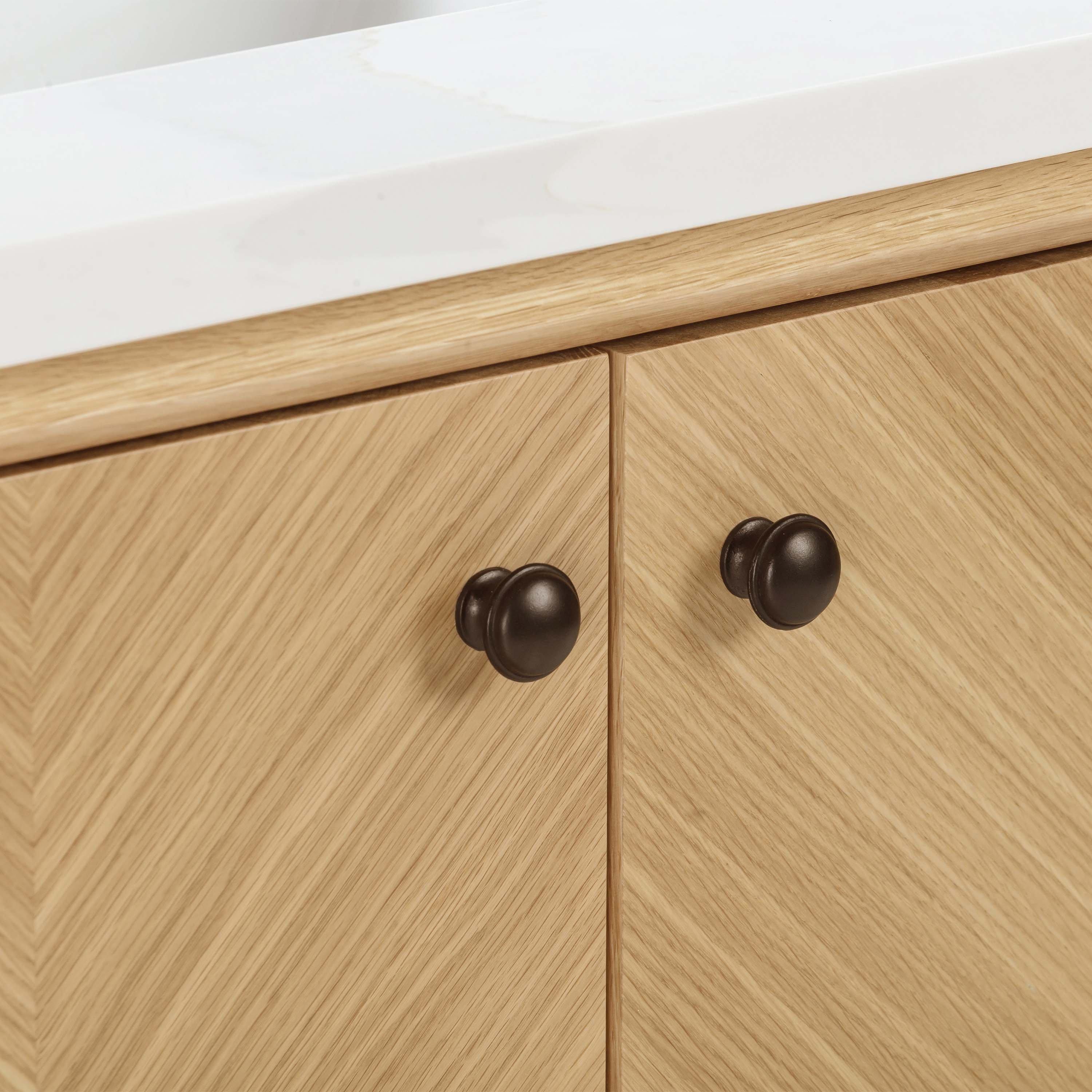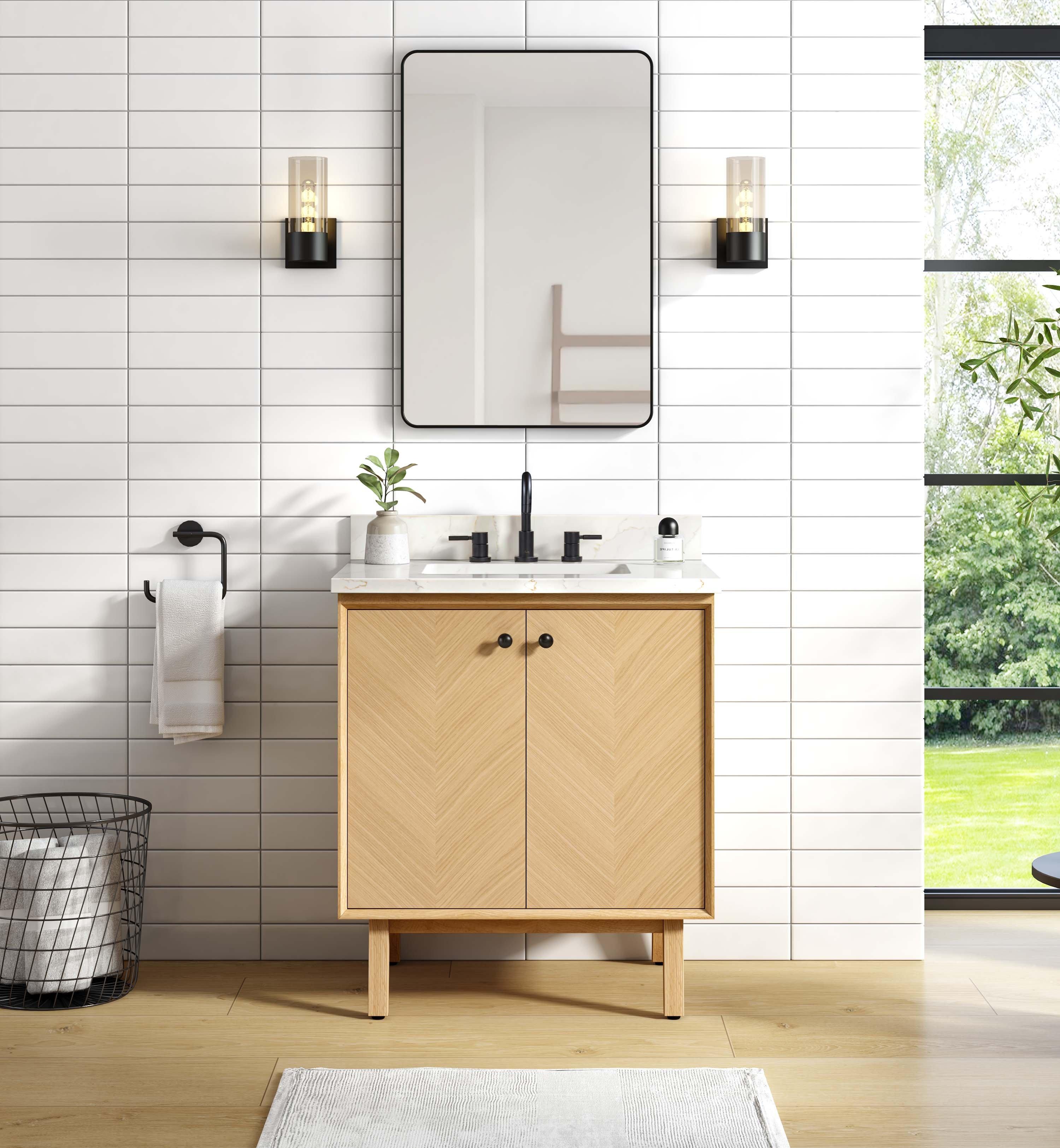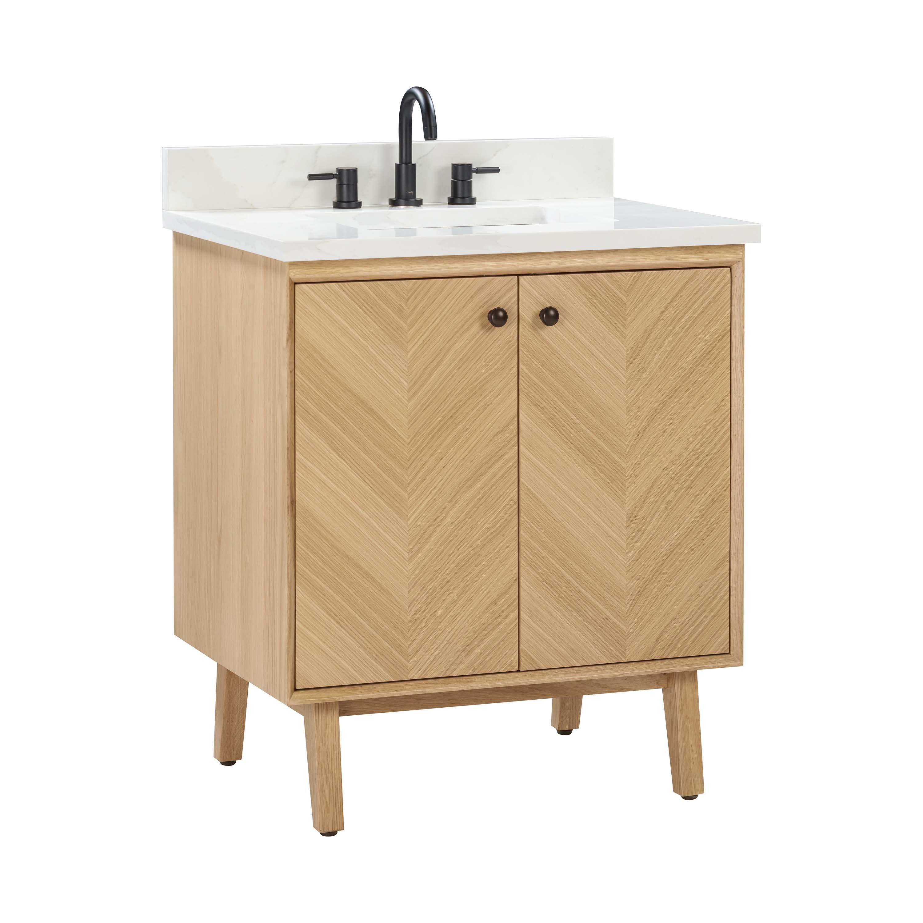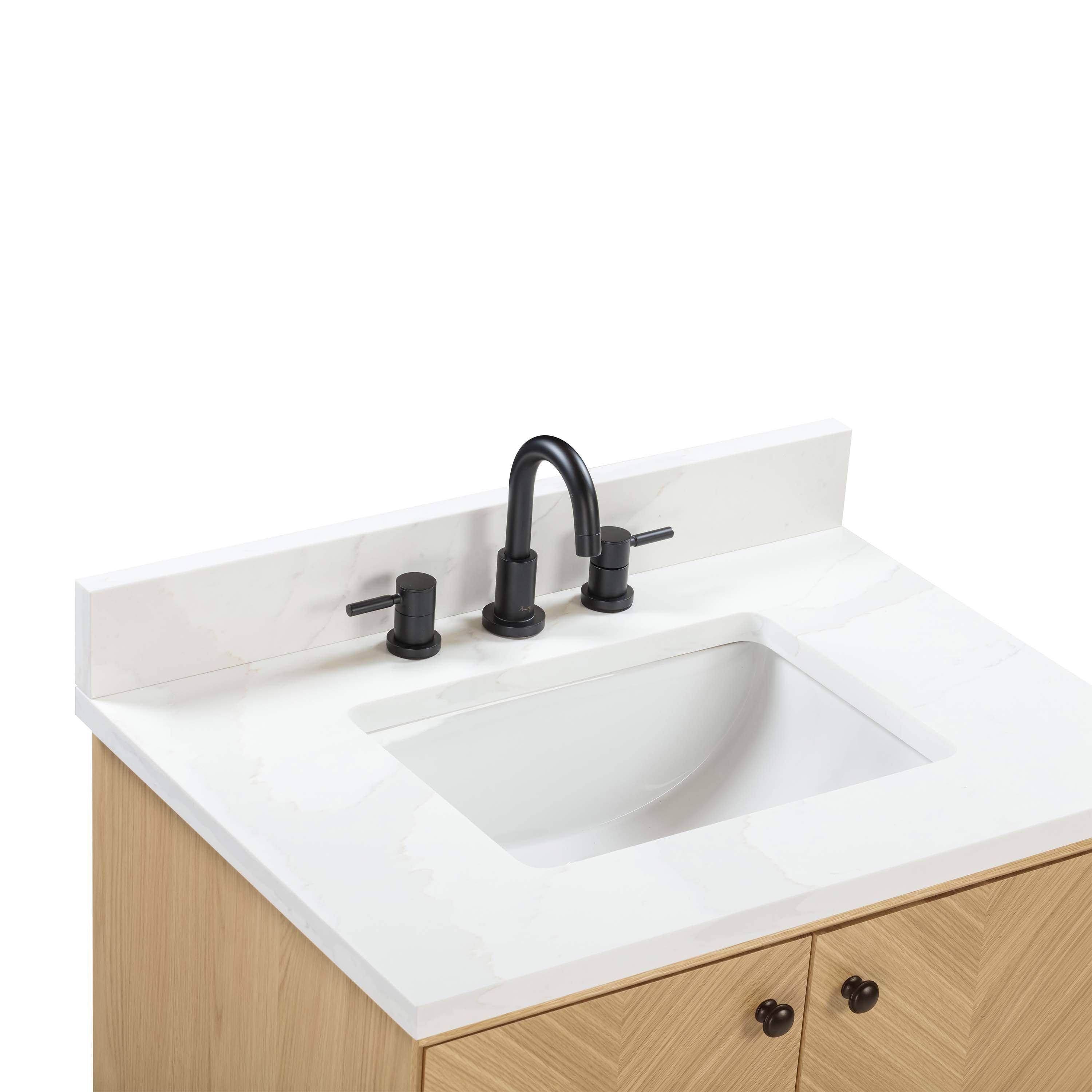 Tailor the look of your bathroom with the Adrian 31 in. Natural Oak Vanity with Calacatta Quartz Top featuring gorgeous solid wood, mdf in natural with 2 doors, 1 drawers, and 0 shelves. This piece is completed with beautiful matte black hardware and a single undermount white sink. The Adrian 31 in. Natural Oak Vanity with Calacatta Quartz Top is a stunning addition to any bathroom setting.