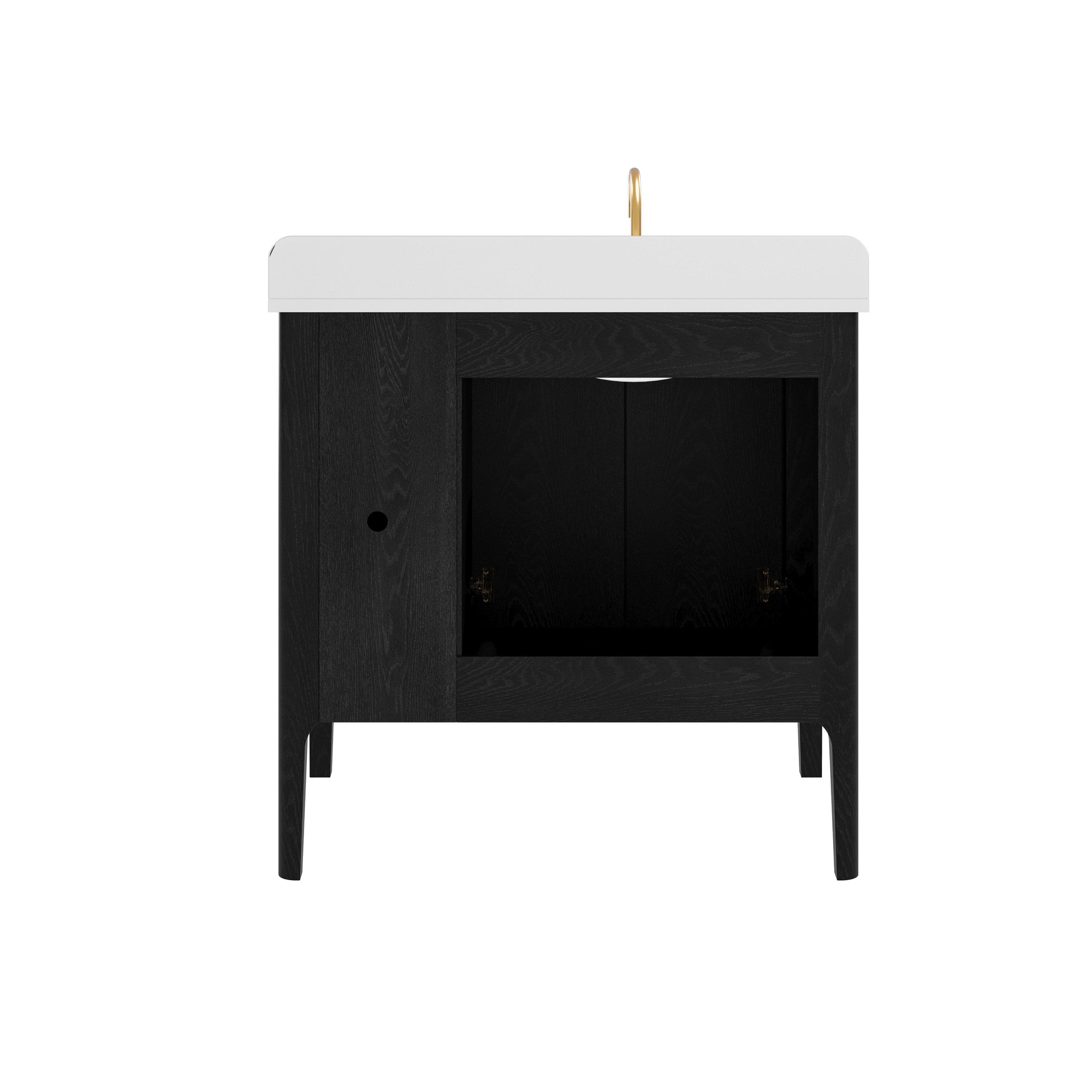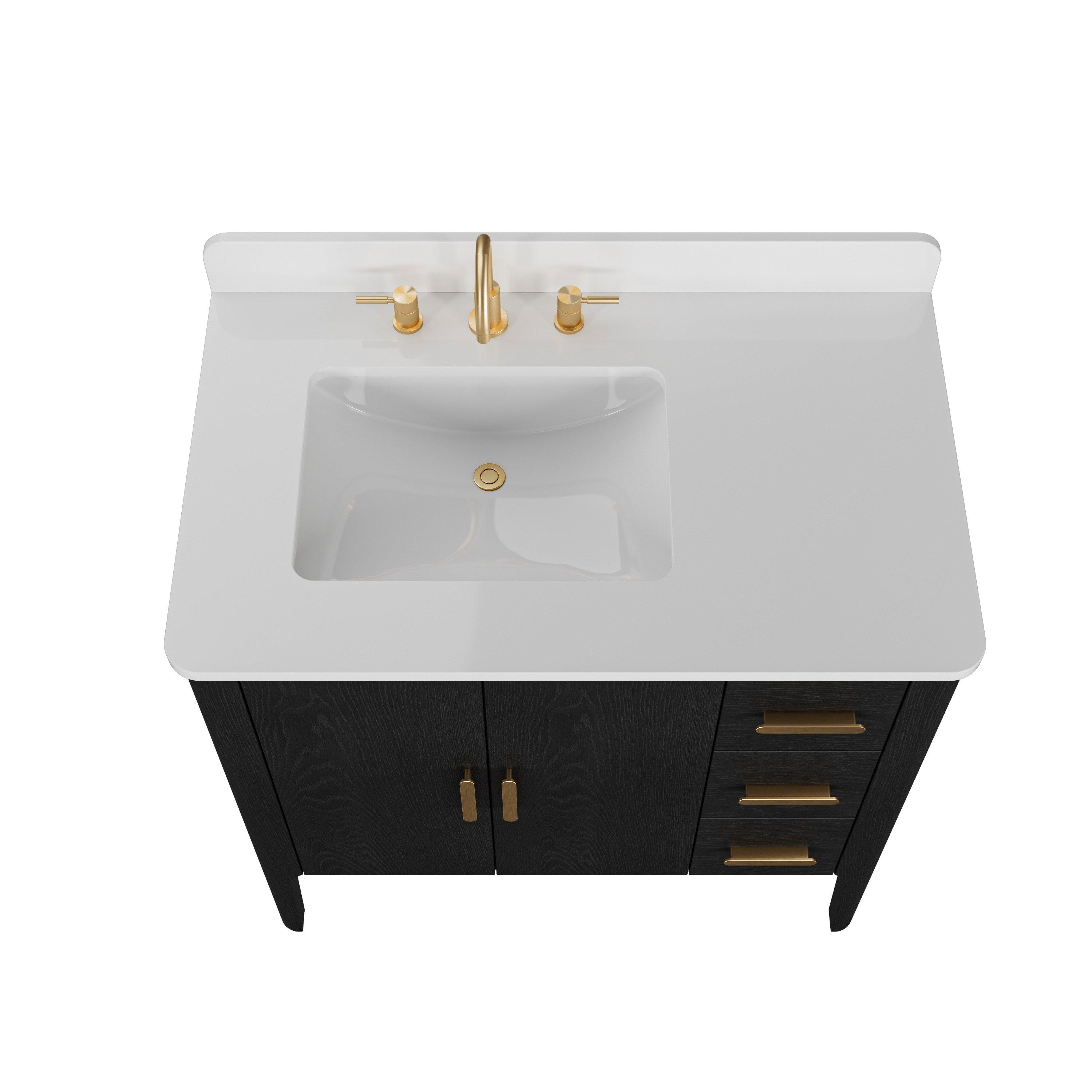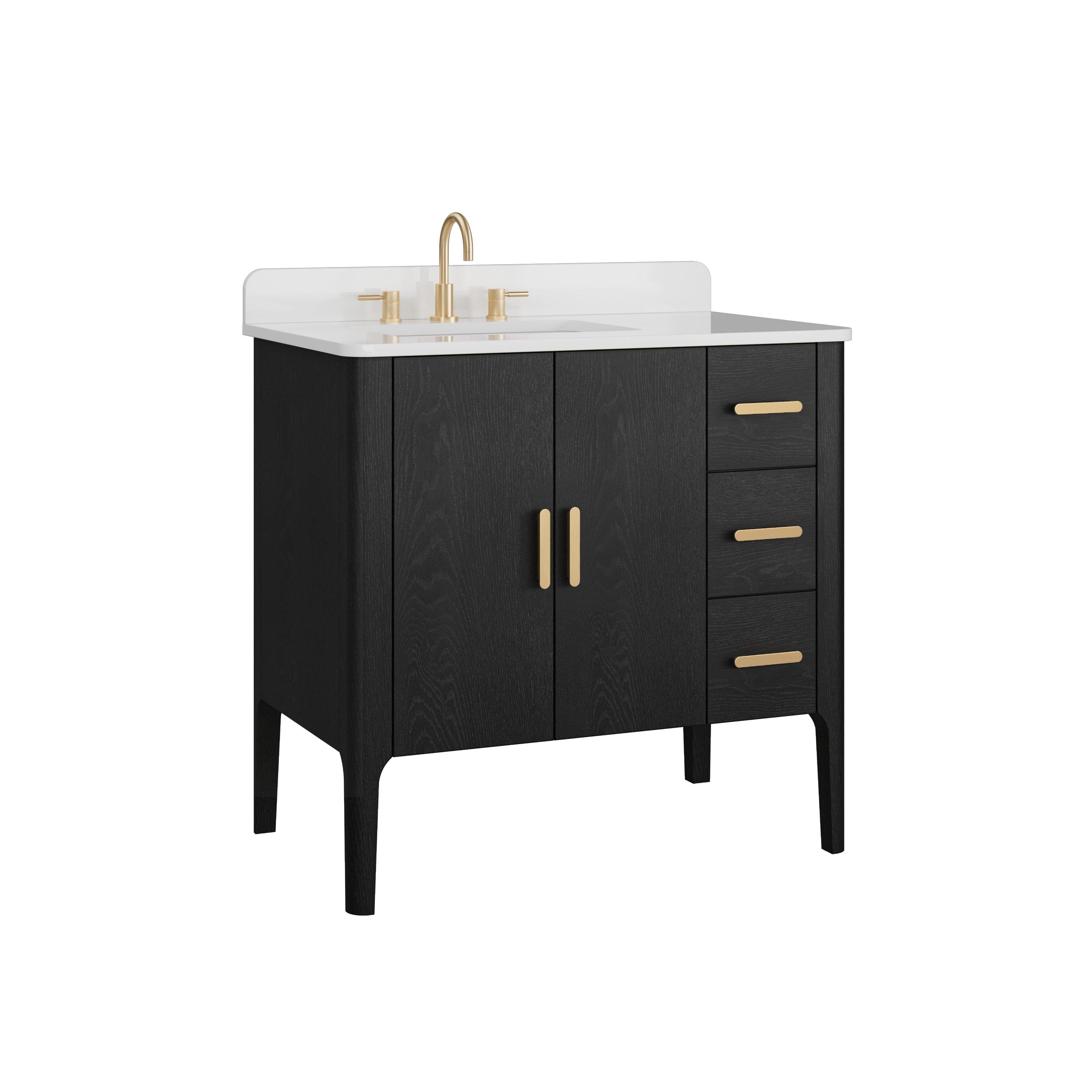 Tailor the look of your bathroom with the Aspen 37 in. Black Vanity with Quartz Top featuring gorgeous solid wood, mdf in black with 2 doors, 3 drawers, and 0 shelves. This piece is completed with beautiful matte gold hardware and a single undermount white sink. The Aspen 37 in. Black Vanity with Quartz Top is a stunning addition to any bathroom setting.
