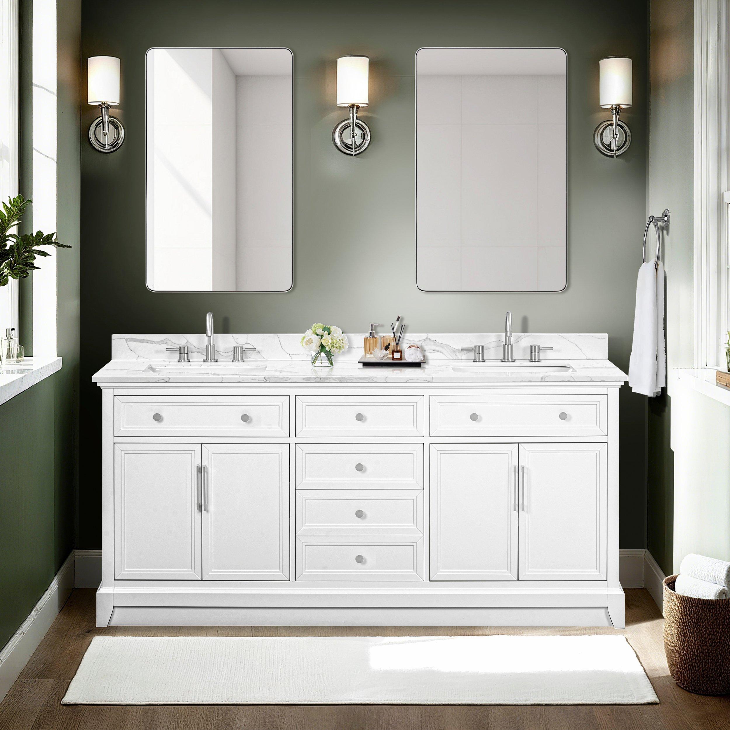 Complete your bathroom with the beautiful Aurora 73 in. White Vanity with Quartz Top. This freestanding features durable solid wood, mdf cabinets in stunning white with a white quartz vanity top and brushed nickel hardware. A charming double undermount sink in brilliant white is included. The Aurora 73 in. White Vanity with Quartz Top is a versatile choice to customize multiple bathroom settings.