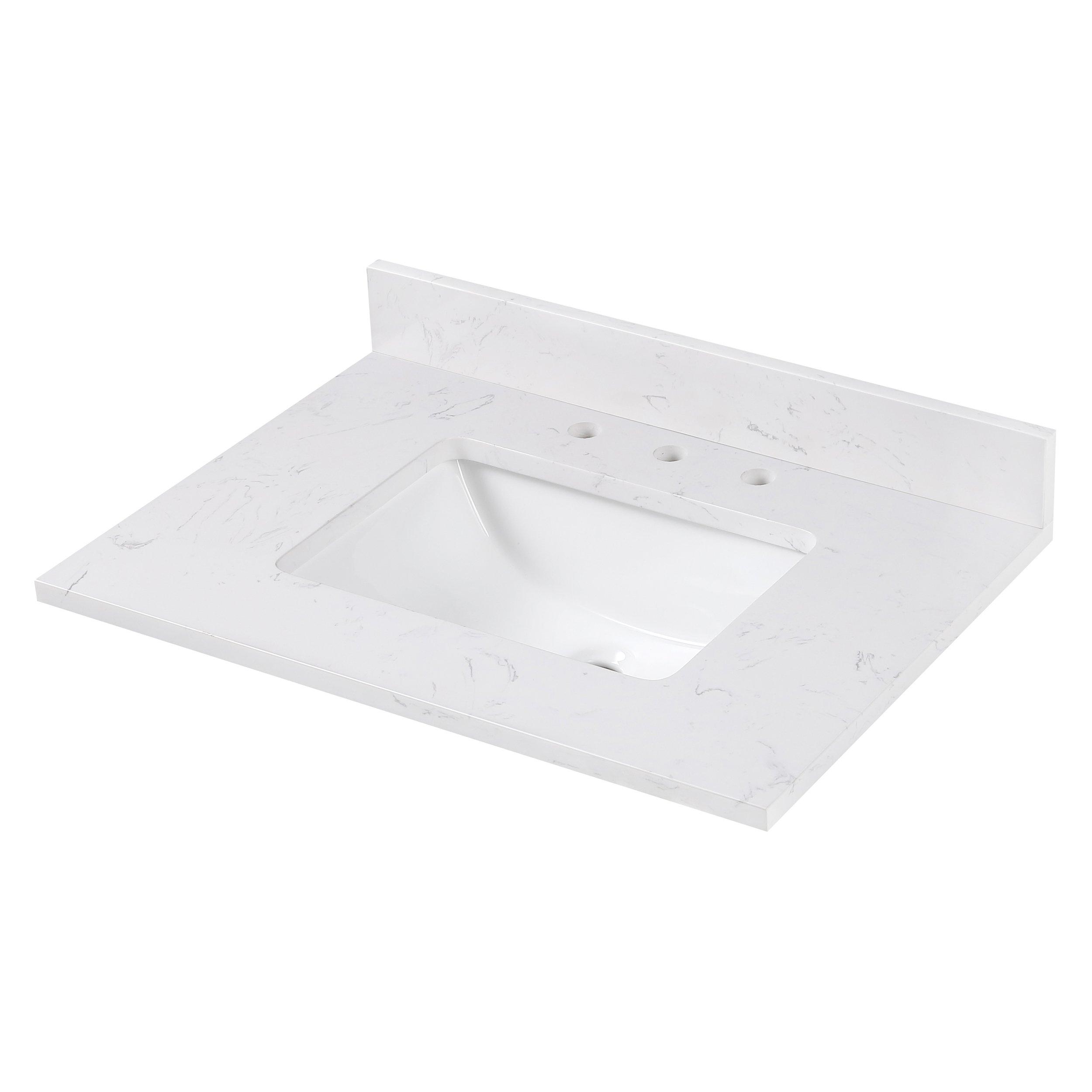 The sink position is offset and not directly centered on the vanity top to allow for more space on the side of the vanity.