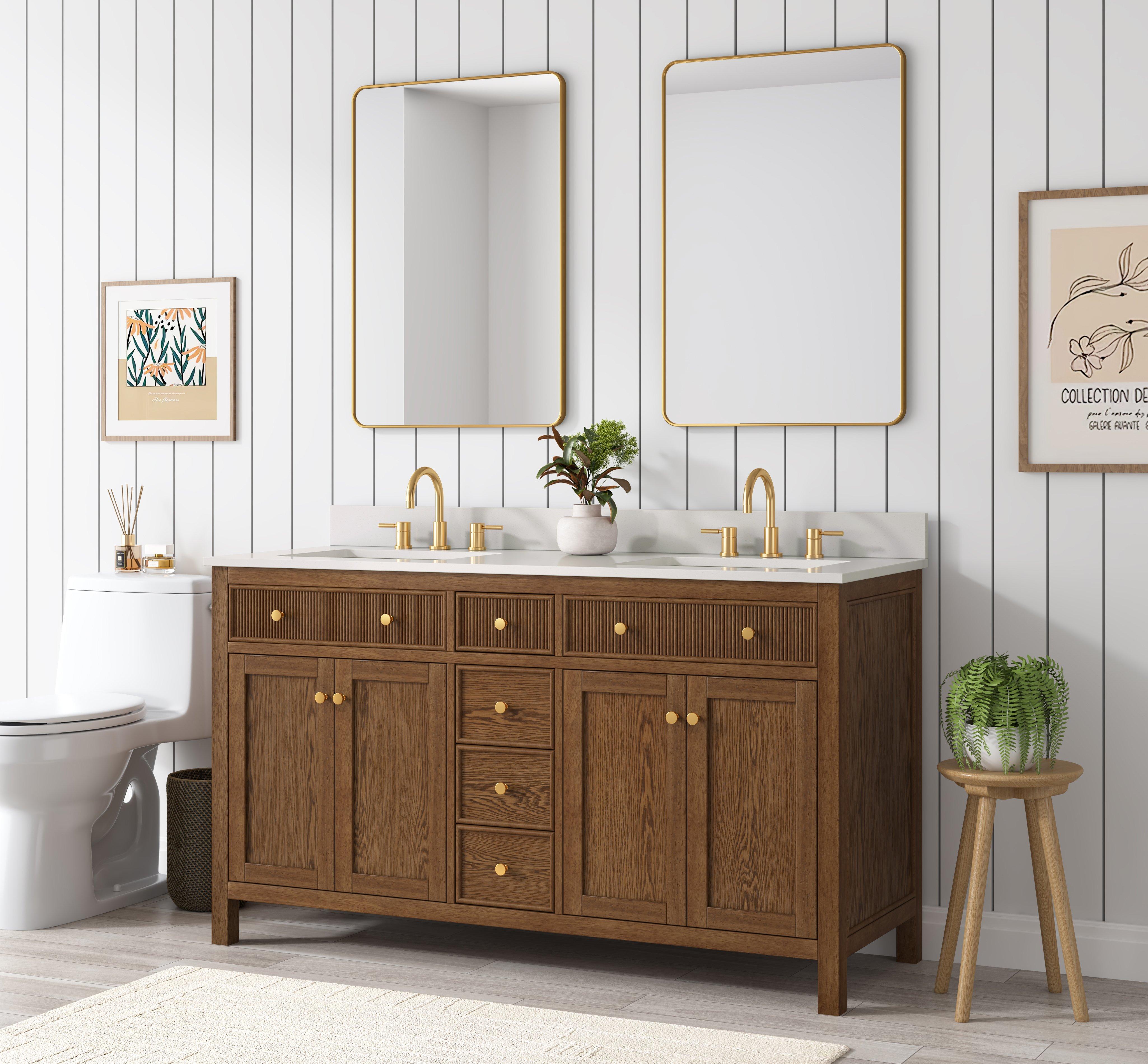Tailor the look of your bathroom with the Dylan 61 in. Cinnamon Vanity with Quartz Top featuring gorgeous mdf in brown with 4 doors, 6 drawers, and 2 shelves. This piece is completed with beautiful matte gold hardware and a double undermount white sink. The Dylan 61 in. Cinnamon Vanity with Quartz Top is a stunning addition to any bathroom setting.