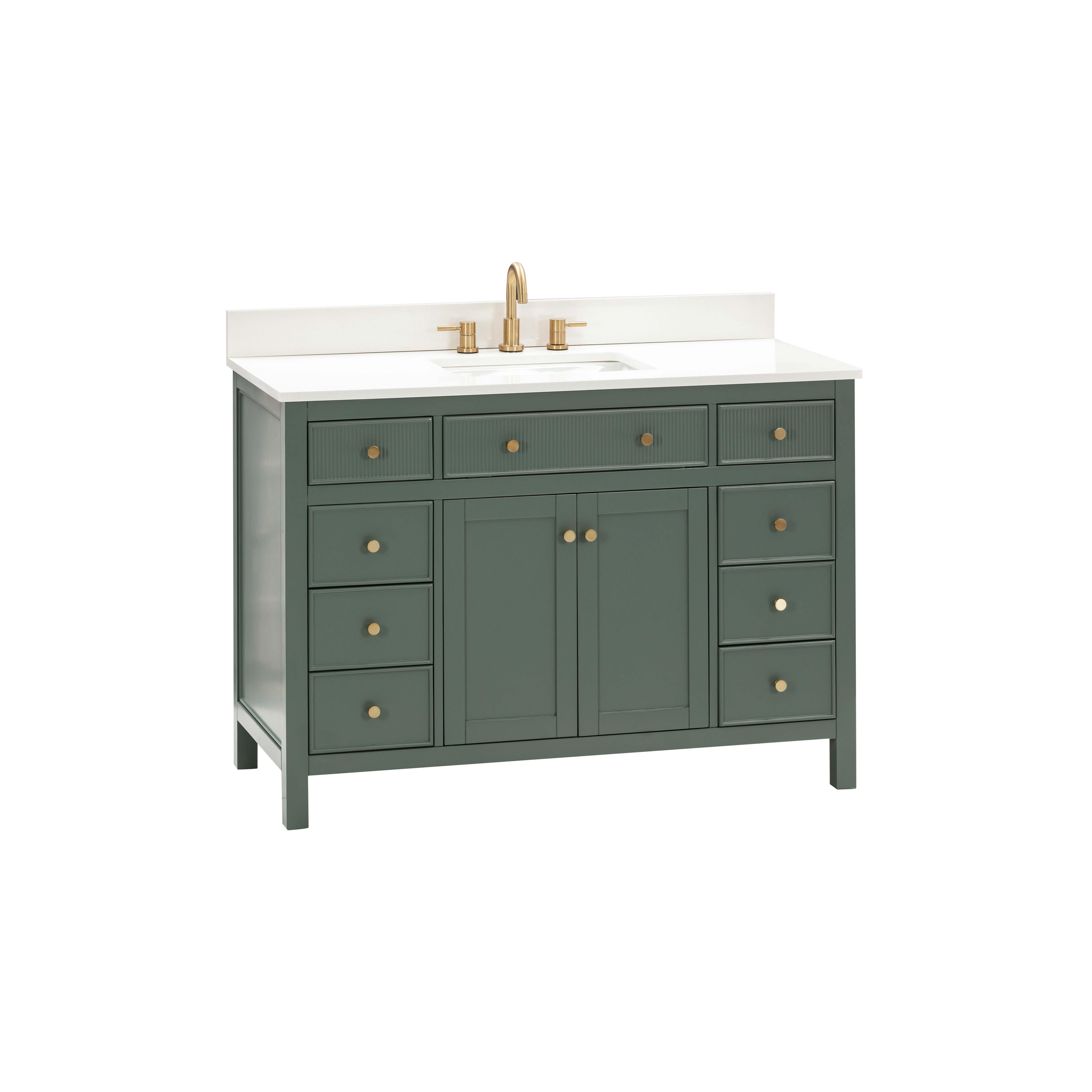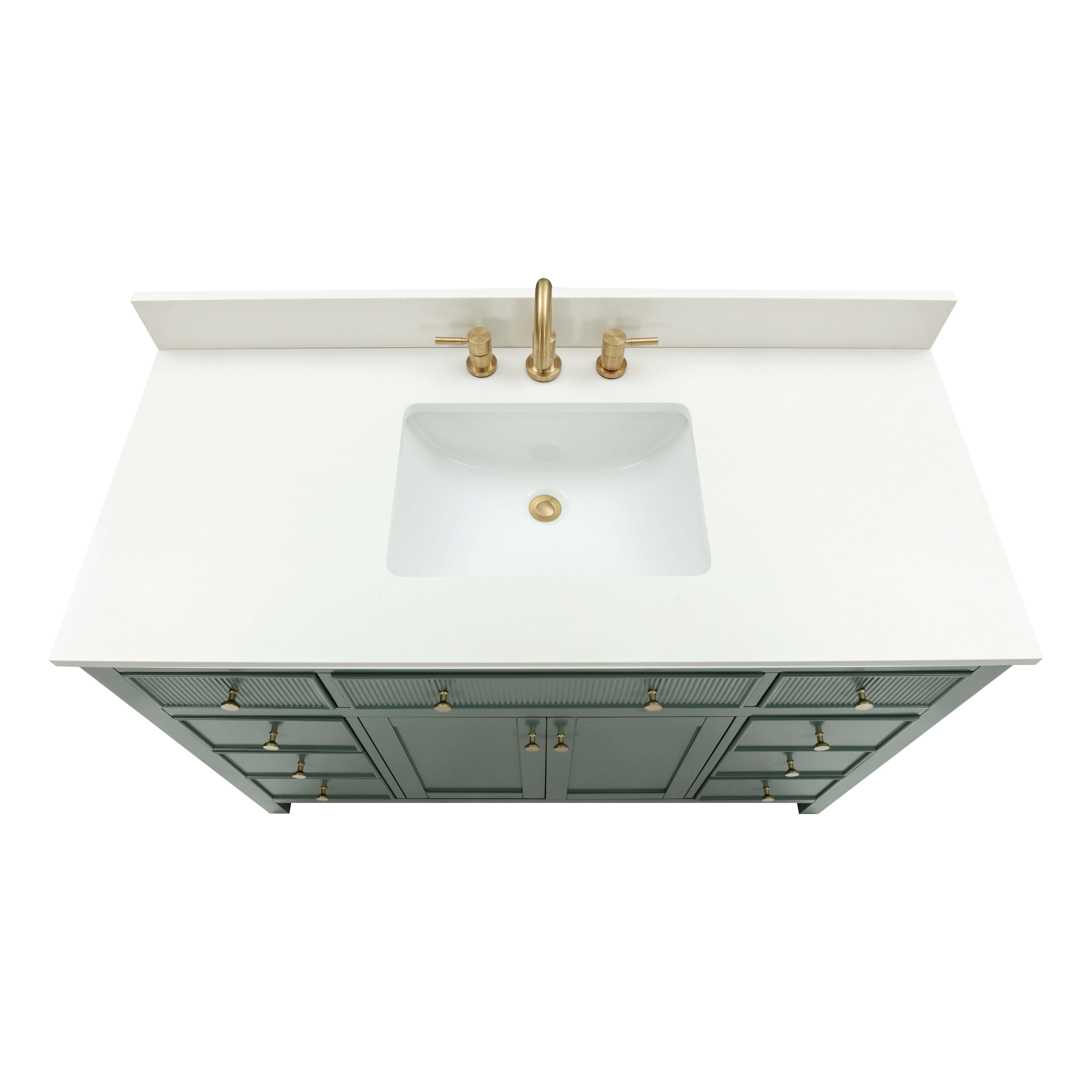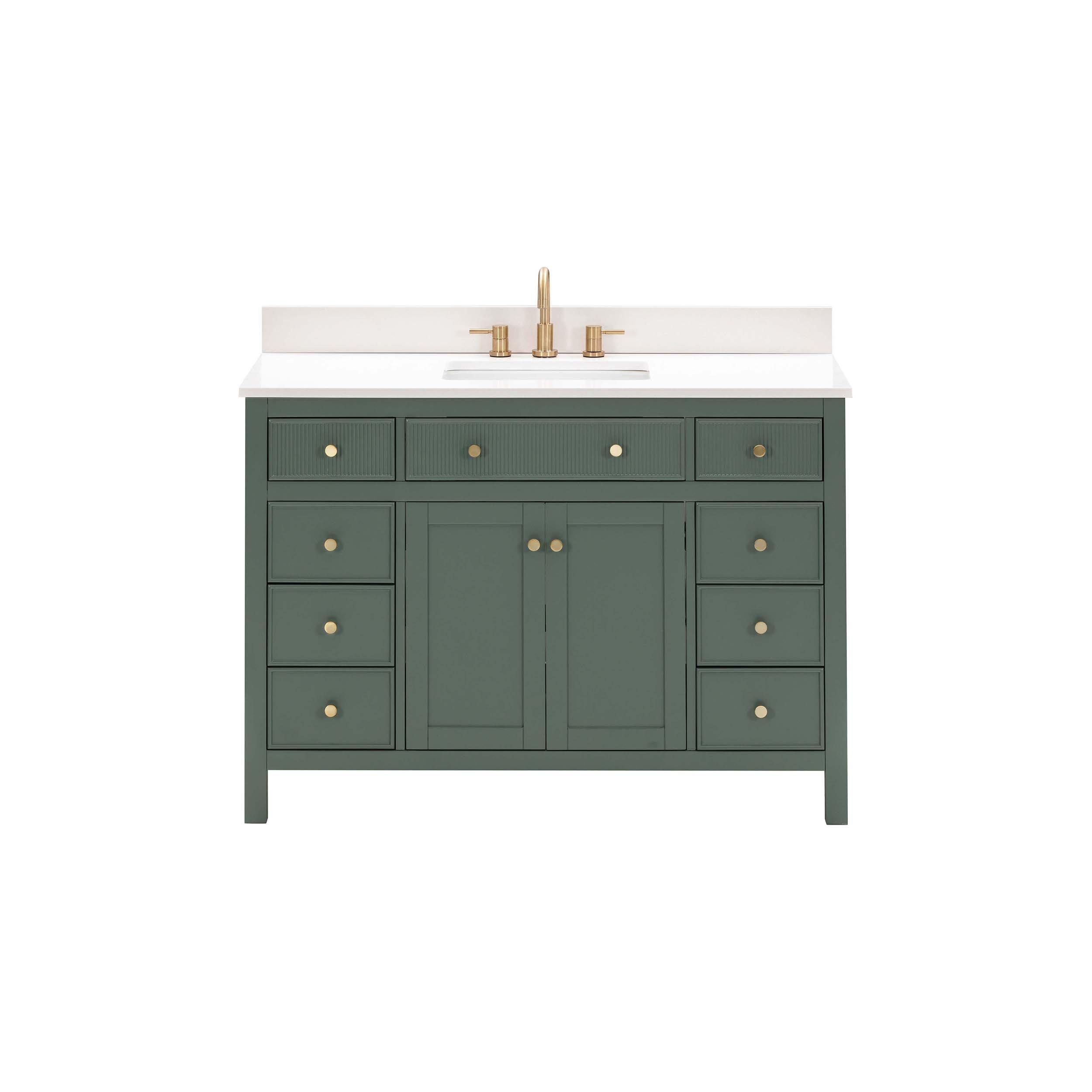 Tailor the look of your bathroom with the Dylan 49 in. Smoke Green Vanity with Quartz Top featuring gorgeous mdf in green with 2 doors, 9 drawers, and 1 shelves. This piece is completed with beautiful matte gold hardware and a single undermount white sink. The Dylan 49 in. Smoke Green Vanity with Quartz Top is a stunning addition to any bathroom setting.