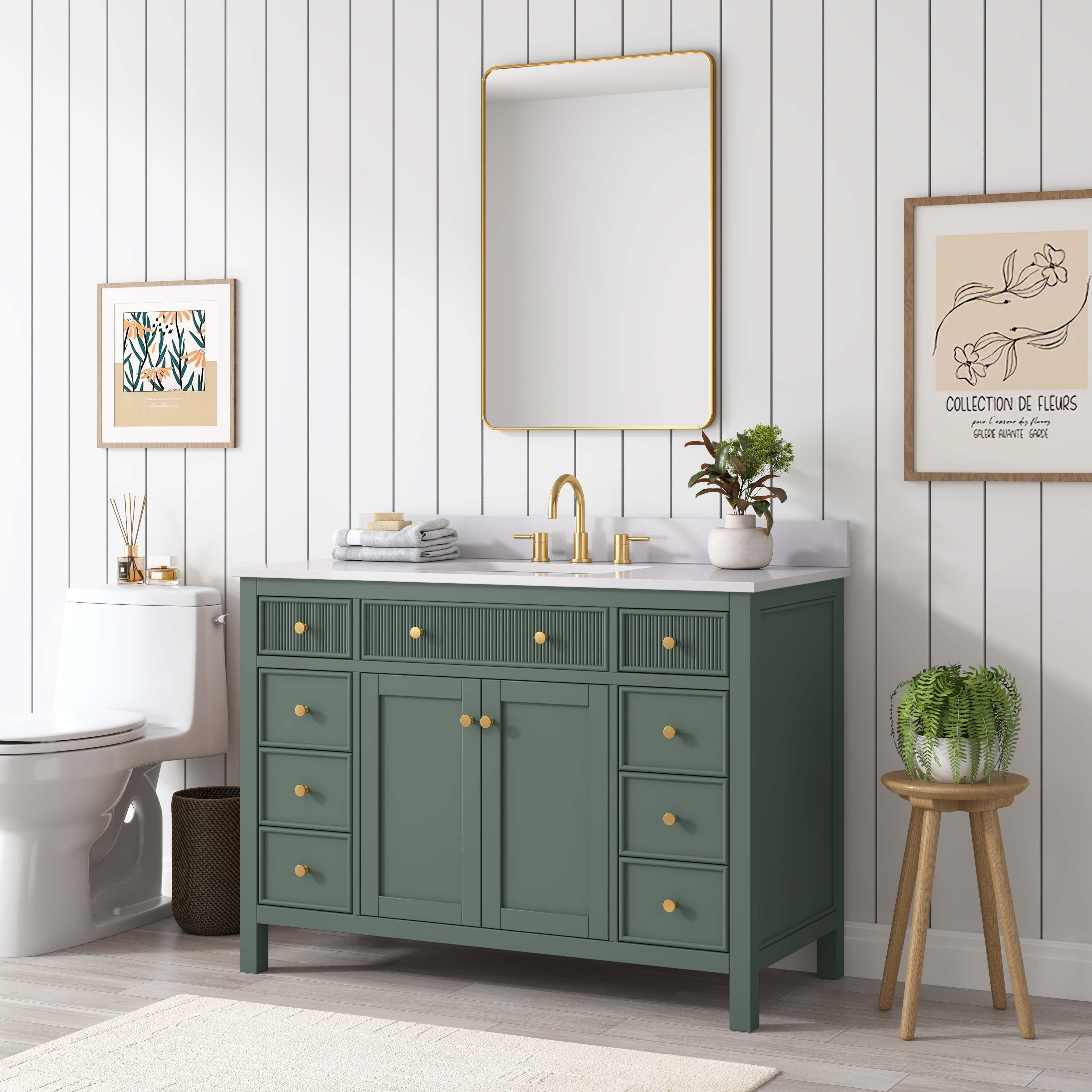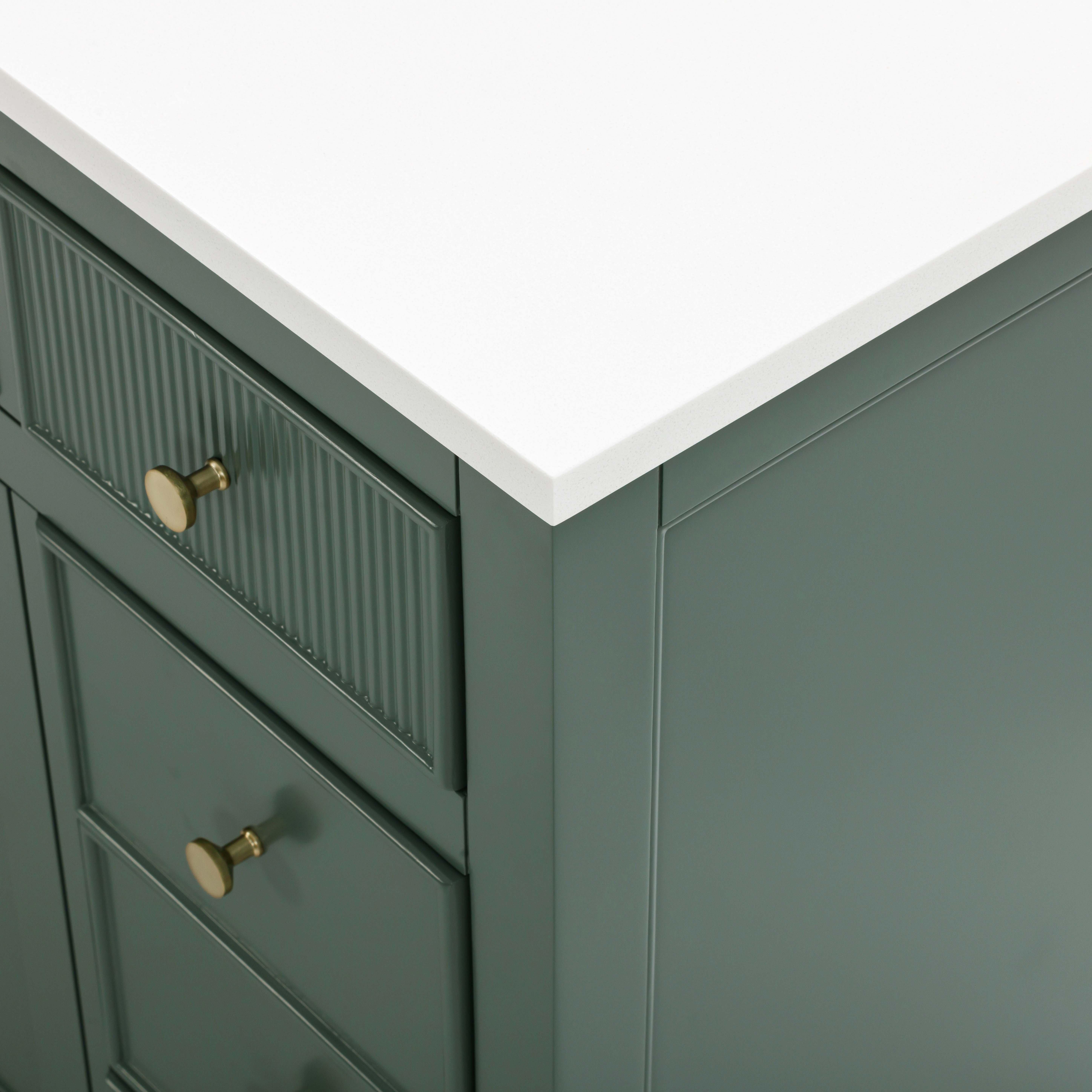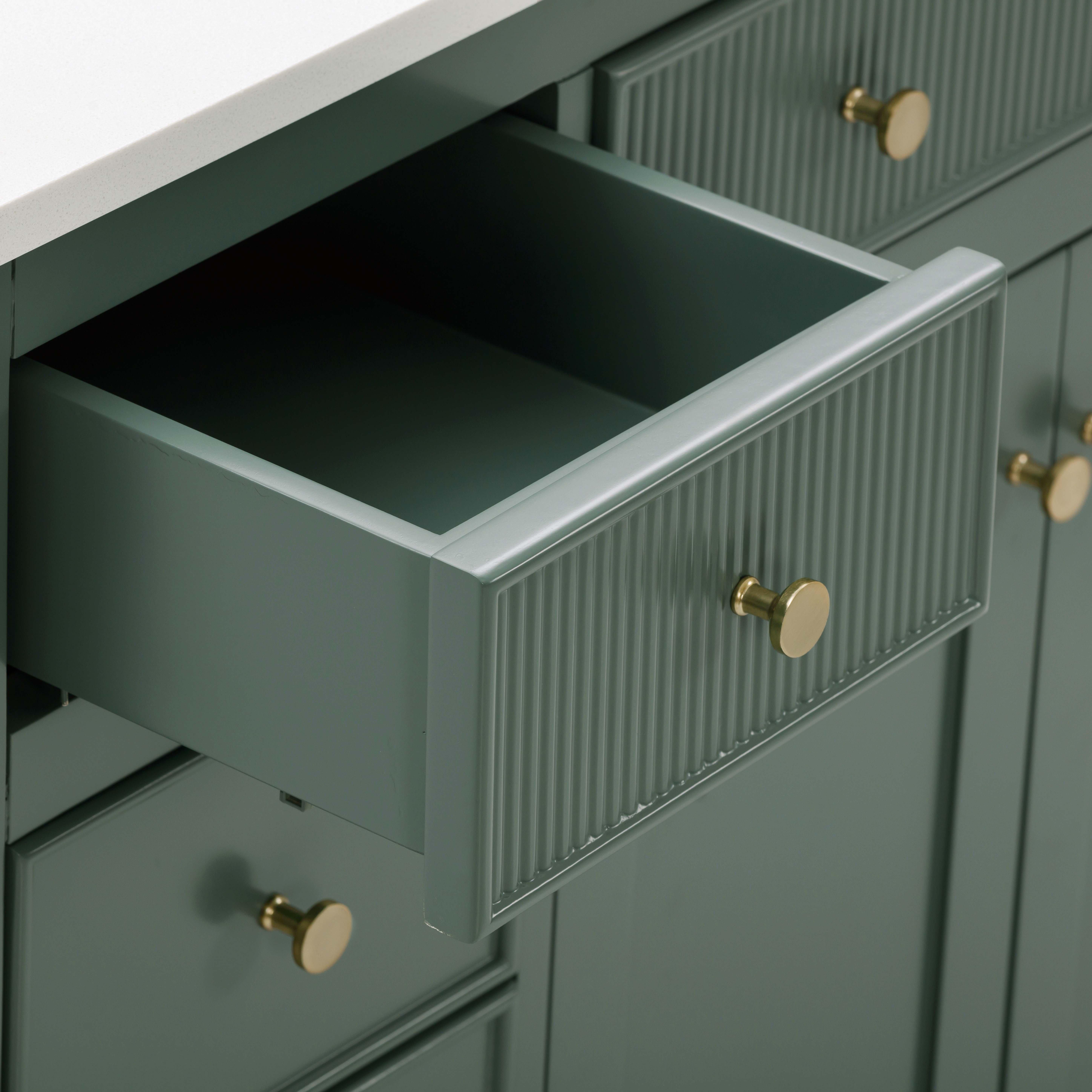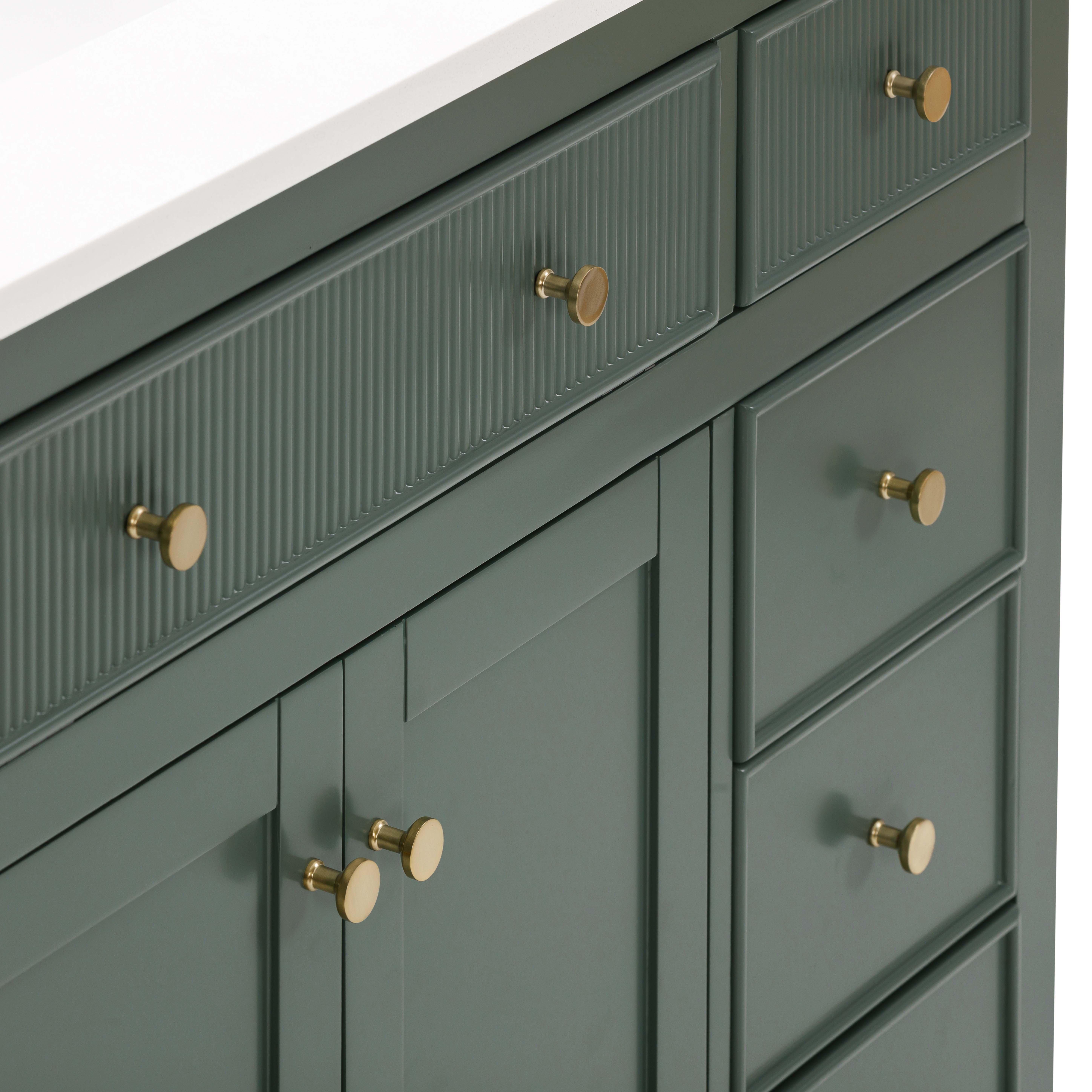 Tailor the look of your bathroom with the Dylan 49 in. Smoke Green Vanity with Quartz Top featuring gorgeous mdf in green with 2 doors, 9 drawers, and 1 shelves. This piece is completed with beautiful matte gold hardware and a single undermount white sink. The Dylan 49 in. Smoke Green Vanity with Quartz Top is a stunning addition to any bathroom setting.