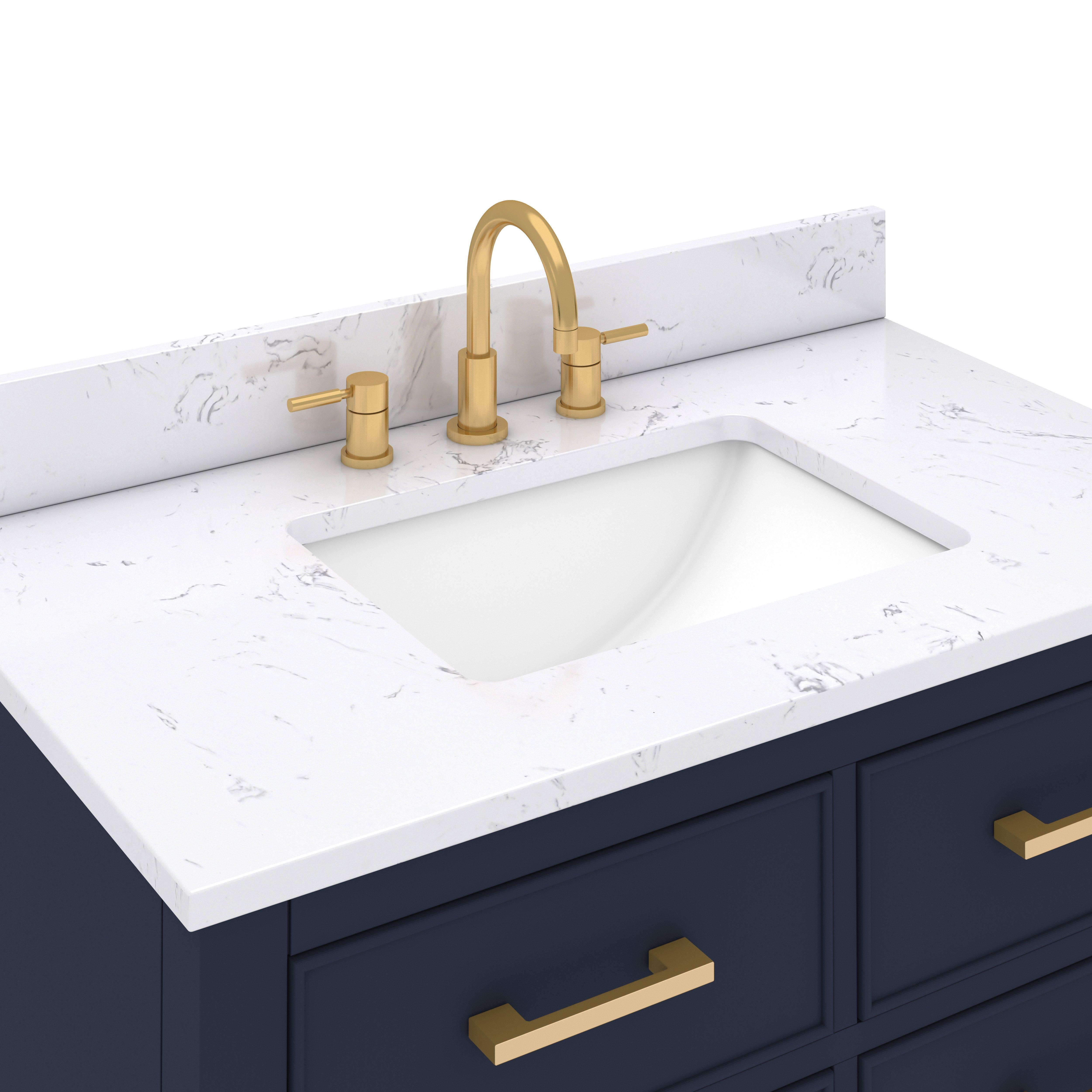 Tailor the look of your bathroom with the Hampton 37 in. Navy Blue Single Vanity with Engineered Top featuring gorgeous solid wood in blue with 0 doors, 4 drawers, and 1 shelves. This piece is completed with beautiful matte gold hardware and a single undermount white sink. The Hampton 37 in. Navy Blue Single Vanity with Engineered Top is a stunning addition to any bathroom setting.