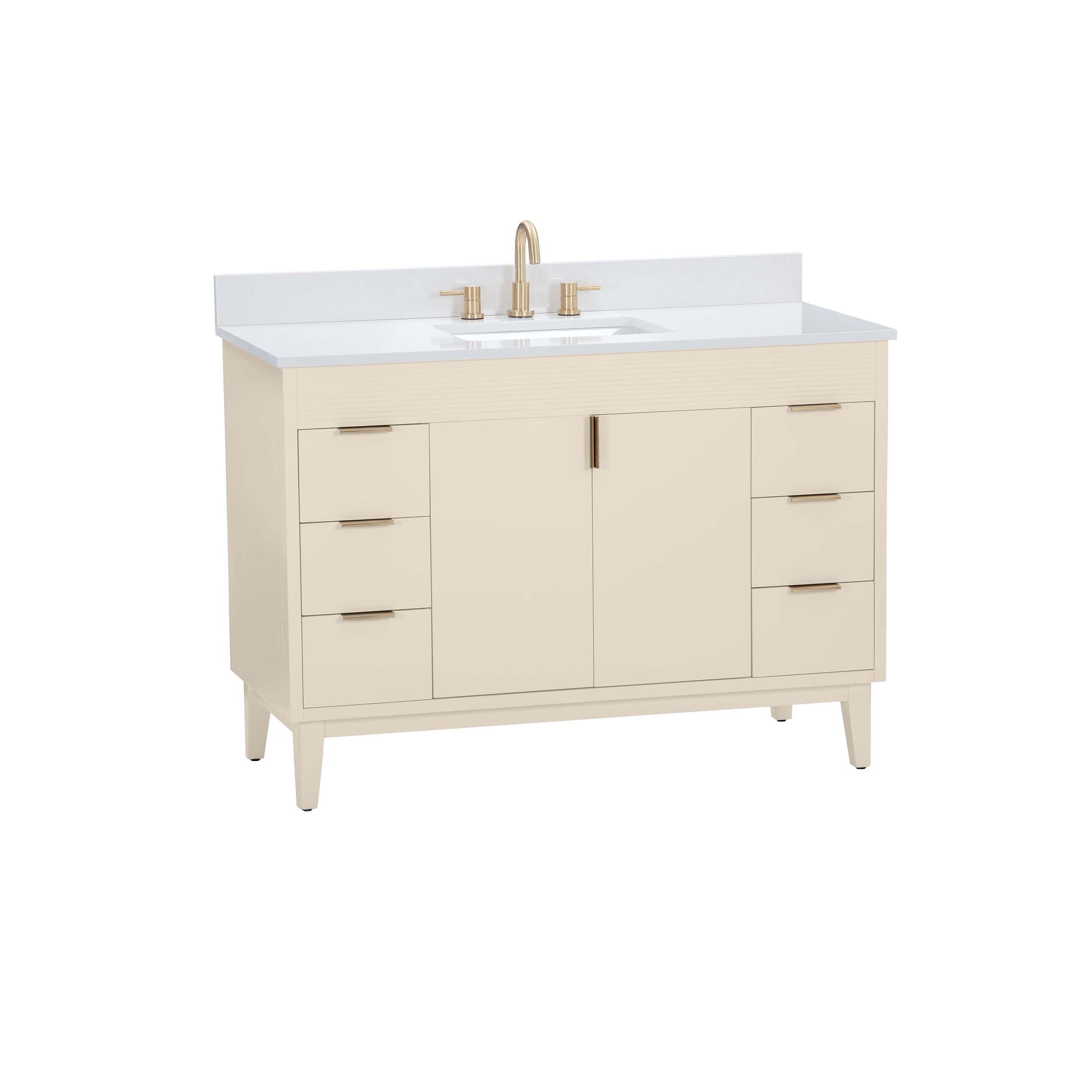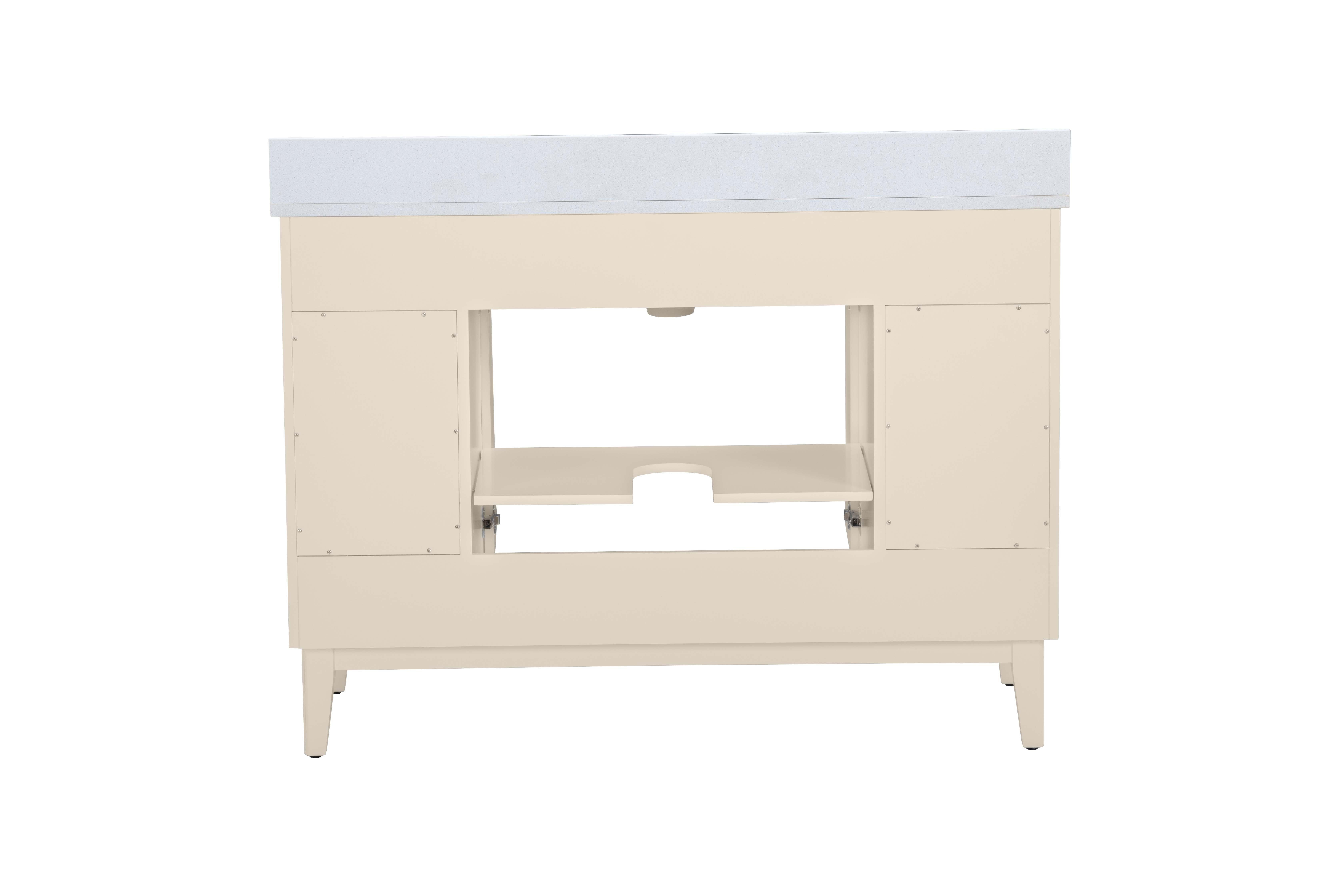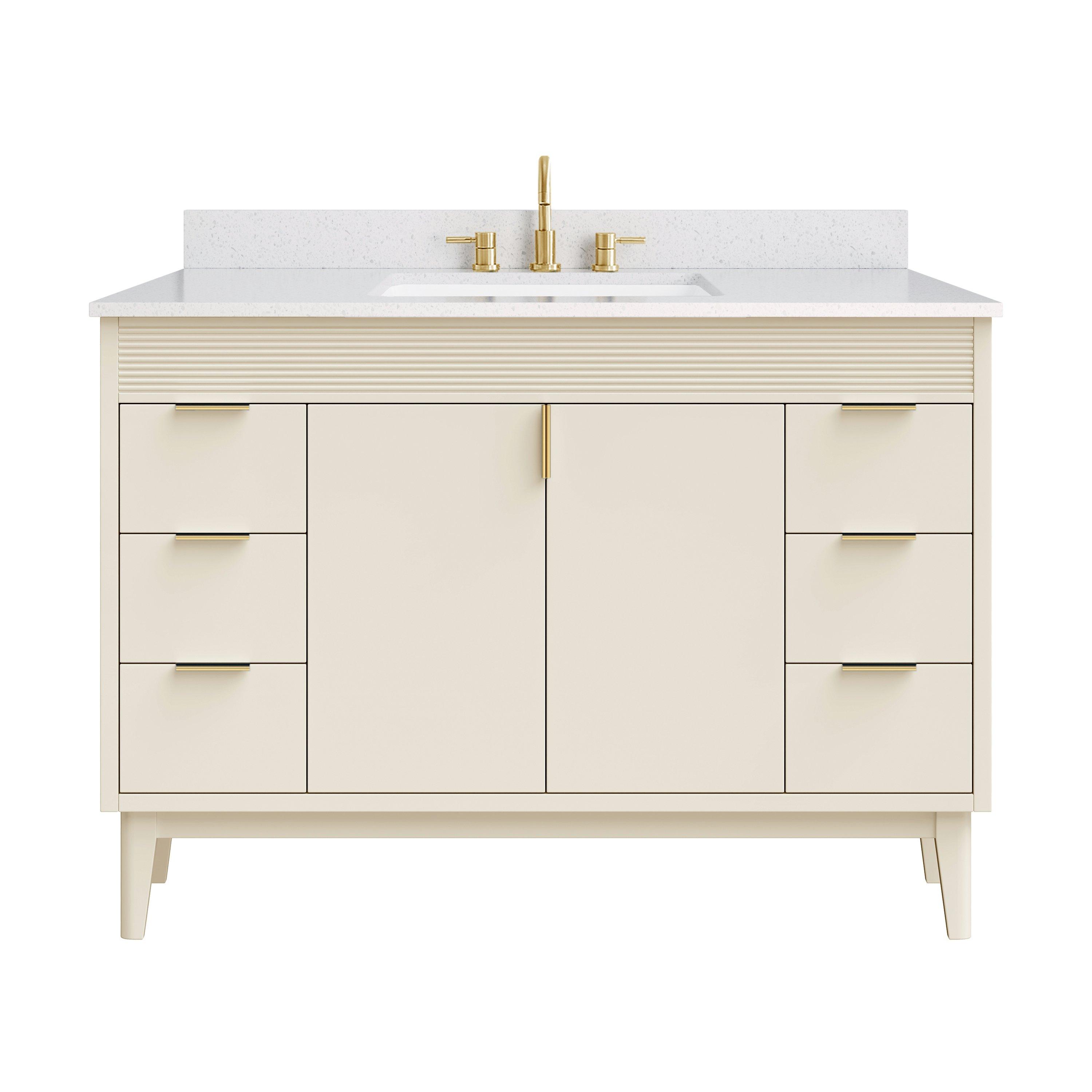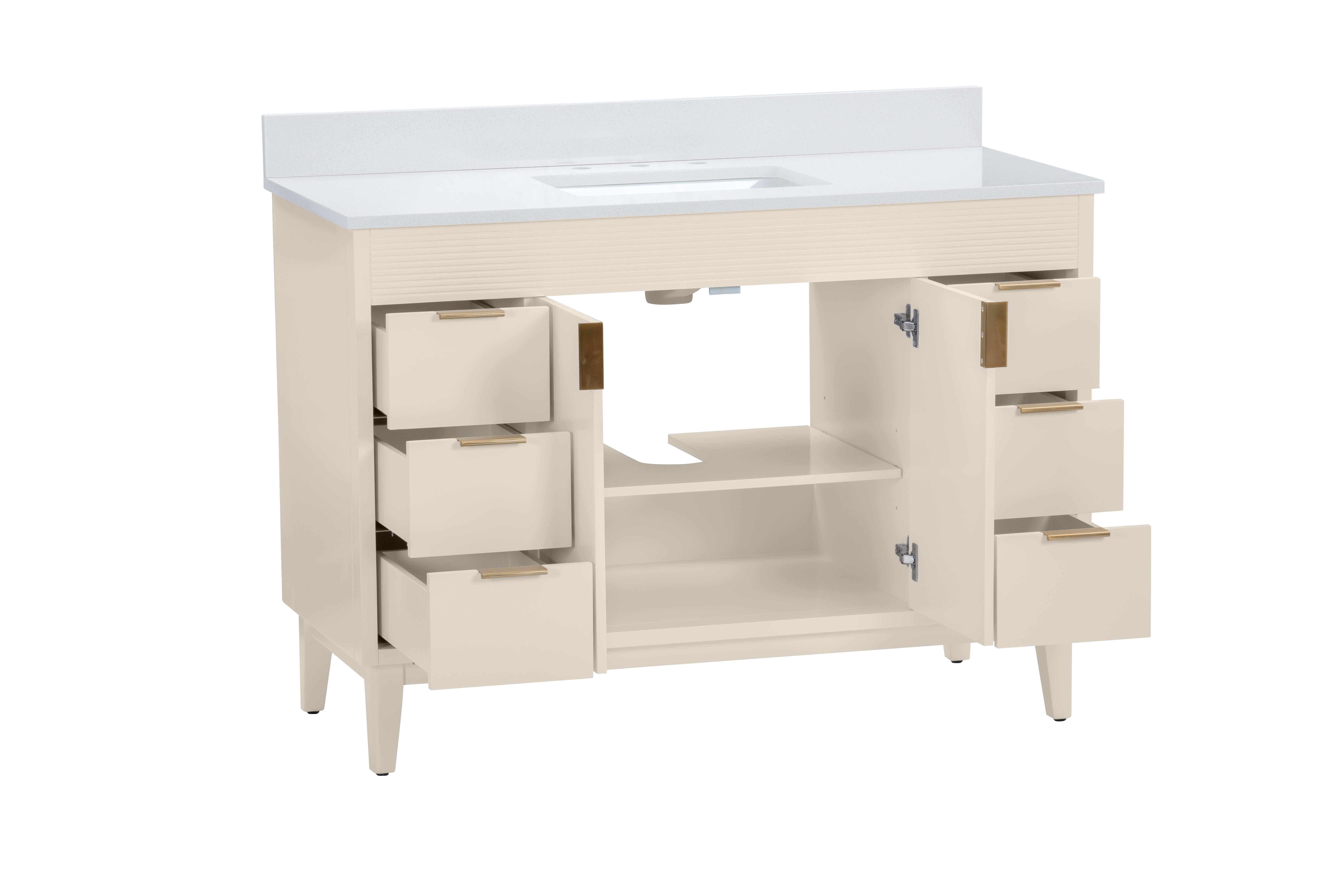 Complete your bathroom with the beautiful Julian 49 in. Off-White Vanity with Engineered Stone Top. This freestanding features durable mdf cabinets in stunning off white with a white engineered stone vanity top and matte gold hardware. A charming single undermount sink in brilliant white is included. The Julian 49 in. Off-White Vanity with Engineered Stone Top is a versatile choice to customize multiple bathroom settings.