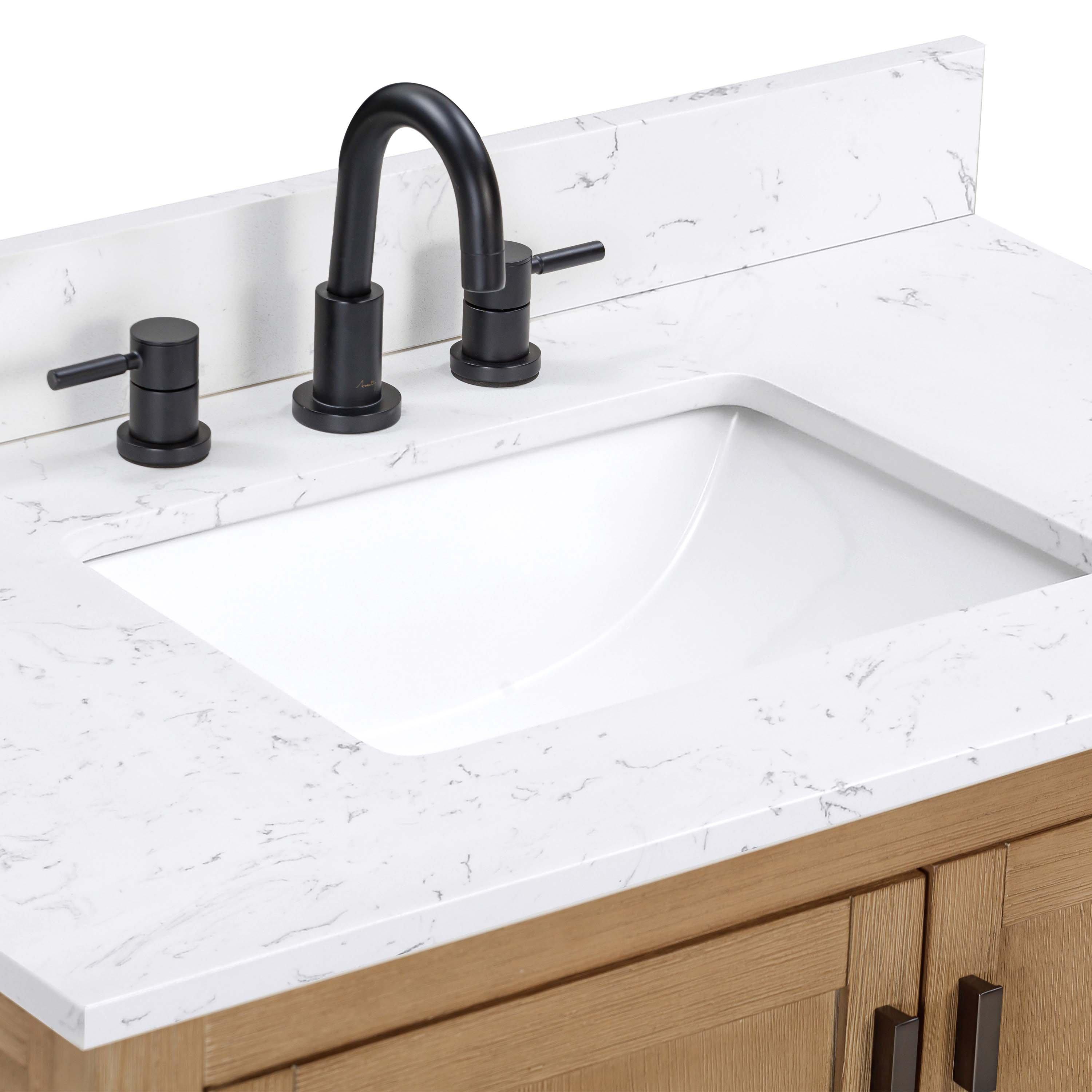 Complete your bathroom with the beautiful Kent 37 in. Natural Oak Vanity with Calacatta Engineered Top. This freestanding features durable solid wood, mdf cabinets in stunning natural with a white engineered stone vanity top and matte black bronze hardware. A charming single undermount sink in brilliant white is included. The Kent 37 in. Natural Oak Vanity with Calacatta Engineered Top is a versatile choice to customize multiple bathroom settings.