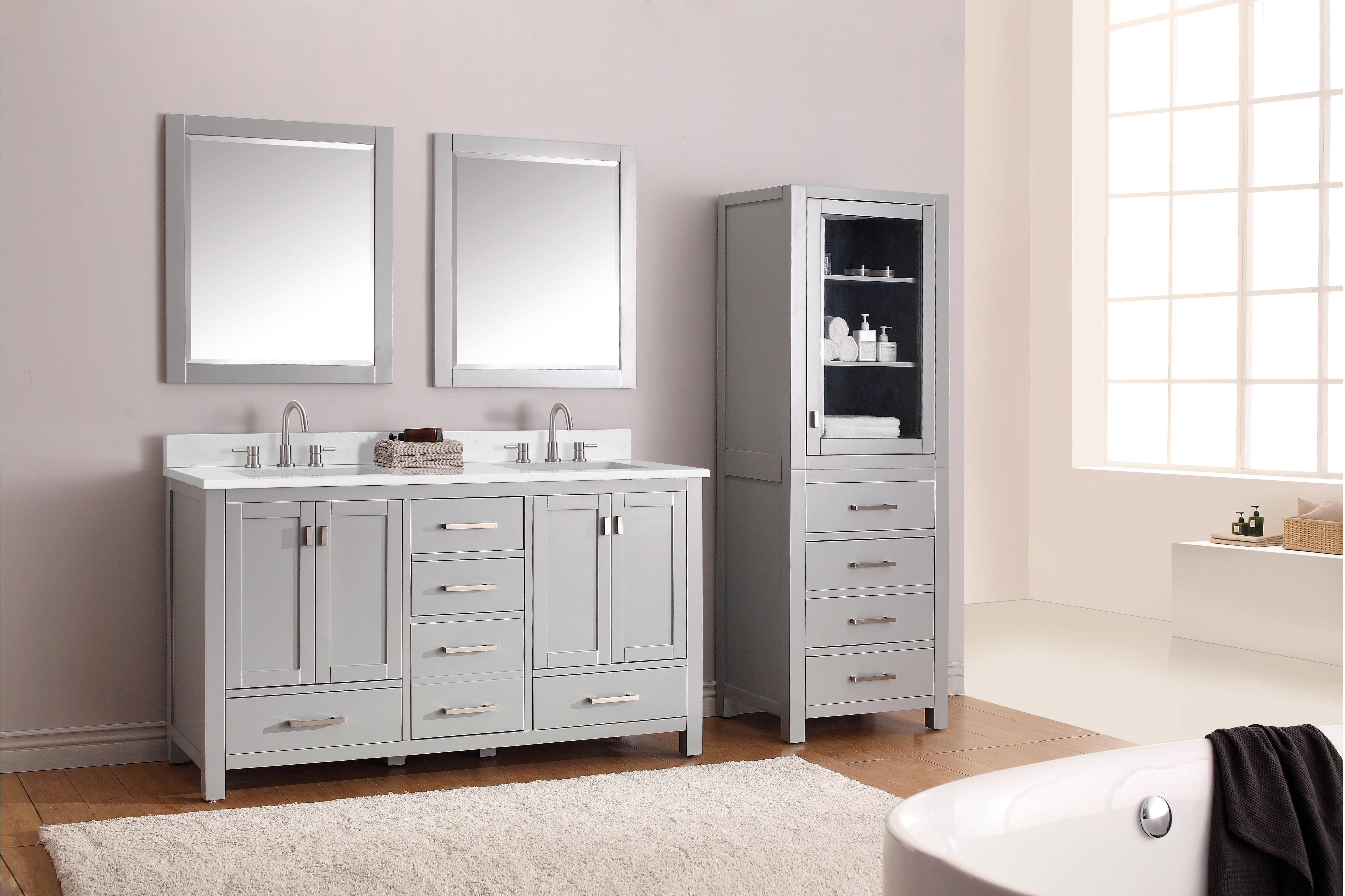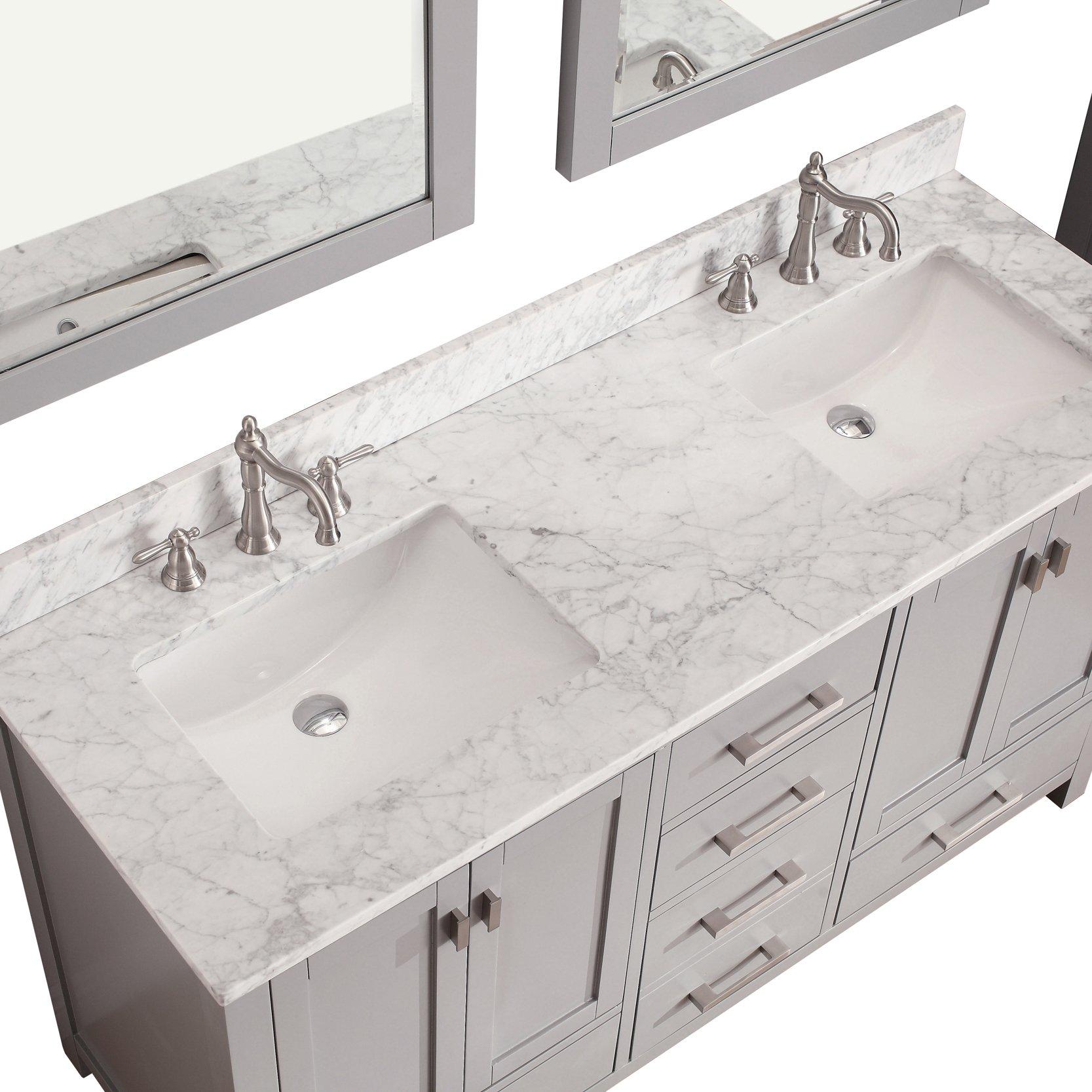 1 Year LimitedComplete your bathroom with the beautiful Kent 61 in. Chilled Gray Double Vanity with Engineered Cararra Top. This freestanding features durable solid wood cabinets in stunning gray with a white manufactured stone vanity top and brushed nickel hardware. A charming double undermount sink in brilliant white is included. The Kent 61 in. Chilled Gray Double Vanity with Engineered Cararra Top is a versatile choice to customize multiple bathroom settings.