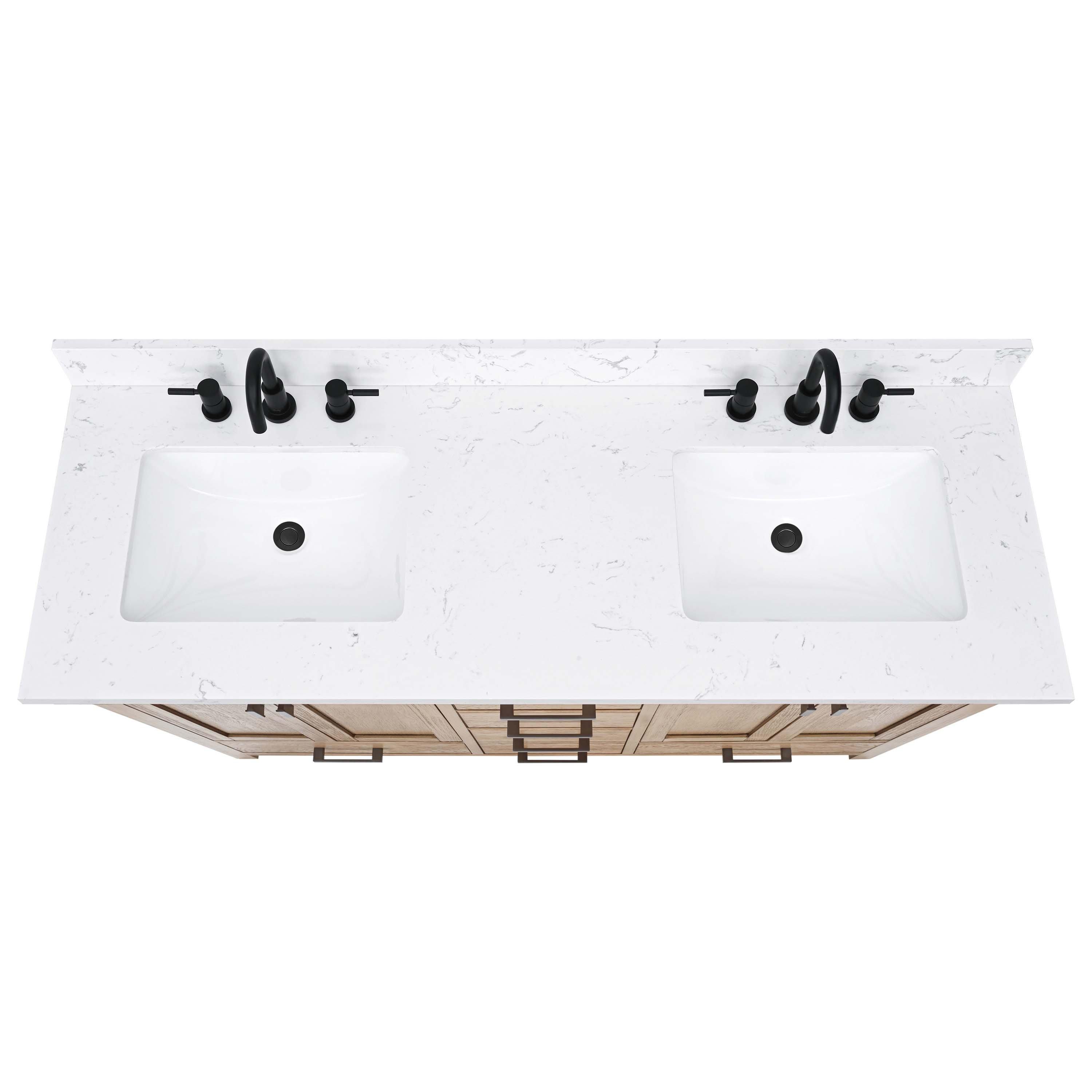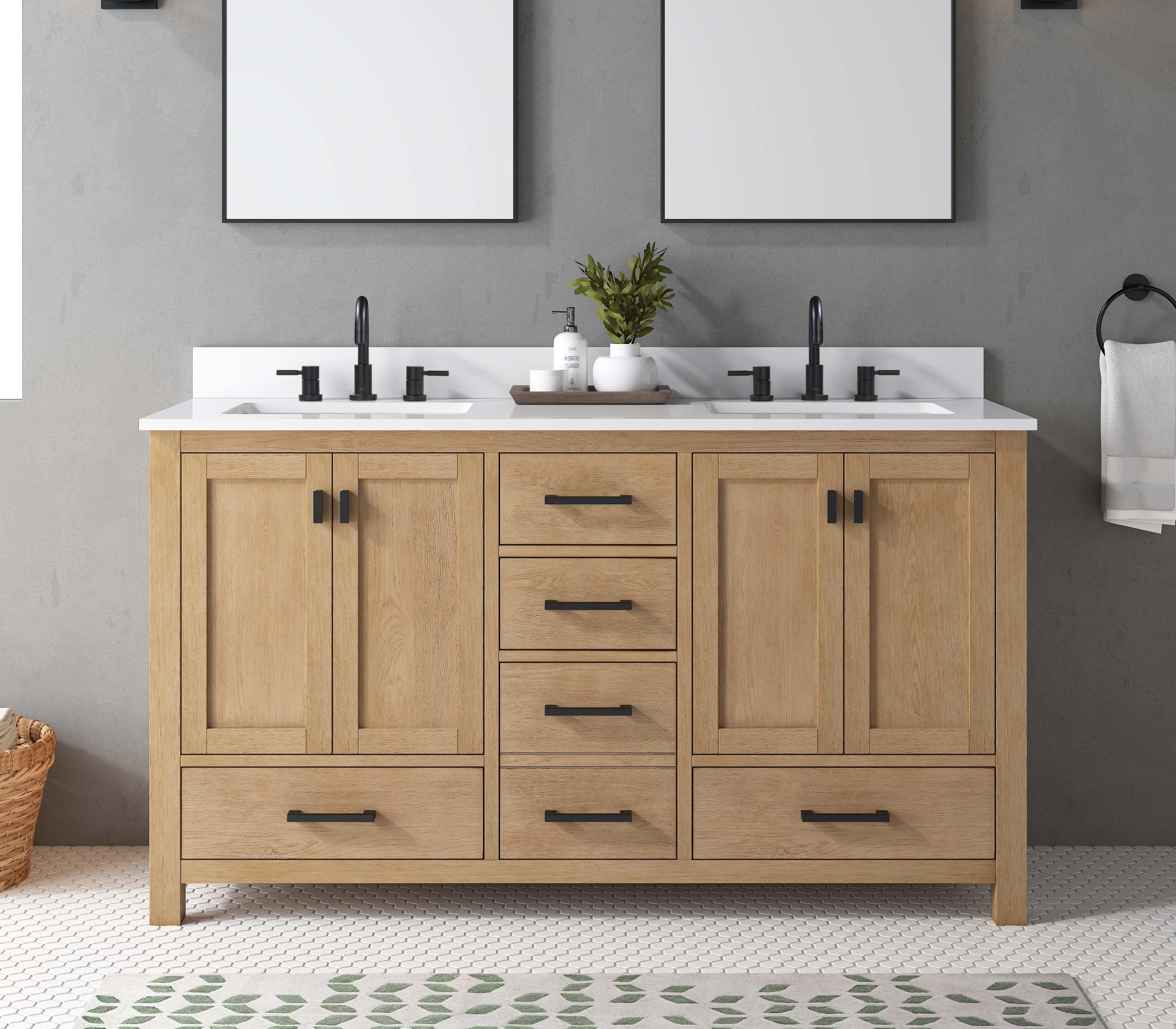 Complete your bathroom with the beautiful Kent 61 in. Natural Oak Vanity with Calacatta Engineered Top. This freestanding features durable solid wood, mdf cabinets in stunning natural with a white engineered stone vanity top and matte black bronze hardware. A charming double undermount sink in brilliant white is included. The Kent 61 in. Natural Oak Vanity with Calacatta Engineered Top is a versatile choice to customize multiple bathroom settings.