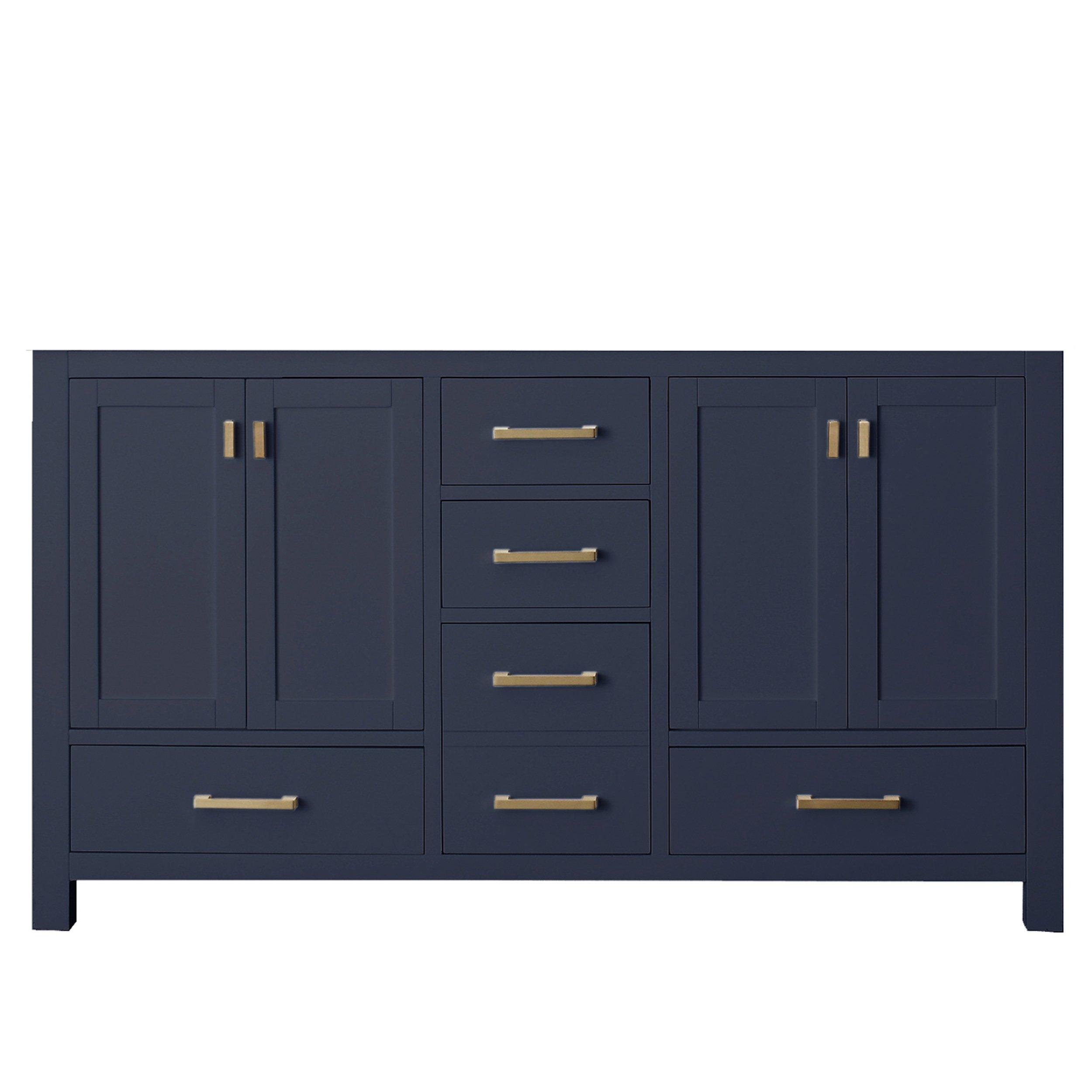 Tailor the look of your bathroom with the Kent 60 in. Navy Blue Double Vanity Base featuring gorgeous solid wood in blue with 4 doors, 5 drawers, and 0 shelves. This piece is completed with beautiful matte gold hardware. The Kent 60 in. Navy Blue Double Vanity Base is a stunning addition to any bathroom setting.