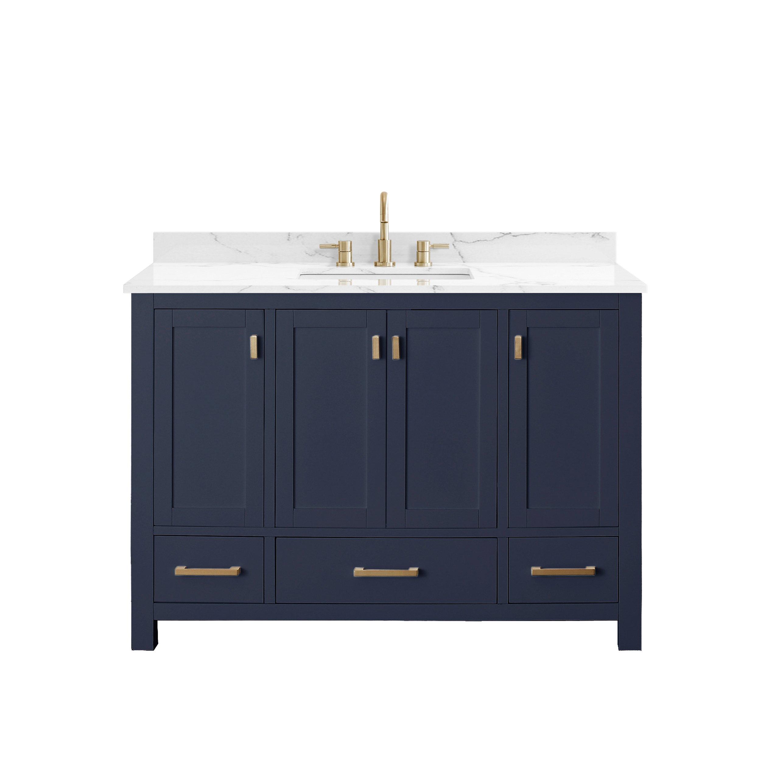 1 Year LimitedComplete your bathroom with the beautiful Kent 49 in. Blue Single Vanity with Engineered Cararra Top. This freestanding features durable solid wood cabinets in stunning blue with a white manufactured stone vanity top and matte gold hardware. A charming single undermount sink in brilliant white is included. The Kent 49 in. Blue Single Vanity with Engineered Cararra Top is a versatile choice to customize multiple bathroom settings.