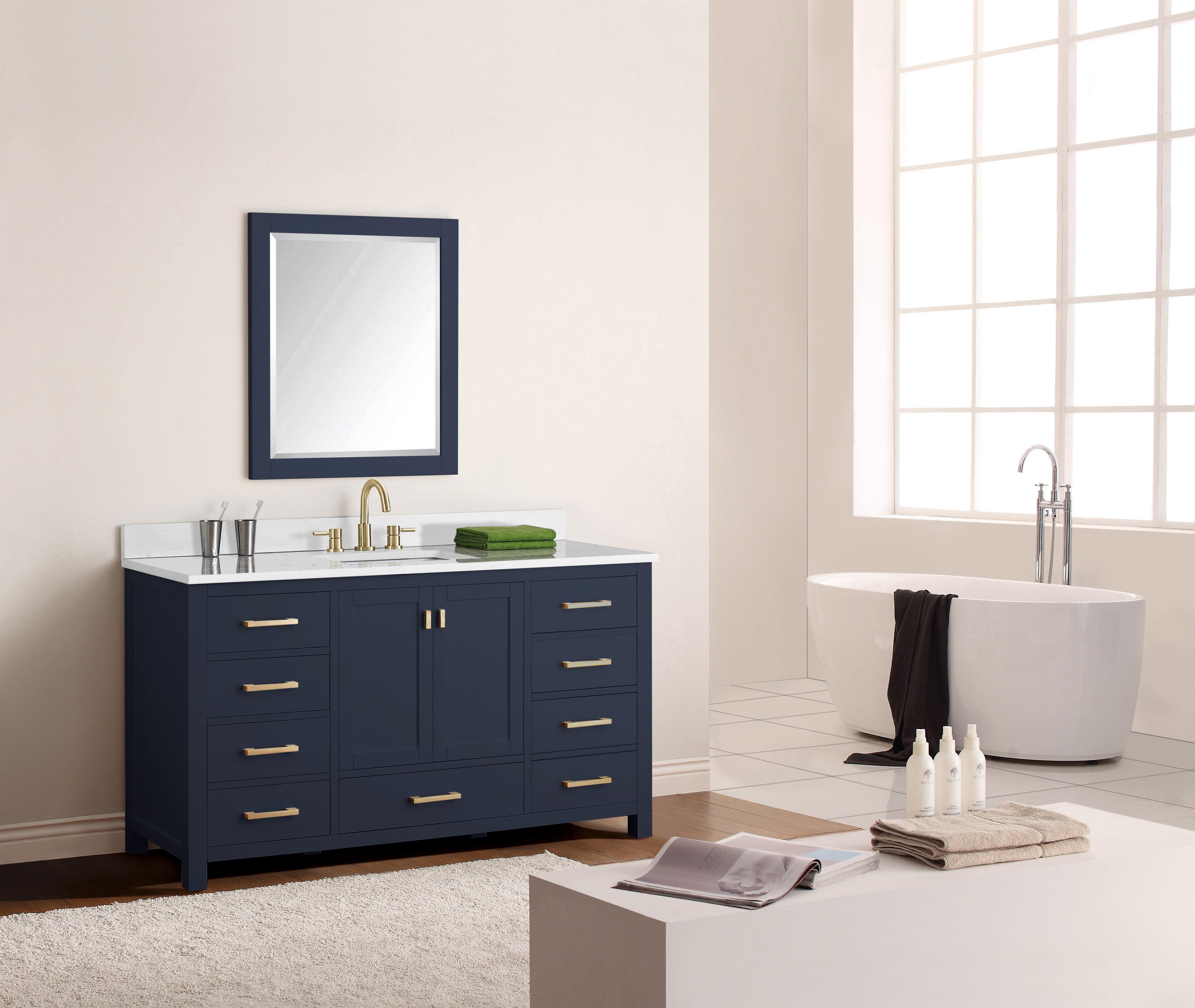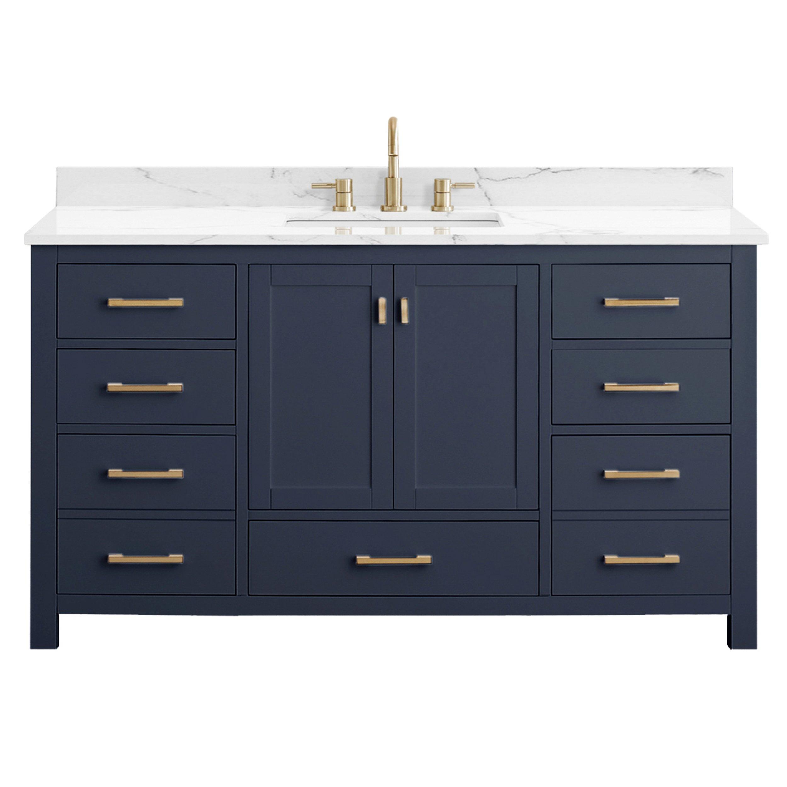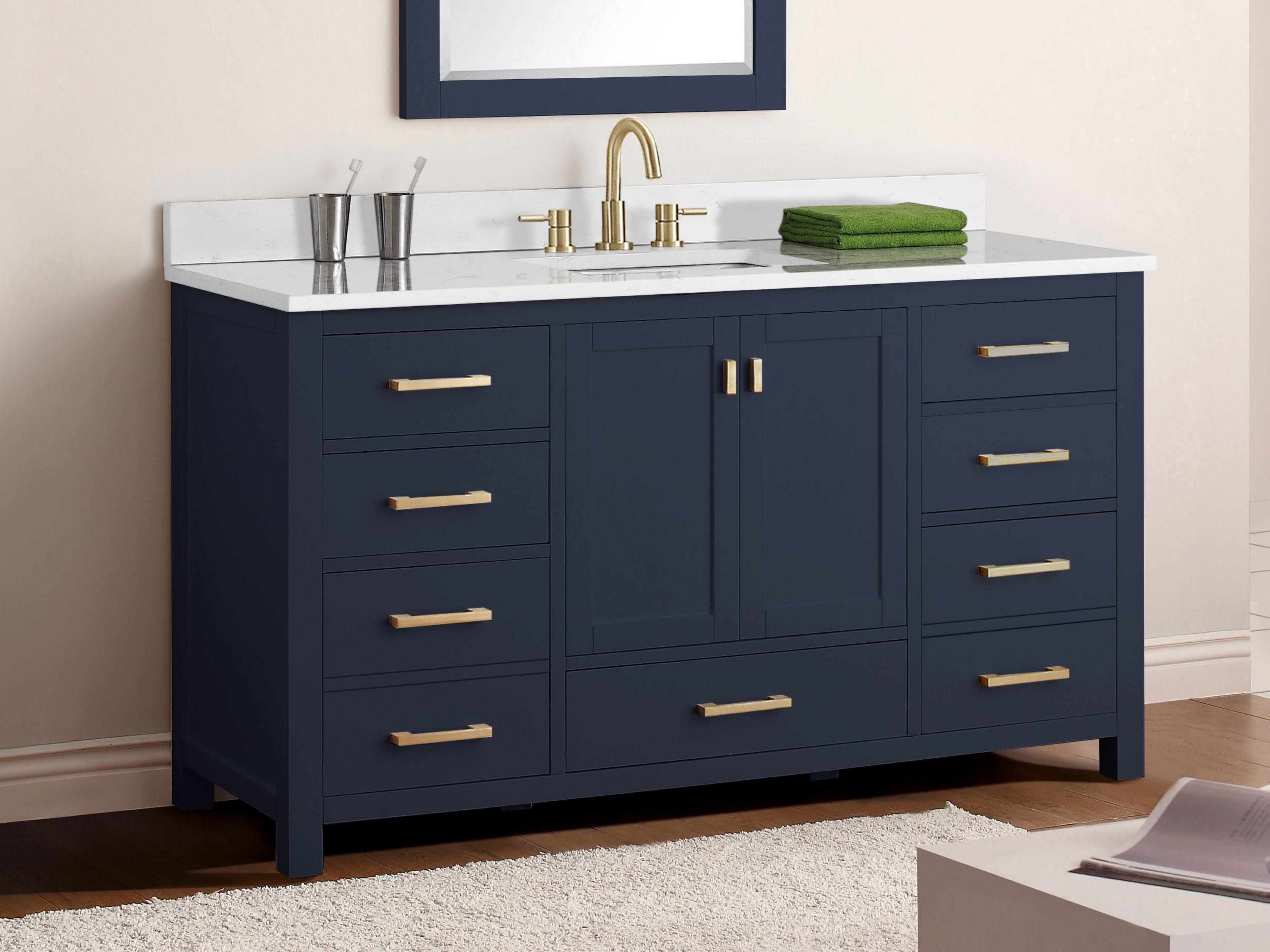 1 Year LimitedTailor the look of your bathroom with the Kent 61 in. Blue Single Vanity with Engineered Cararra Top featuring gorgeous solid wood in blue with 2 doors, 7 drawers, and 0 shelves. This piece is completed with beautiful matte gold hardware and a single undermount white sink. The Kent 61 in. Blue Single Vanity with Engineered Cararra Top is a stunning addition to any bathroom setting.