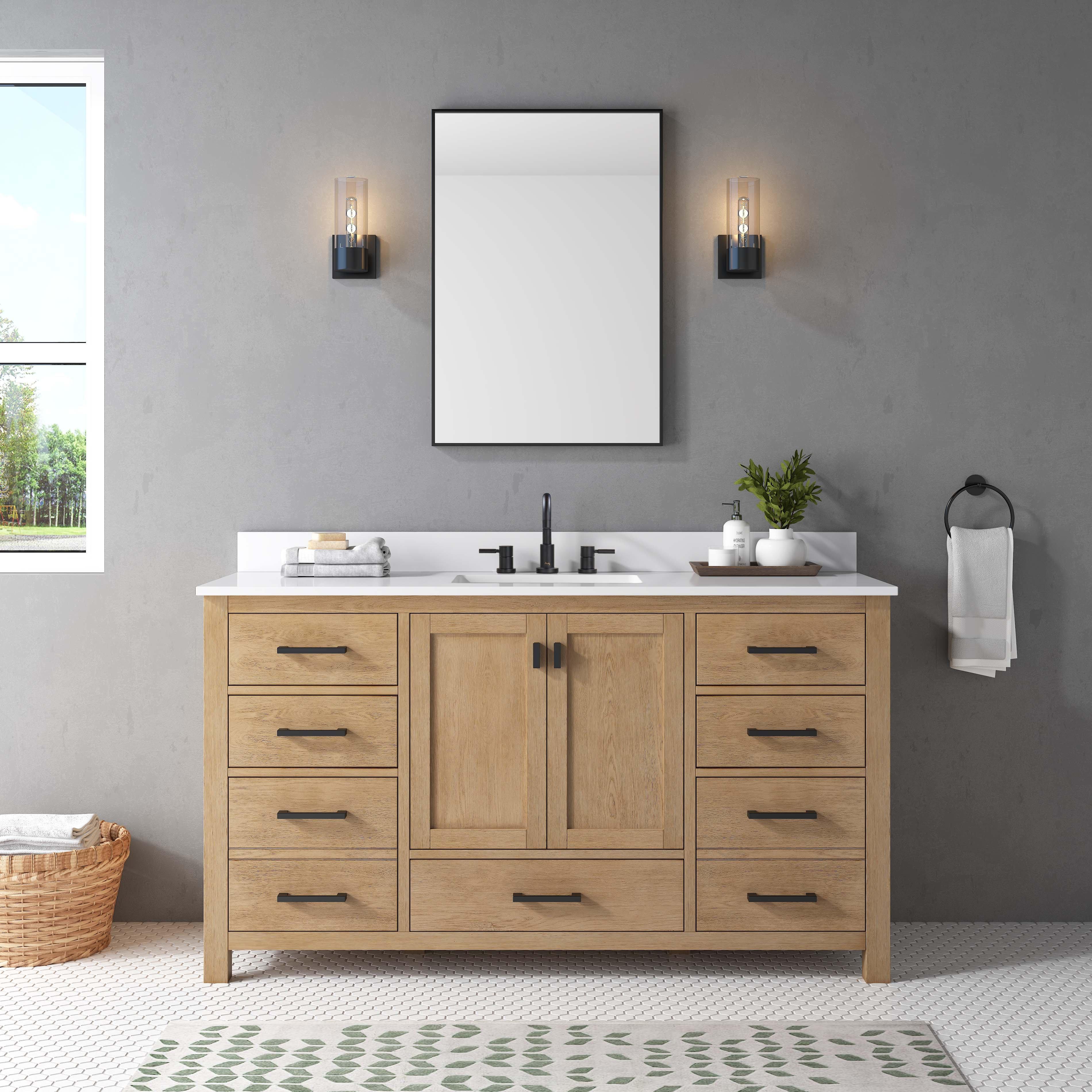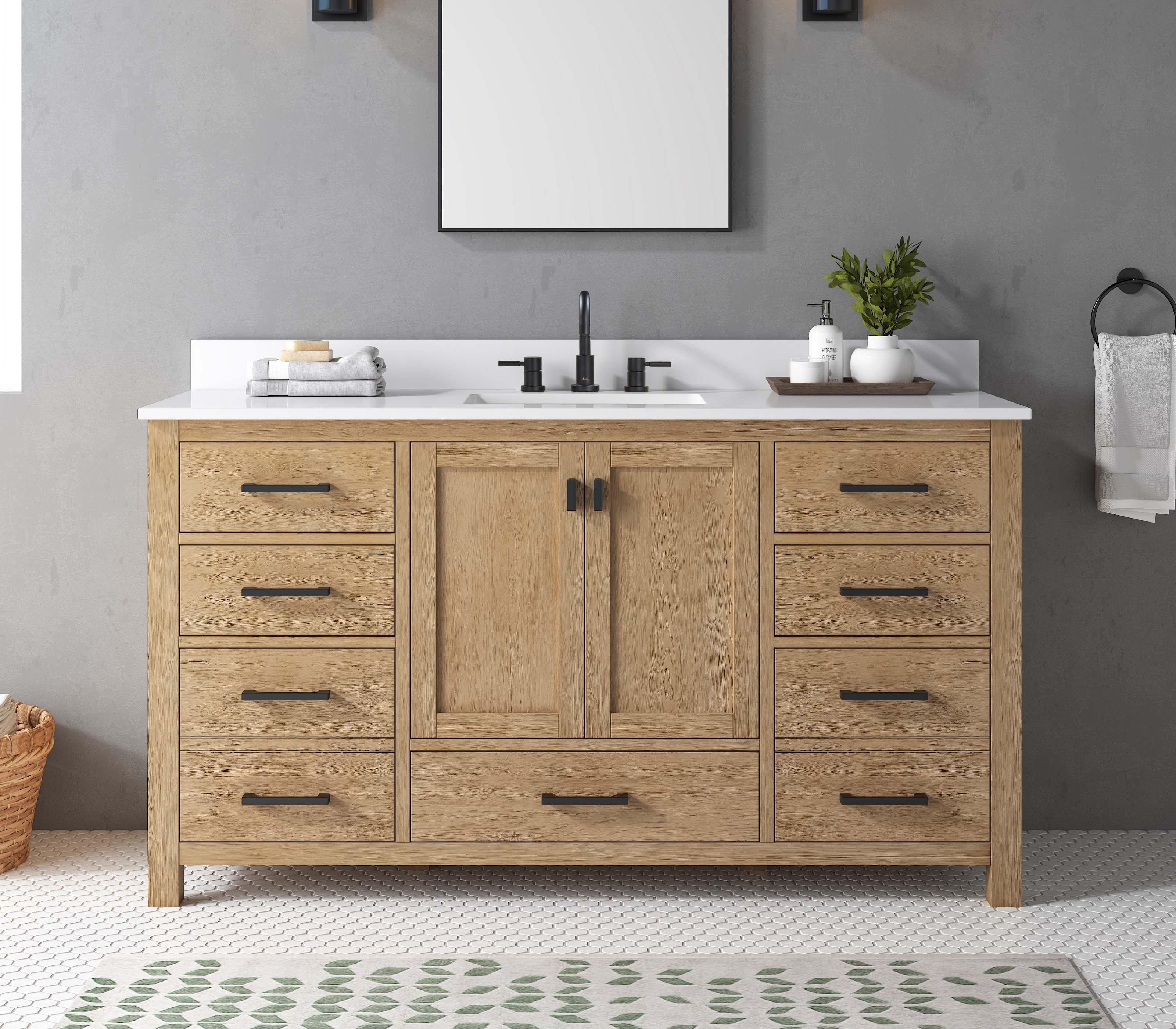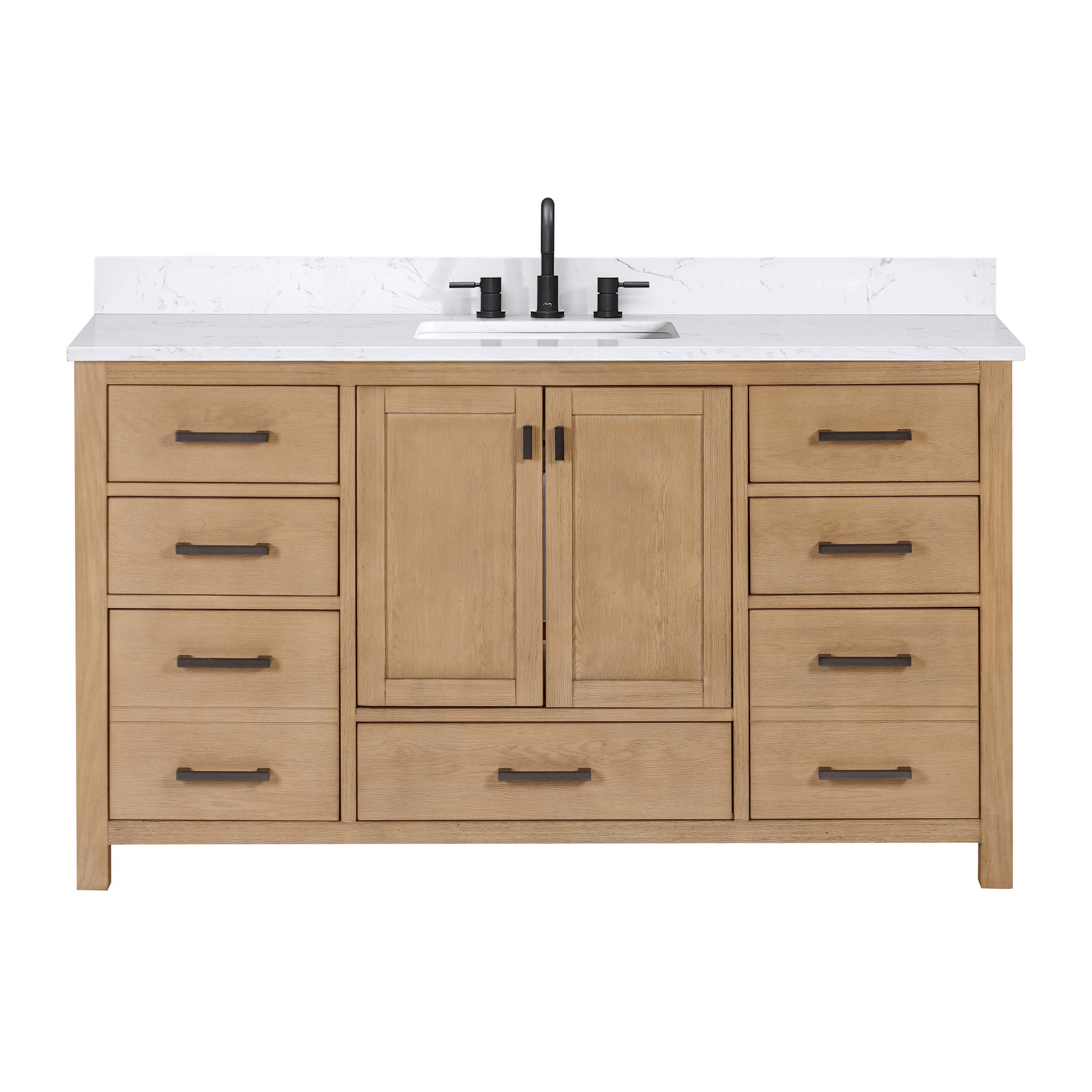 Tailor the look of your bathroom with the Kent 61 in. Natural Oak Vanity with Calacatta Engineered Top featuring gorgeous solid wood, mdf in natural with 2 doors, 7 drawers, and 0 shelves. This piece is completed with beautiful matte black bronze hardware and a single undermount white sink. The Kent 61 in. Natural Oak Vanity with Calacatta Engineered Top is a stunning addition to any bathroom setting.