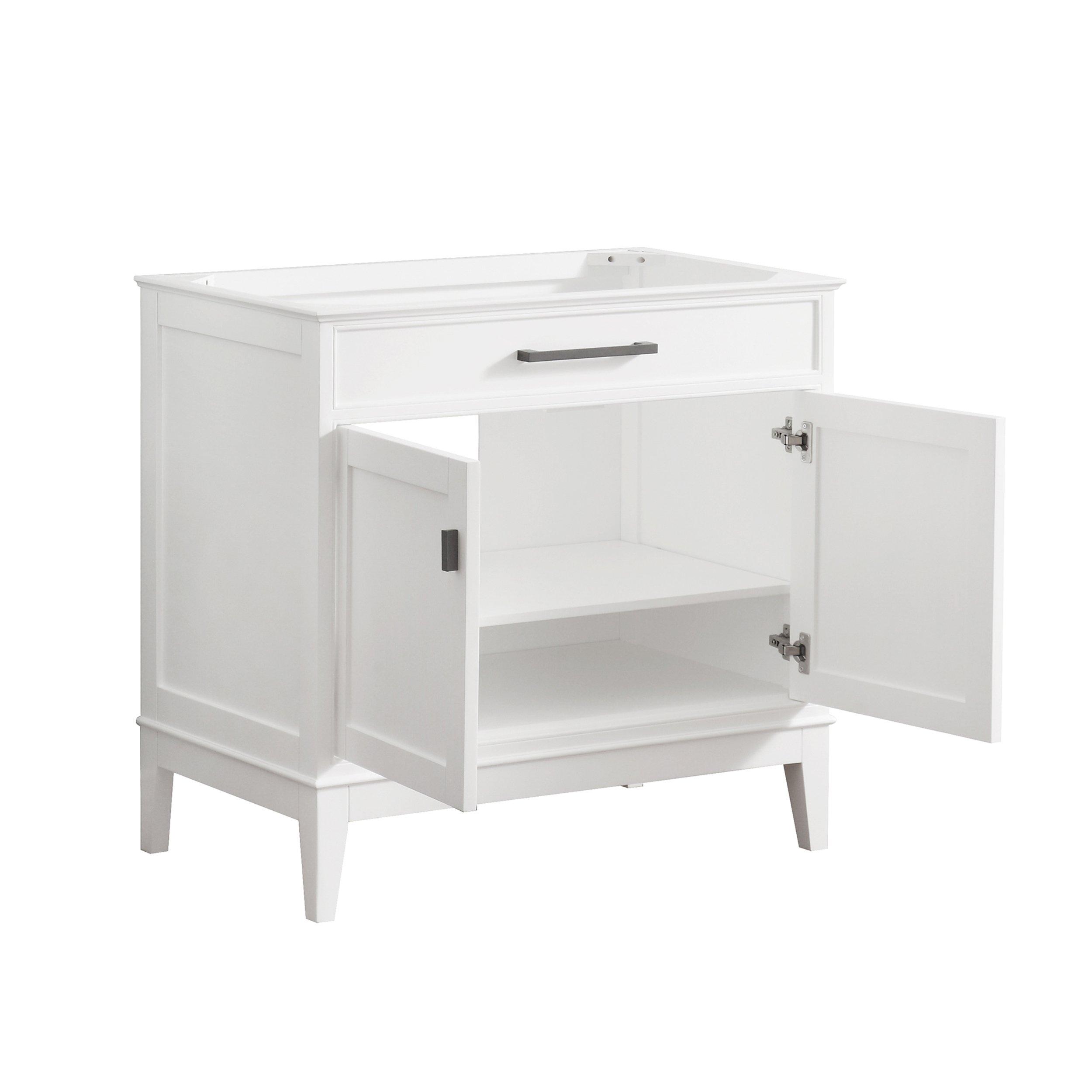 Complete your bathroom with the beautiful Landon 36 in. White Single Vanity Base. This freestanding features durable solid wood cabinets in stunning white with brushed black bronze hardware. The Landon 36 in. White Single Vanity Base is a versatile choice to customize multiple bathroom settings.