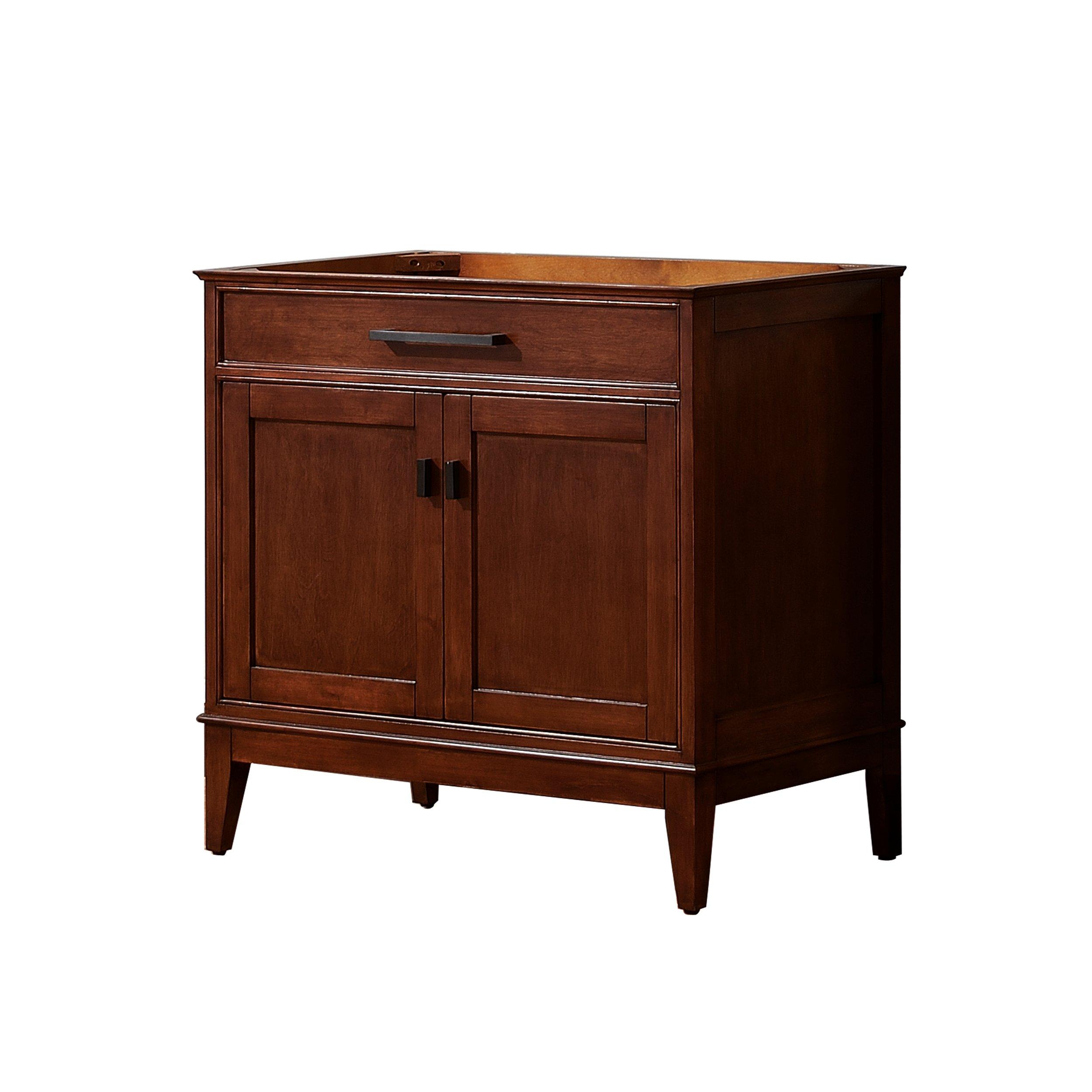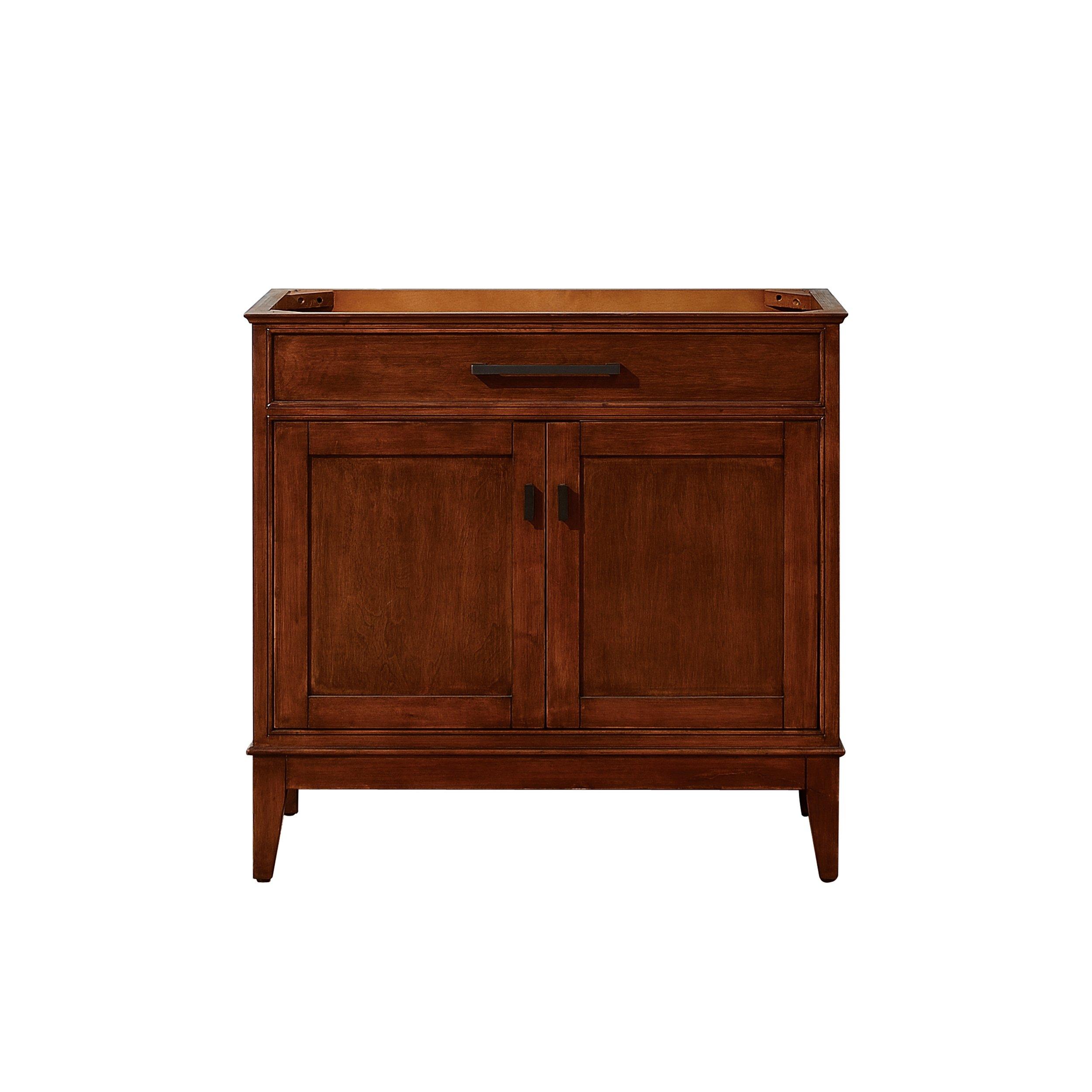 Tailor the look of your bathroom with the Landon 36 in. Tobacco Single Vanity Base featuring gorgeous solid wood in brown with 2 doors, 0 drawers, and 1 shelves. This piece is completed with beautiful matte black hardware. The Landon 36 in. Tobacco Single Vanity Base is a stunning addition to any bathroom setting.