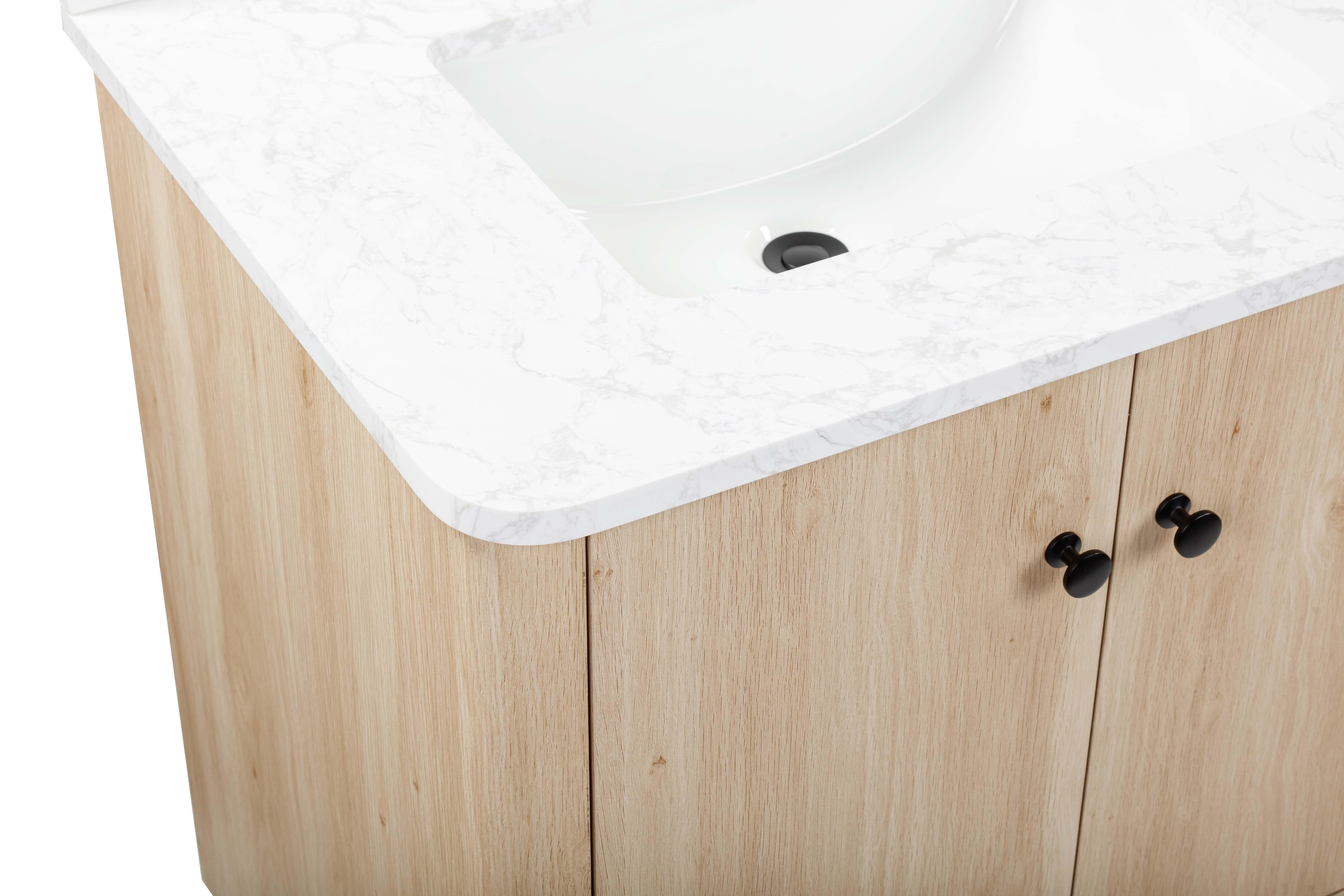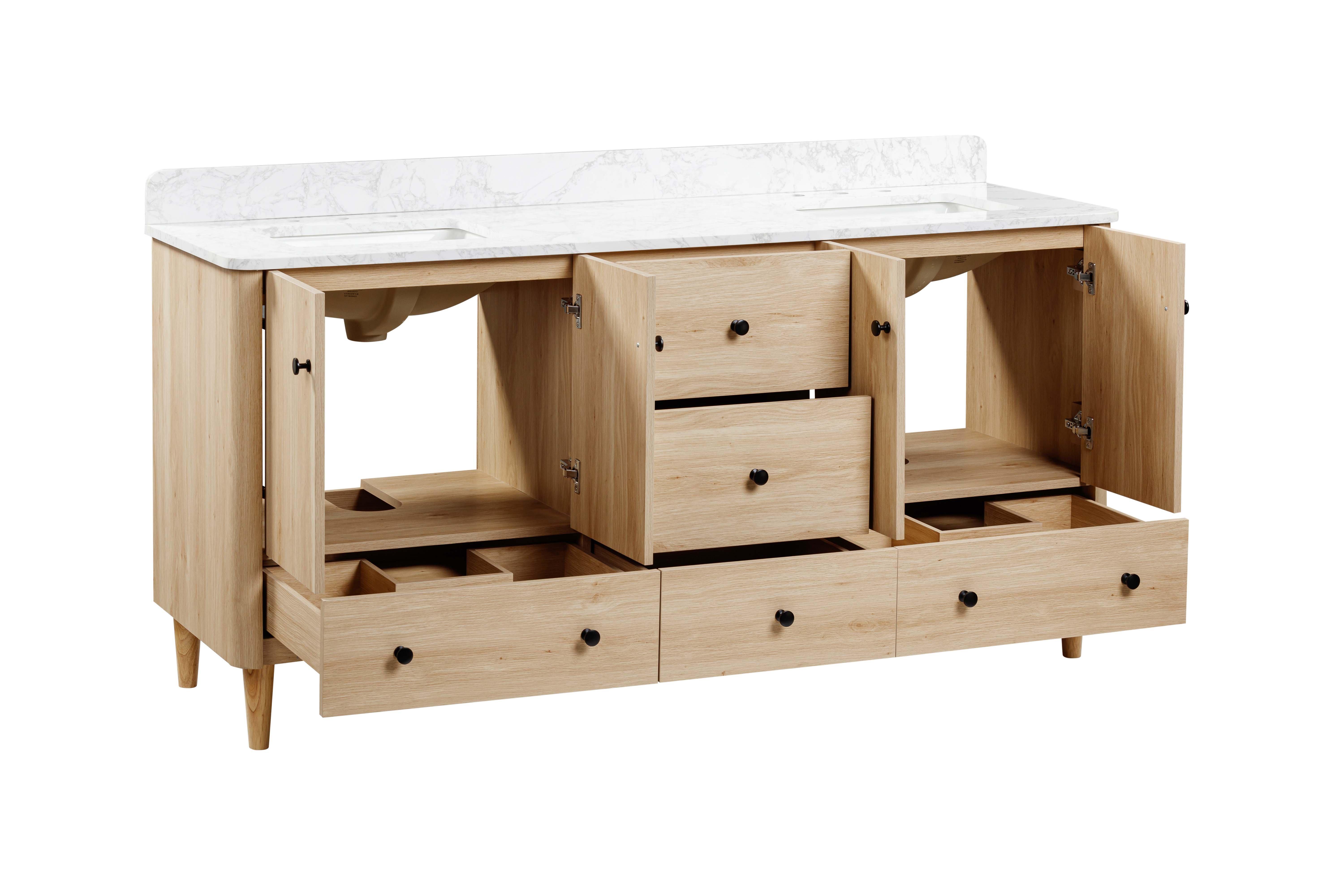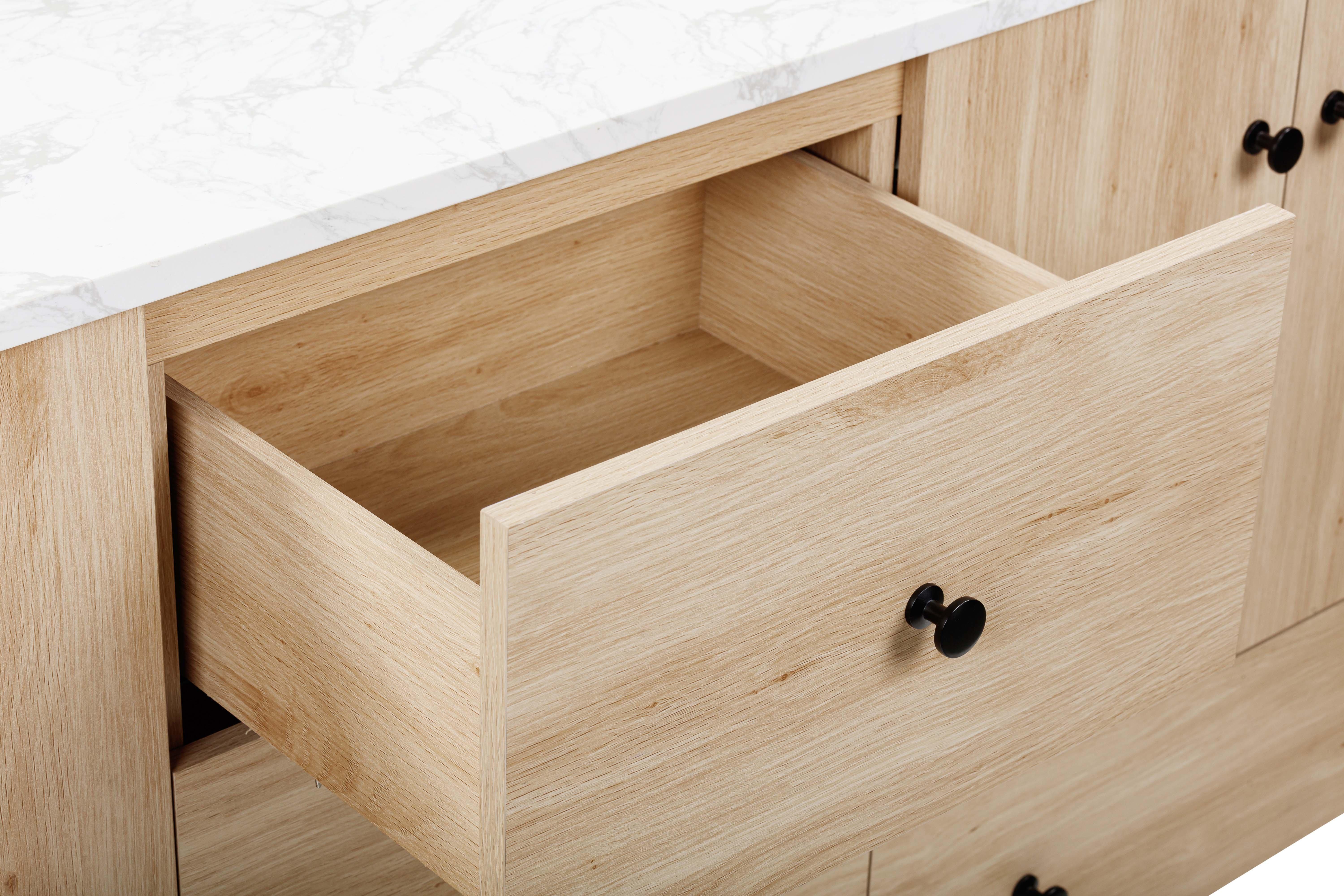 Complete your bathroom with the beautiful Leyah 73 in. Oak Finish Vanity with Engineered Stone Top. This freestanding features durable solid wood, mdf cabinets in stunning natural with a white engineered stone vanity top and matte black hardware. A charming double undermount sink in brilliant white is included. The Leyah 73 in. Oak Finish Vanity with Engineered Stone Top is a versatile choice to customize multiple bathroom settings.