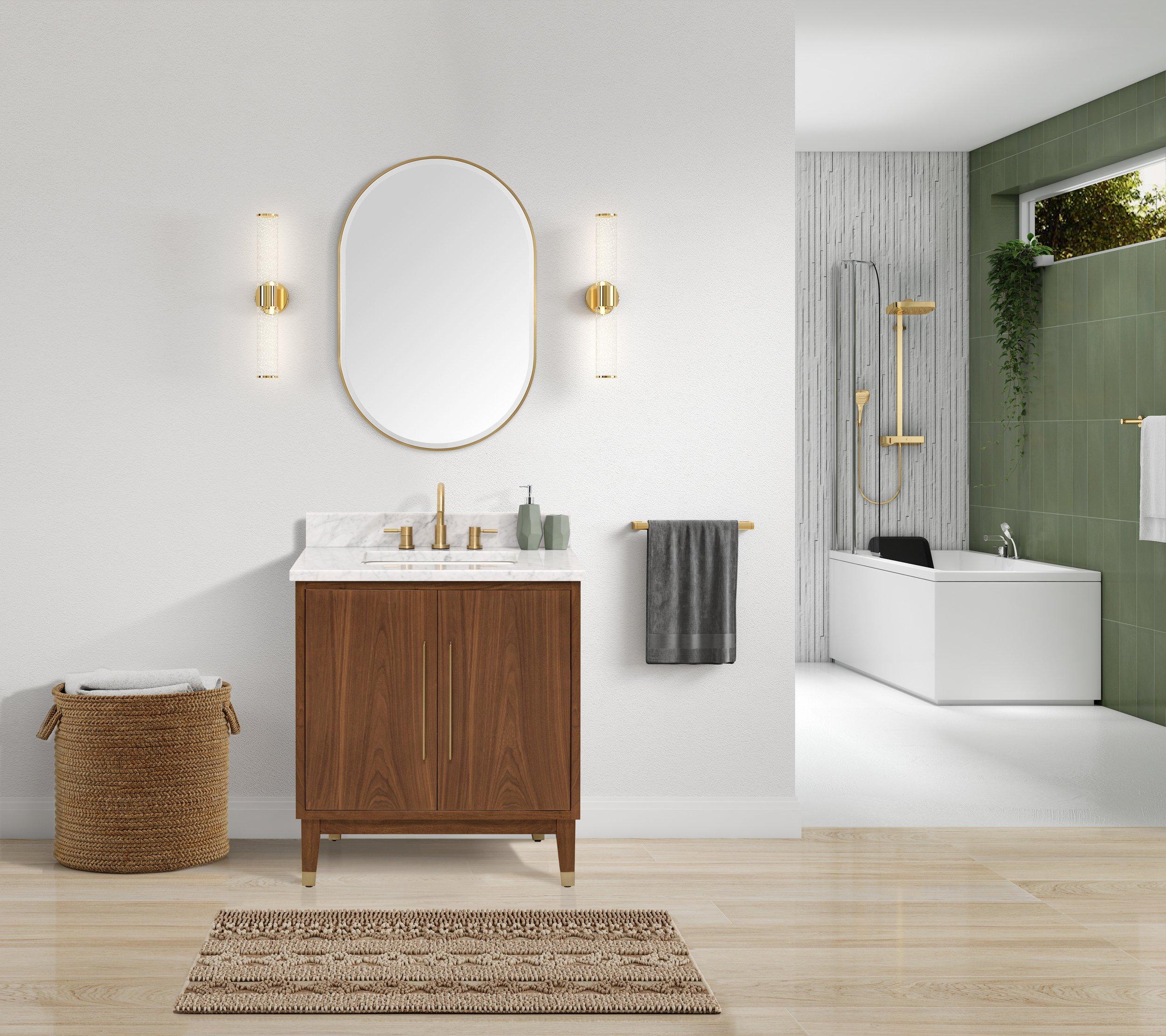 Tailor the look of your bathroom with the Mina 31 in. Walnut Vanity with Carrara Marble Top featuring gorgeous multiple in brown with 2 doors, 1 drawers, and 0 shelves. This piece is completed with beautiful matte gold hardware and a single integral white sink. The Mina 31 in. Walnut Vanity with Carrara Marble Top is a stunning addition to any bathroom setting.