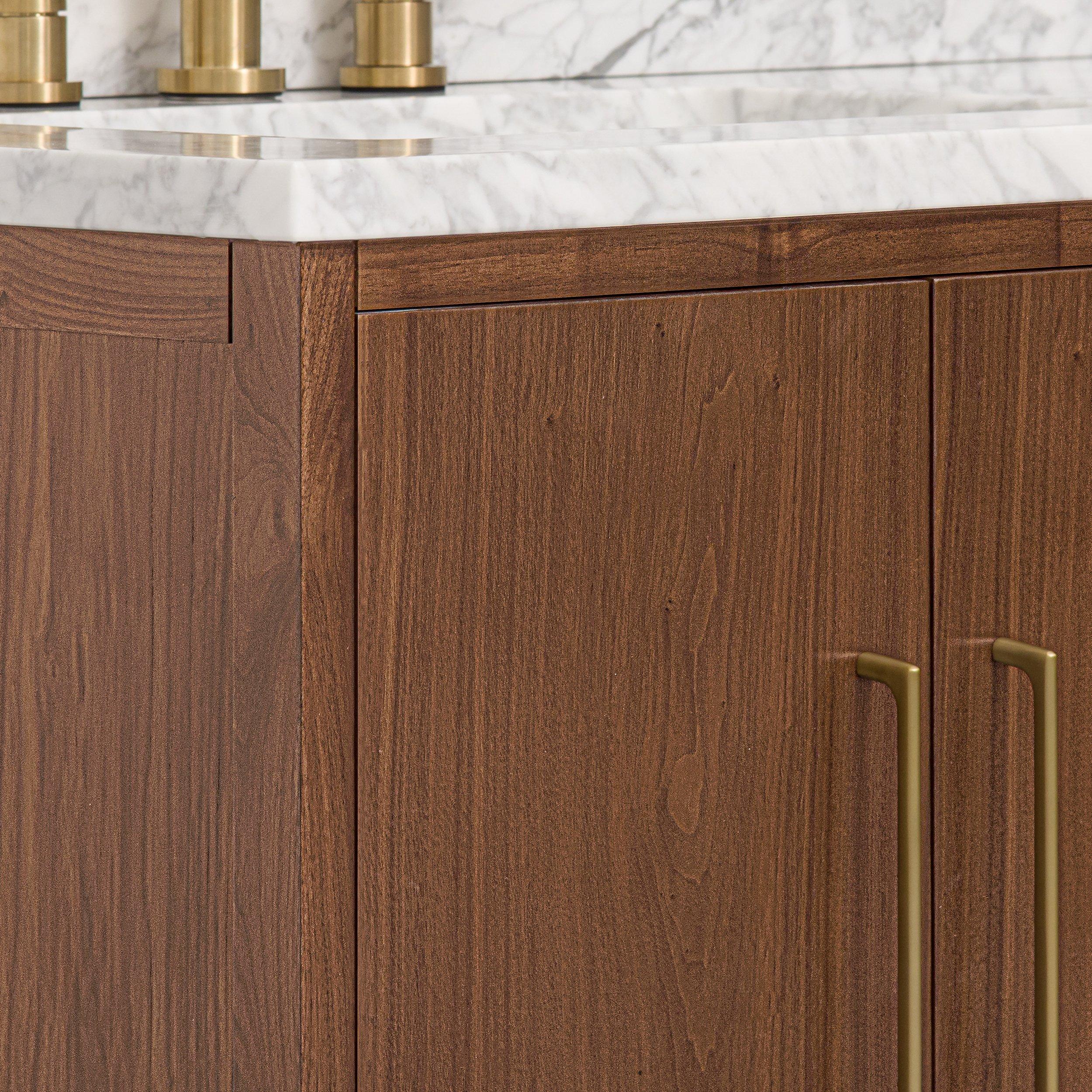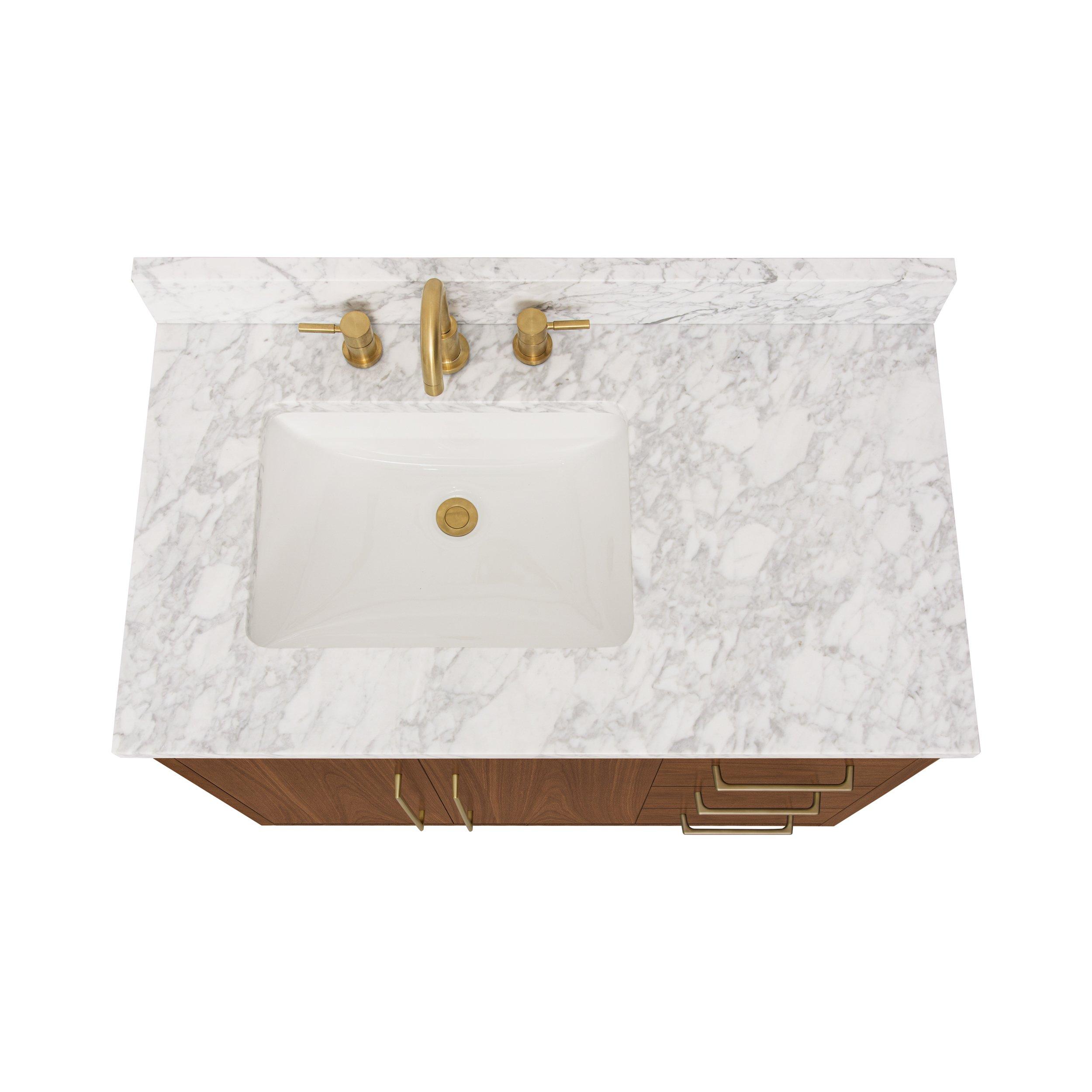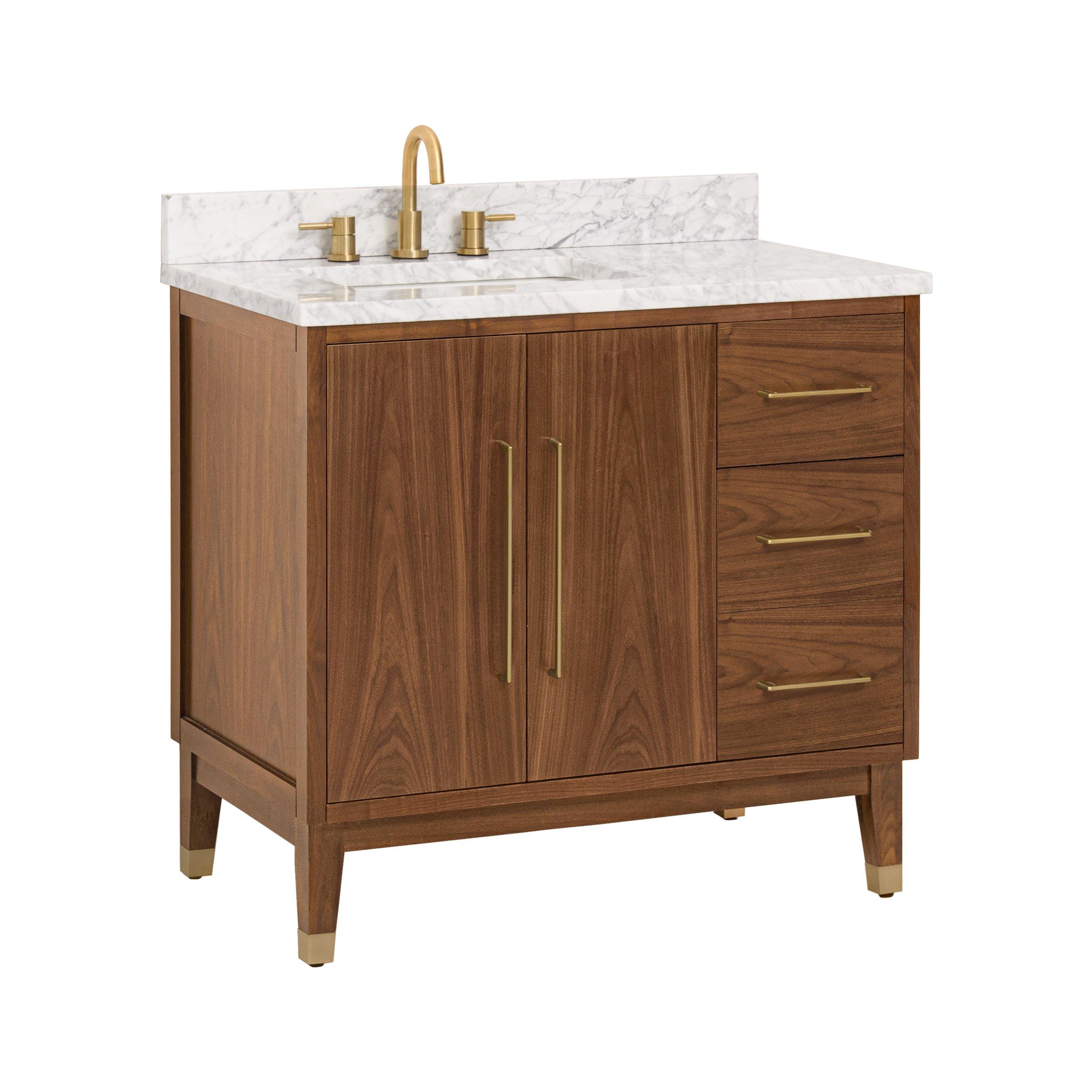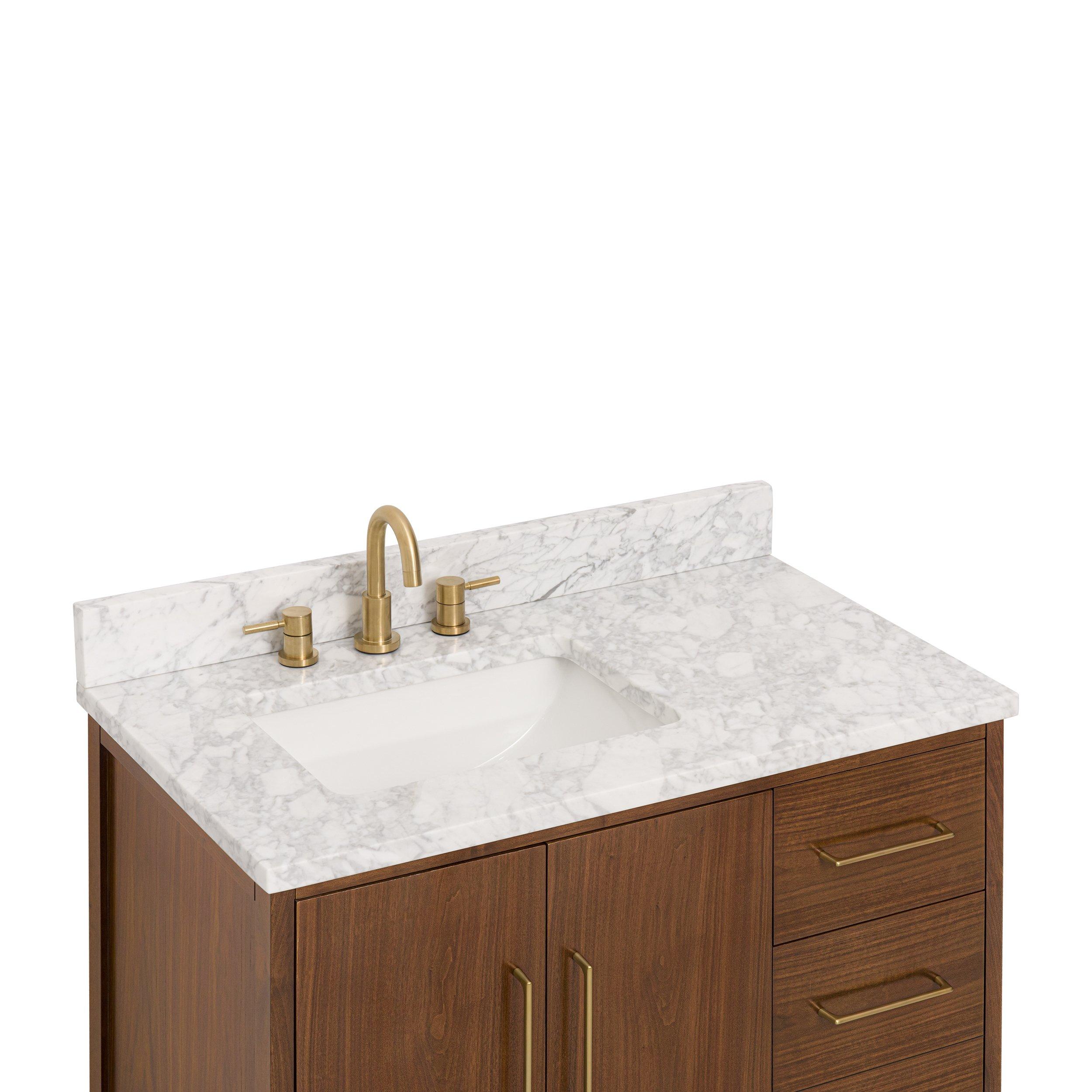 Complete your bathroom with the beautiful Mina 37 in. Walnut Vanity with Carrara Marble Top. This freestanding features durable n/a cabinets in stunning brown with a white n/a vanity top and matte gold hardware. A charming single undermount sink in brilliant white is included. The Mina 37 in. Walnut Vanity with Carrara Marble Top is a versatile choice to customize multiple bathroom settings.