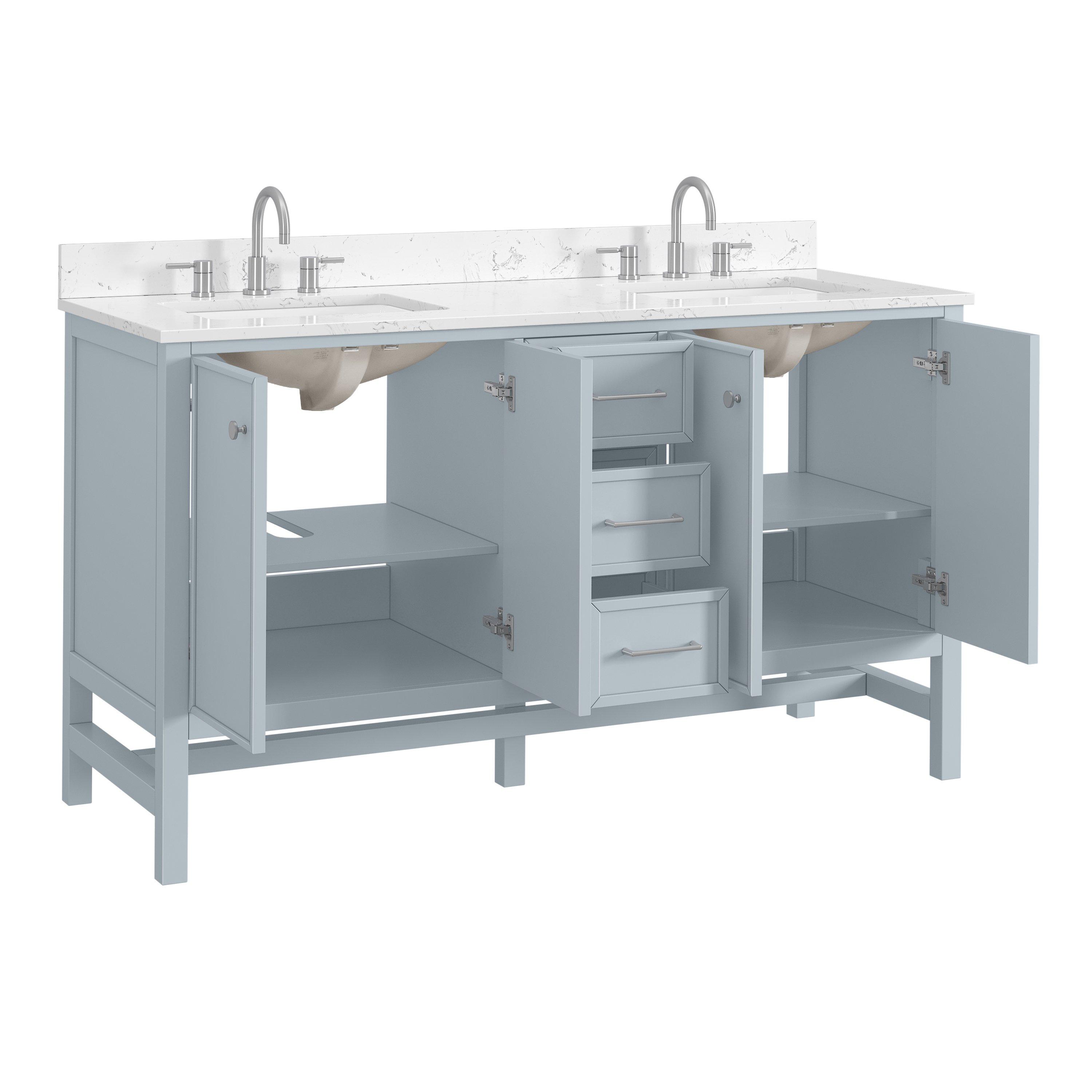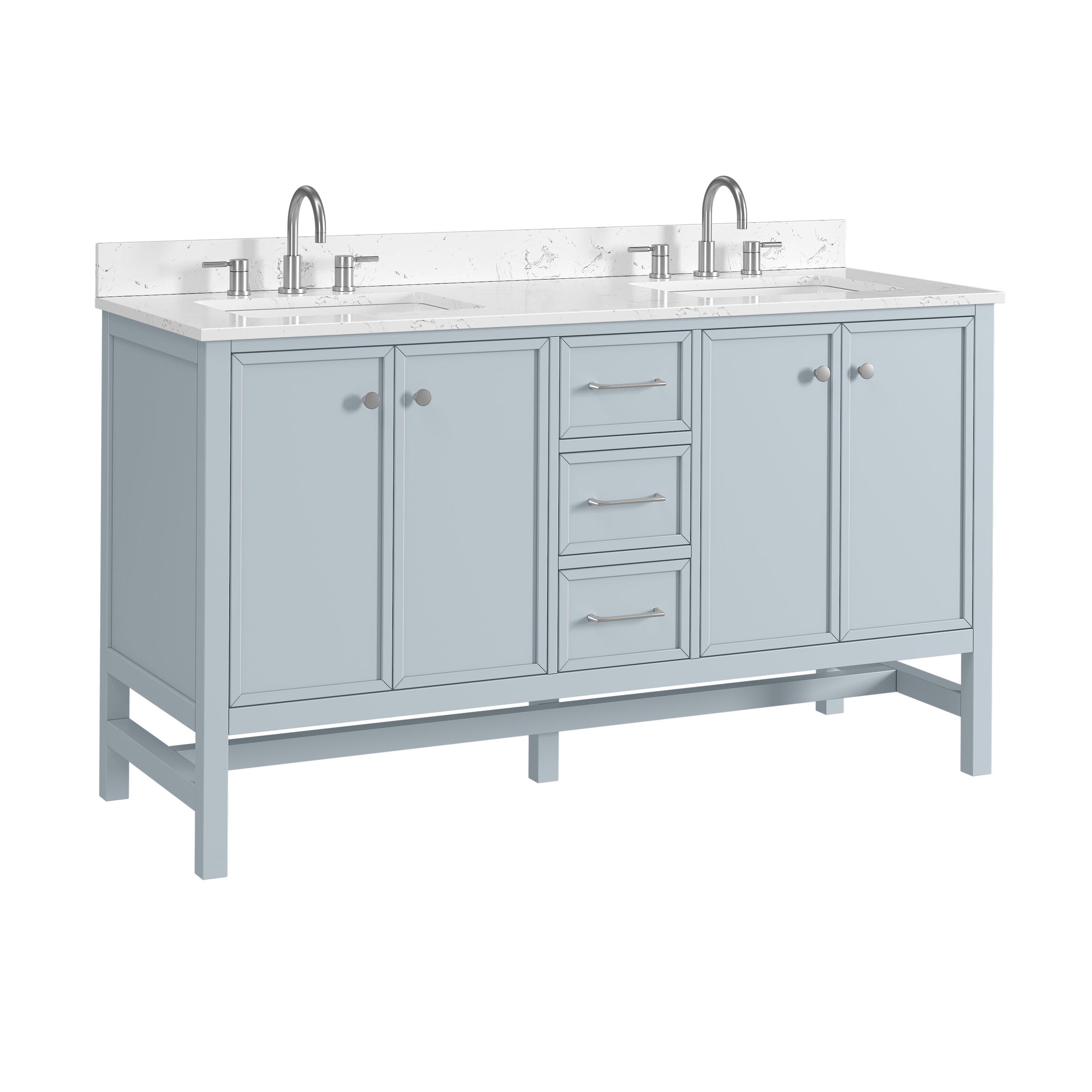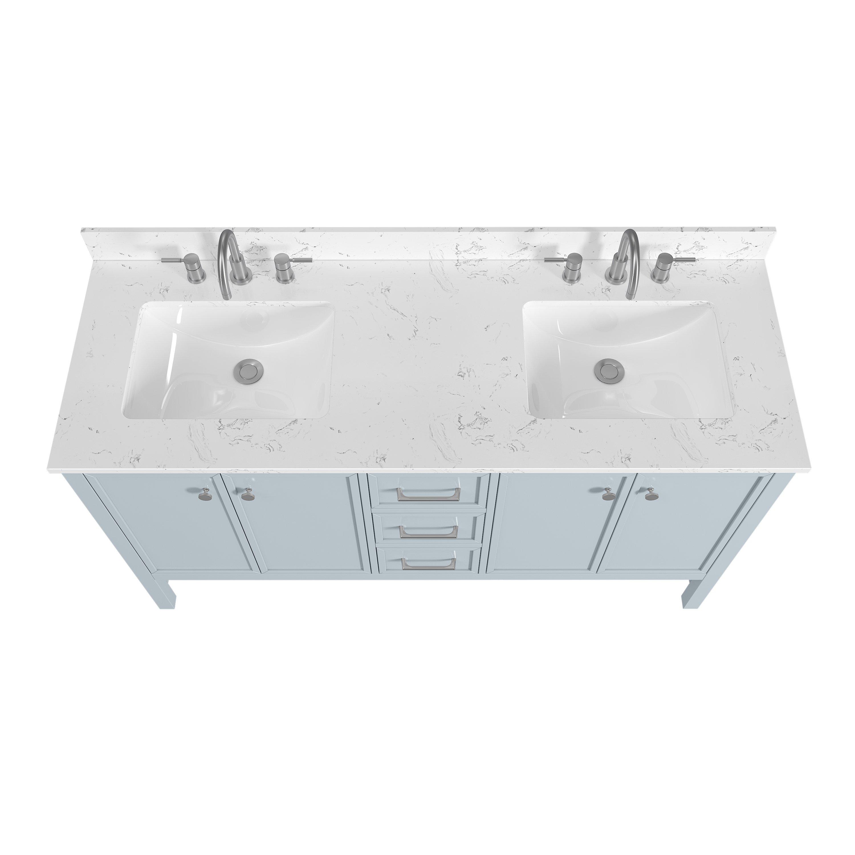 Tailor the look of your bathroom with the Piper 61 in. Blue Vanity with Engineered Stone Top featuring gorgeous solid wood, mdf in blue with 4 doors, 3 drawers, and 2 shelves. This piece is completed with beautiful polished chrome hardware and a double undermount white sink. The Piper 61 in. Blue Vanity with Engineered Stone Top is a stunning addition to any bathroom setting.