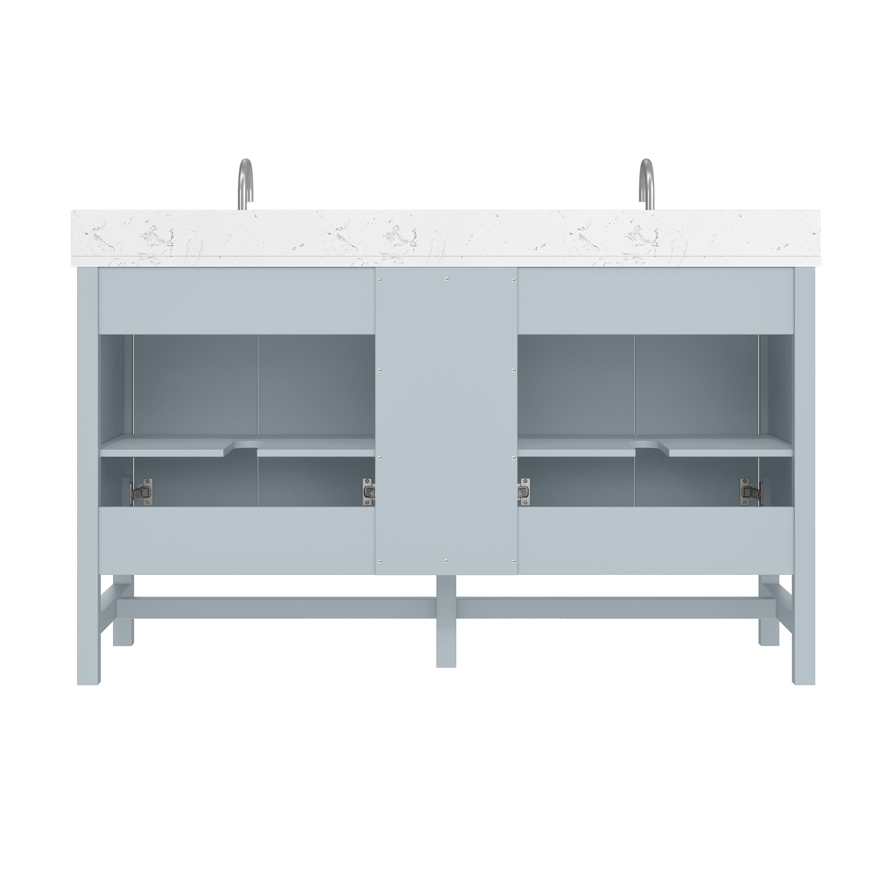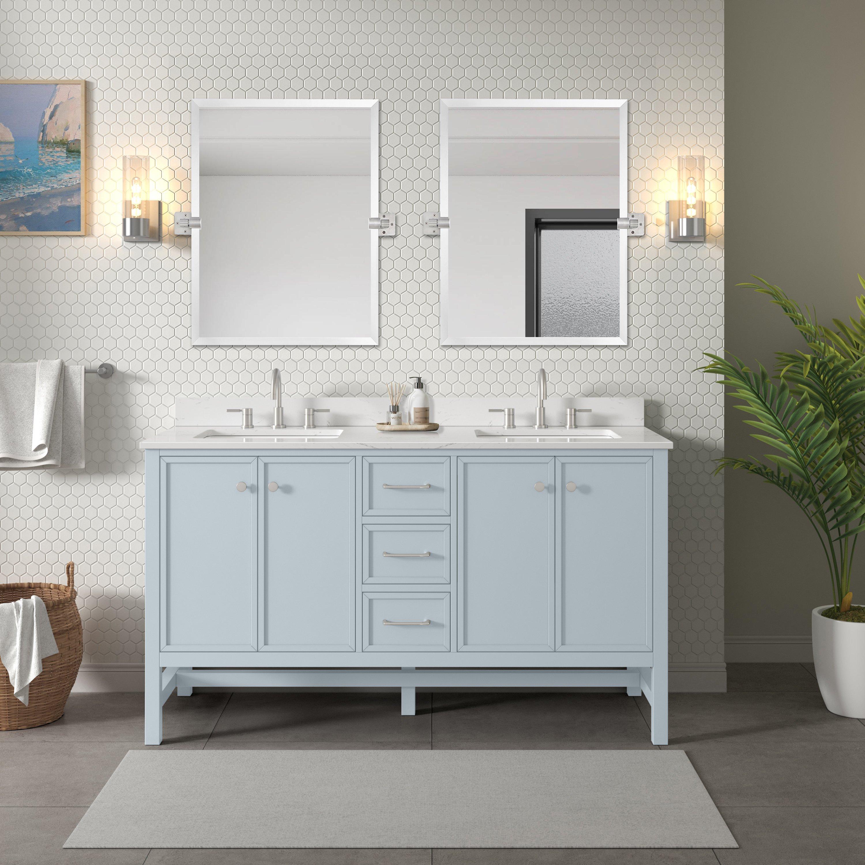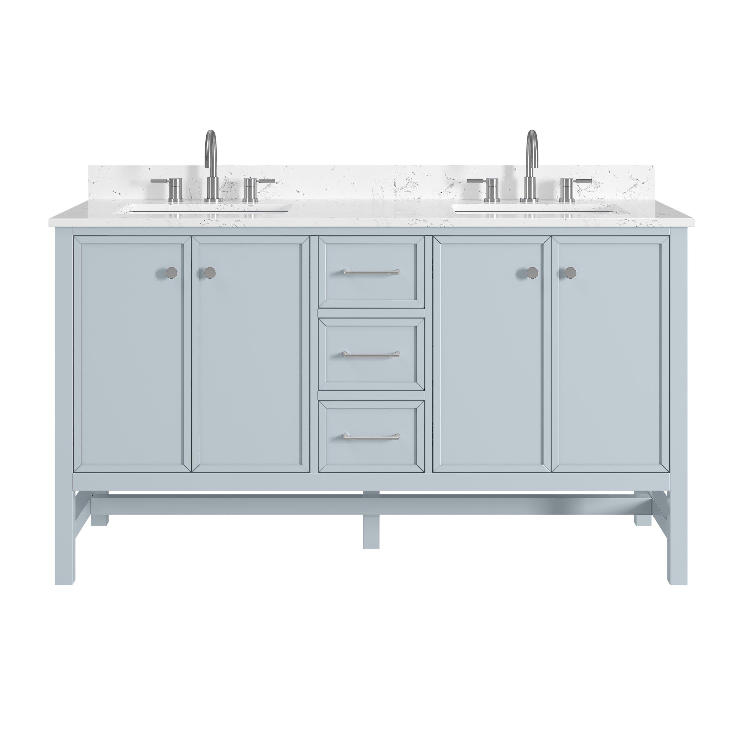 Tailor the look of your bathroom with the Piper 61 in. Blue Vanity with Engineered Stone Top featuring gorgeous solid wood, mdf in blue with 4 doors, 3 drawers, and 2 shelves. This piece is completed with beautiful polished chrome hardware and a double undermount white sink. The Piper 61 in. Blue Vanity with Engineered Stone Top is a stunning addition to any bathroom setting.