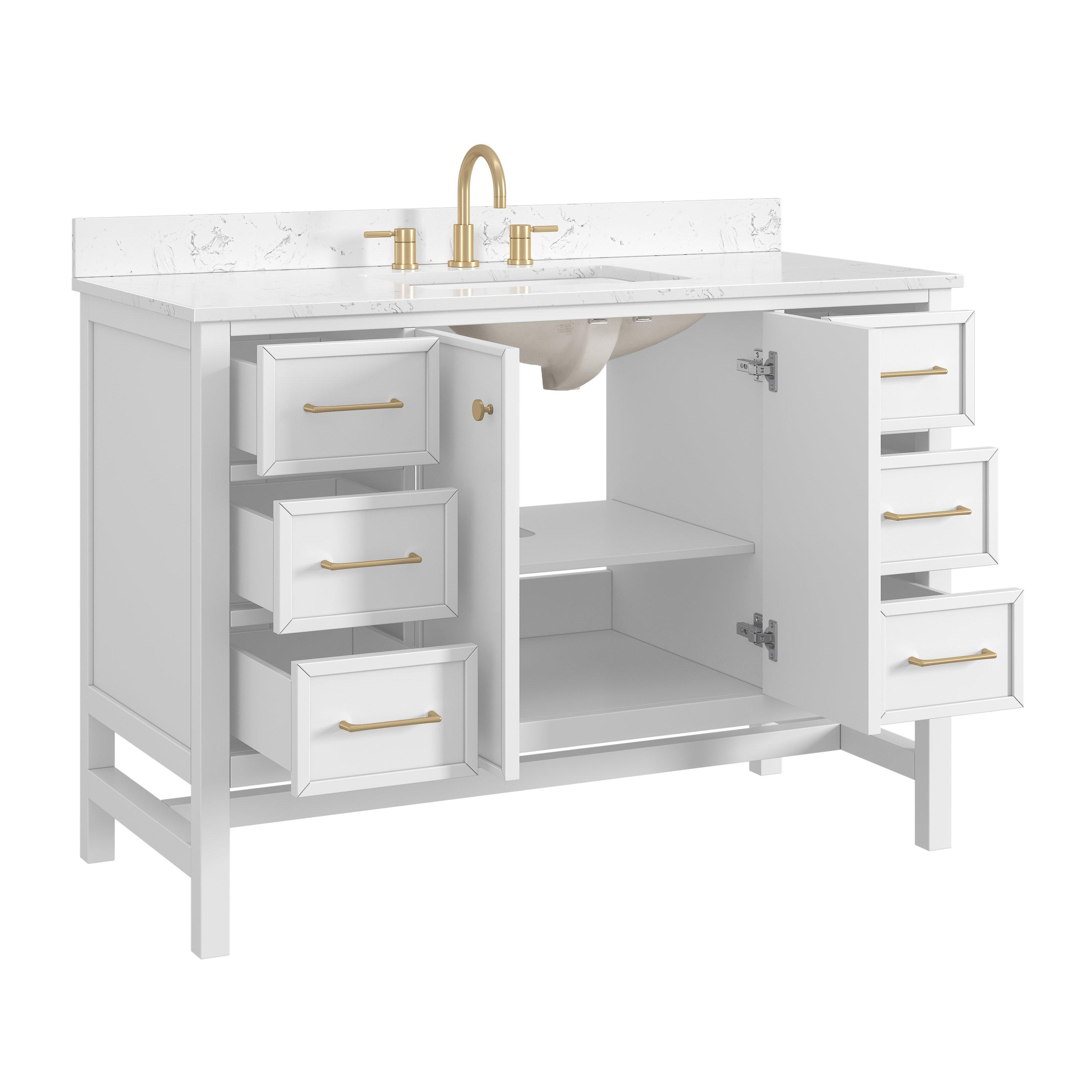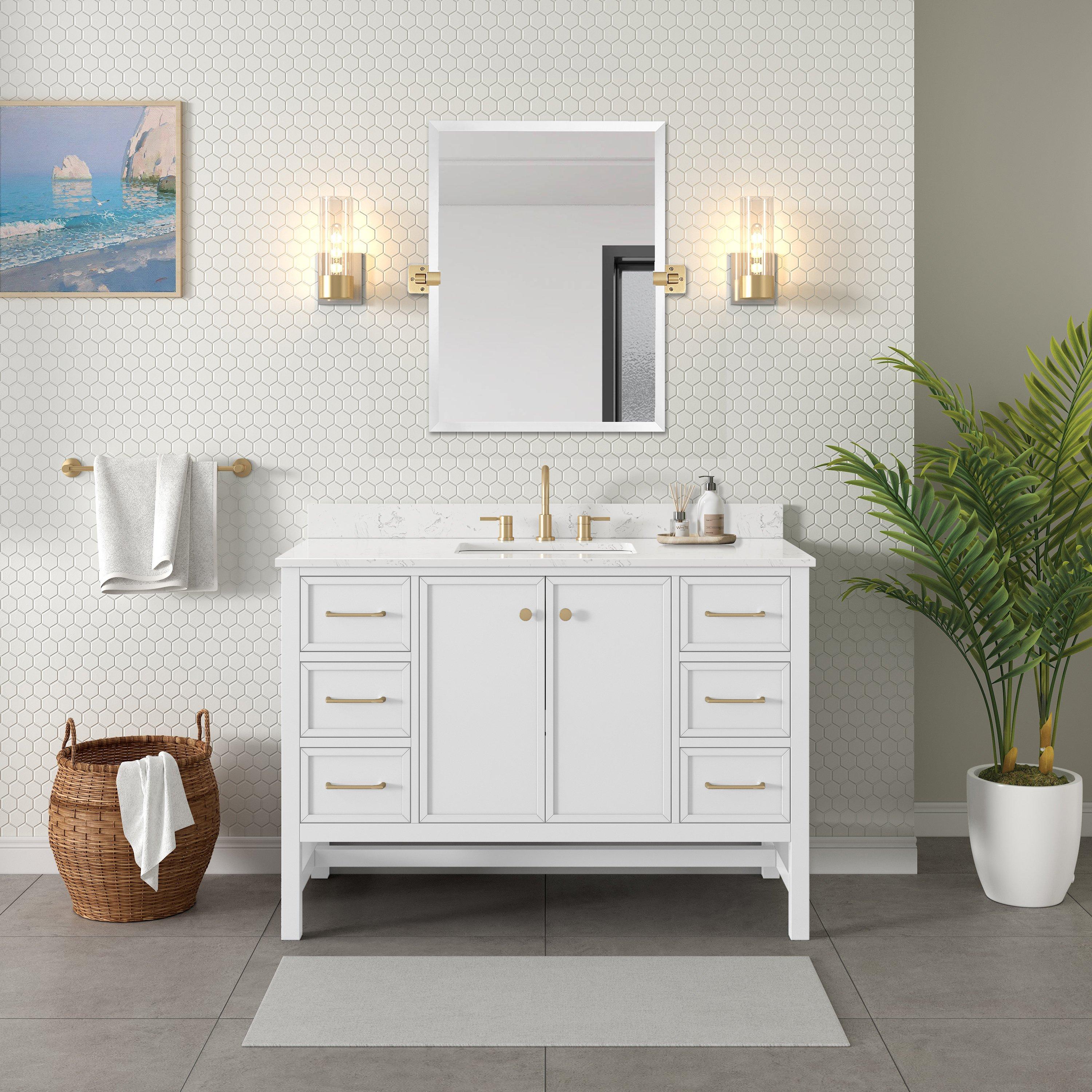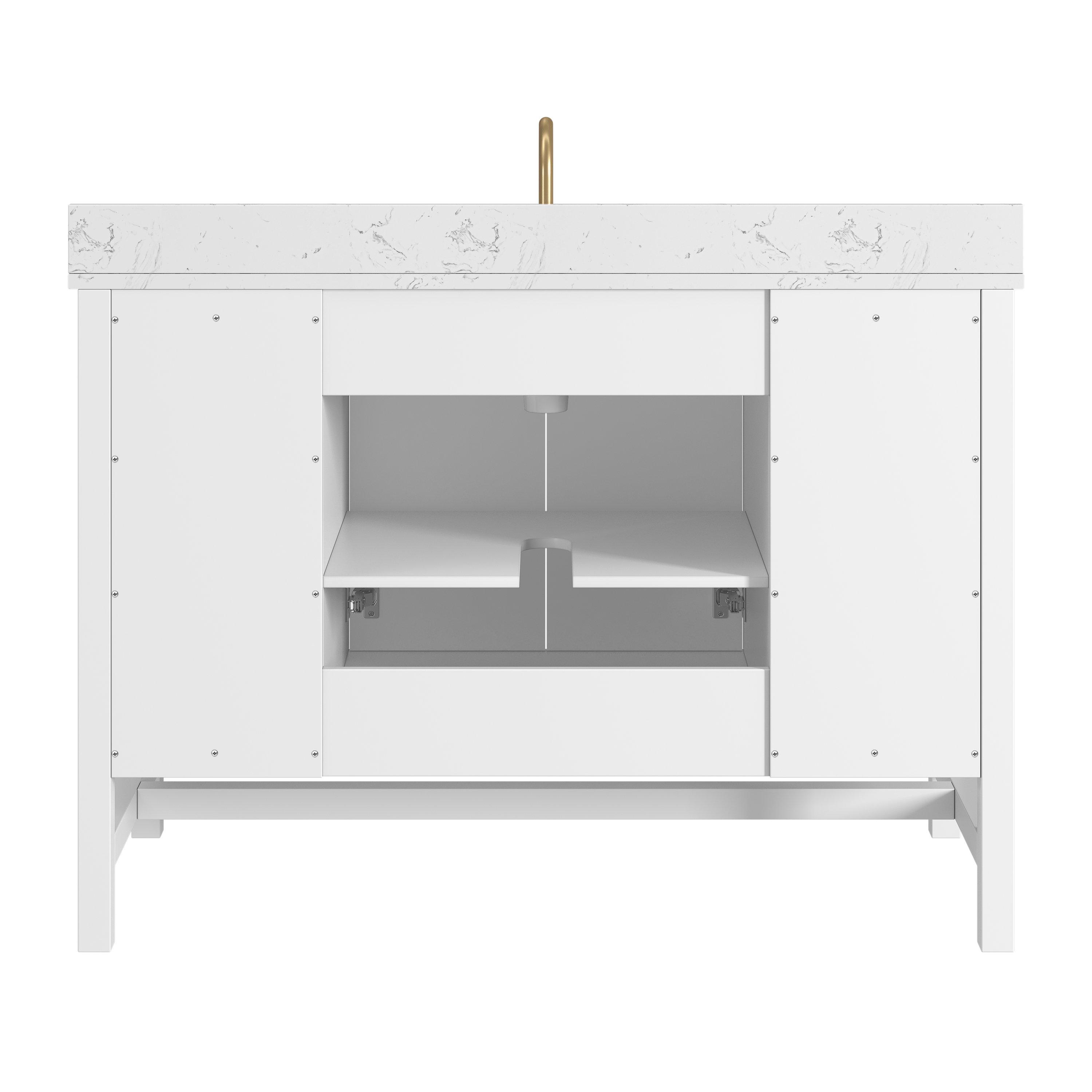 Complete your bathroom with the beautiful Piper 49 in. White Vanity with Engineered Stone Top. This freestanding features durable solid wood, mdf cabinets in stunning white with a white engineered stone vanity top and matte gold hardware. A charming single undermount sink in brilliant white is included. The Piper 49 in. White Vanity with Engineered Stone Top is a versatile choice to customize multiple bathroom settings.