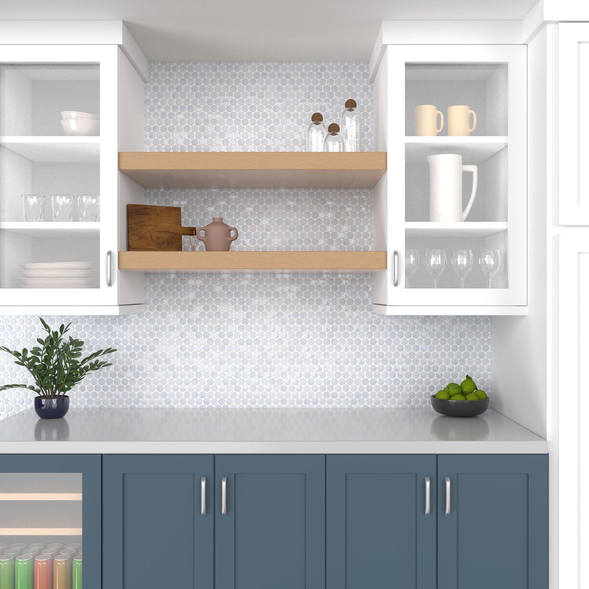 For an elevated look to your design, choose the Beaumont Shadow Ceramic Mixed Penny Mosaic with a matte finish. Use this blue tile to add new visual interest in any space like the bathroom, kitchen, living room, and more.