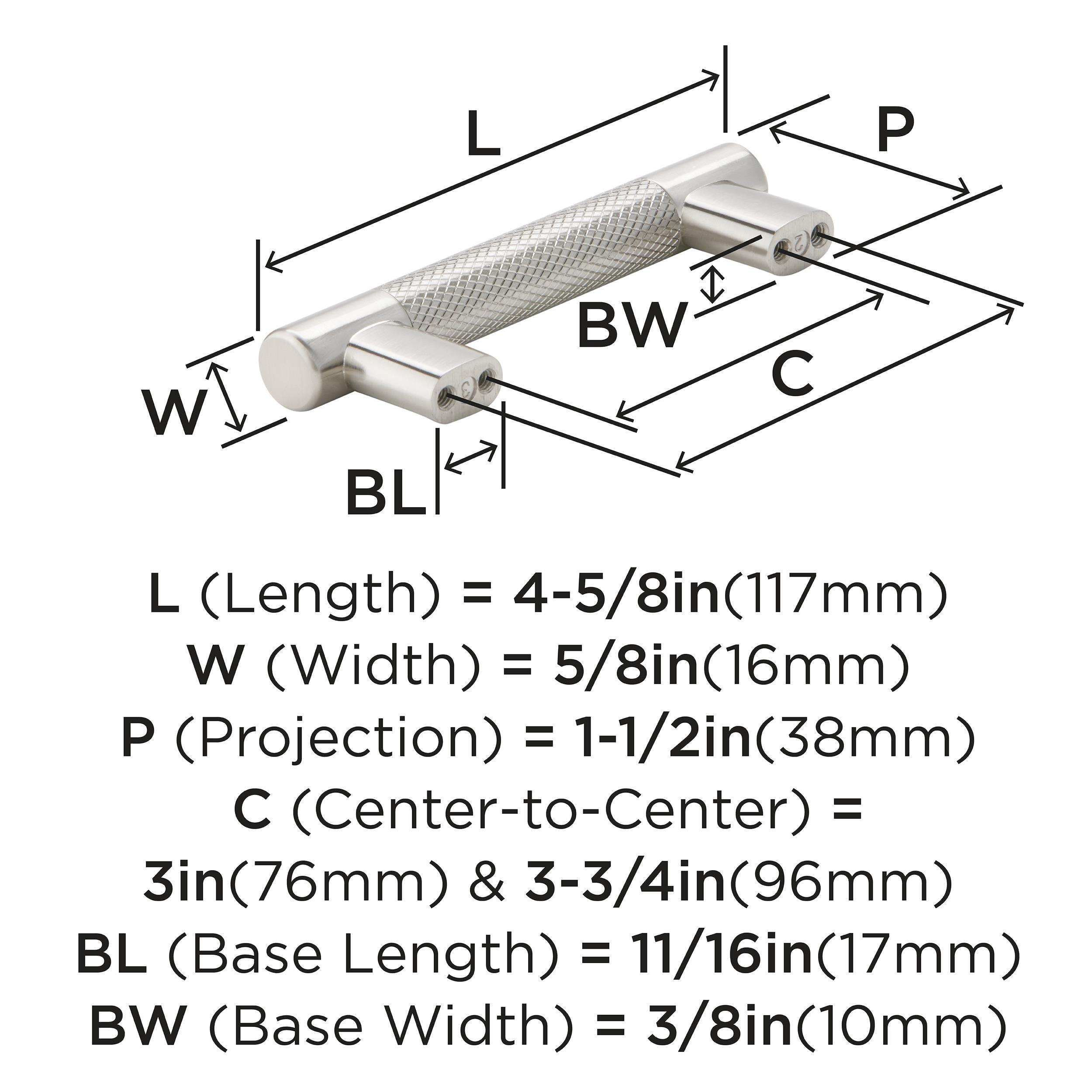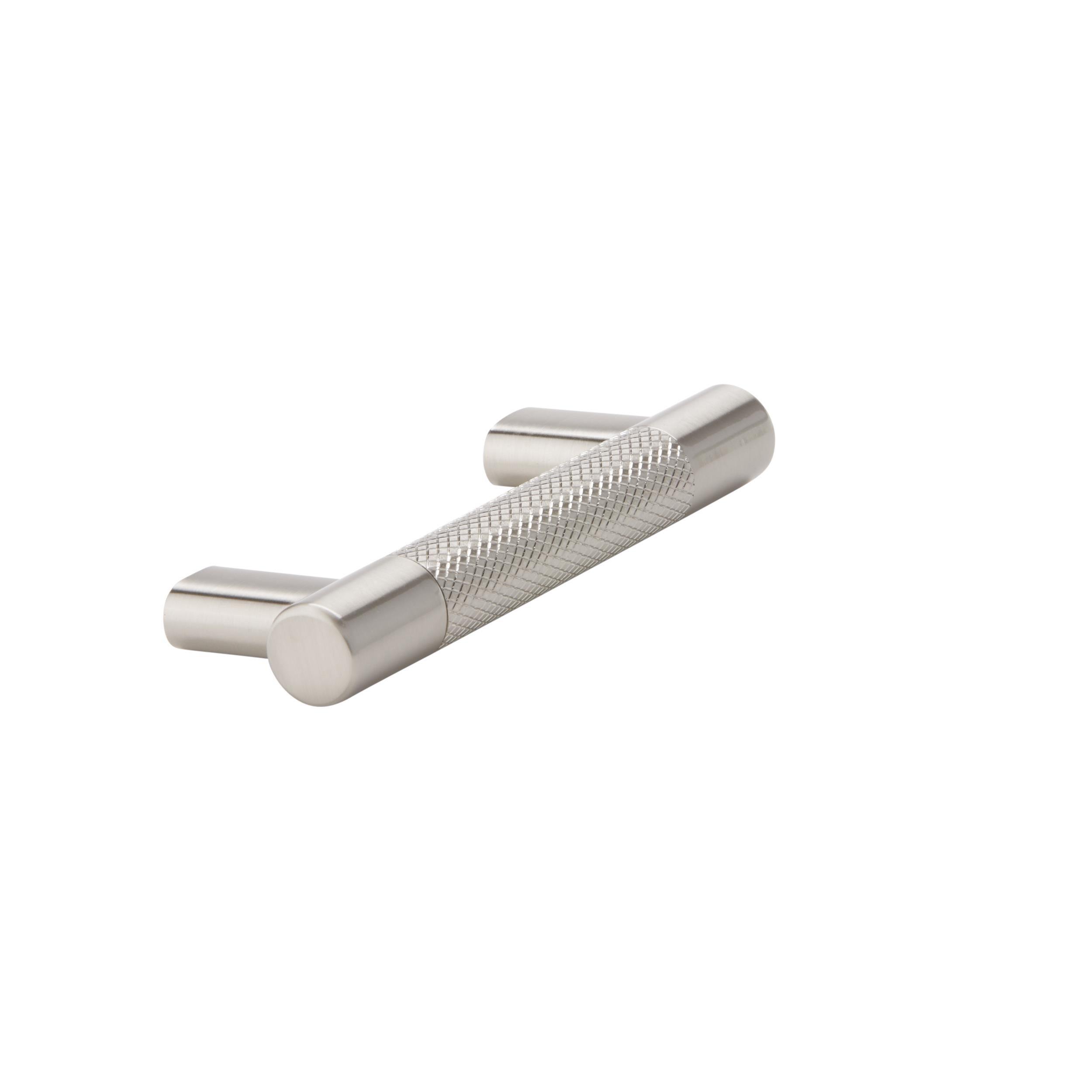 The Amerock Bronx 3 or 3-3/4 in. Center-to-Center Satin Nickel Cabinet Pull is finished in satin nickel satin. The subtle knurling of the Bronx collection adds a sophisticated and modern industrial twist to the traditional bar pull, certain to add designer flair to any space.