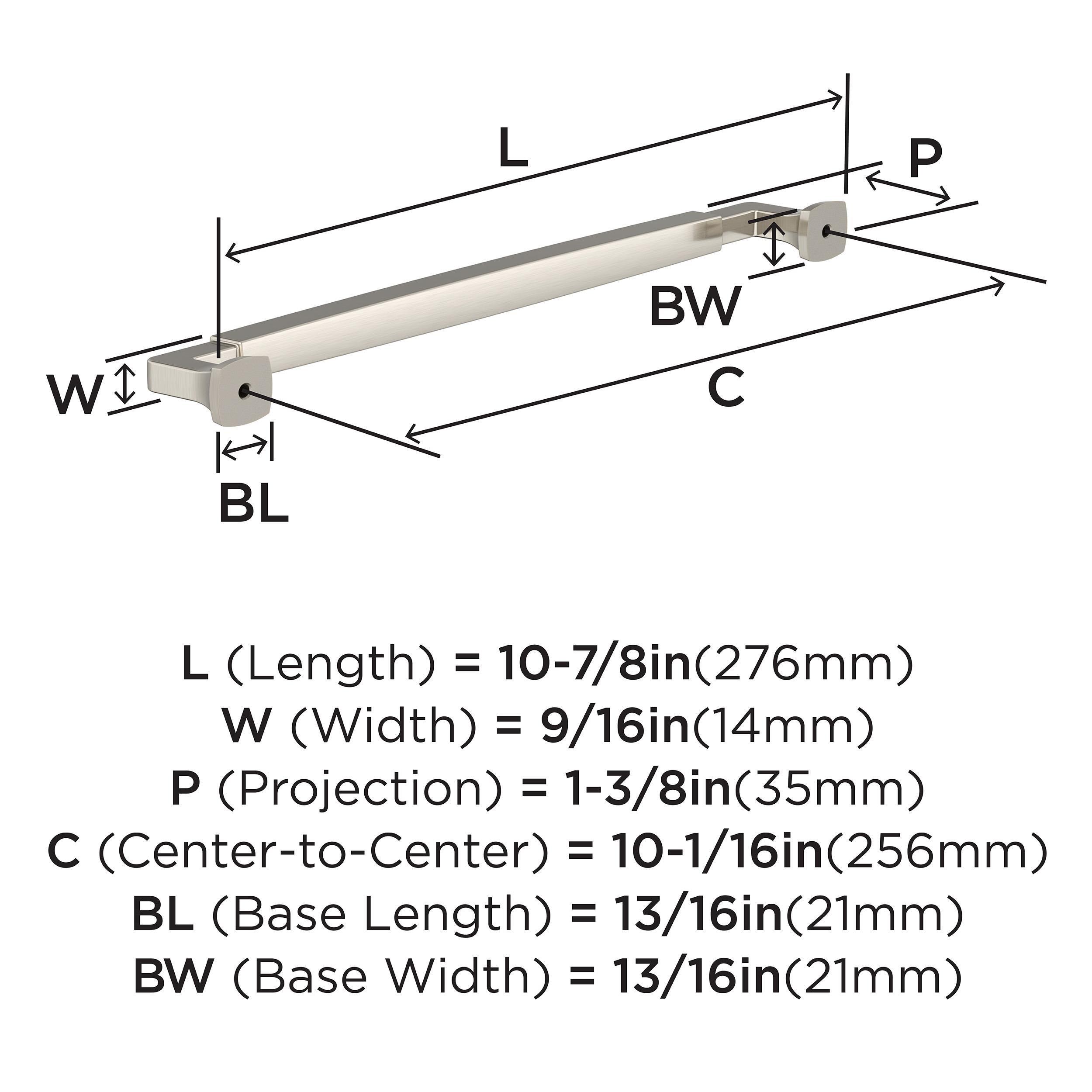 The Amerock Stature 10-1/16 in. Center-to-Center Satin Nickel Cabinet Pull is finished in satin nickel satin. Stately and substantial, the Stature collection features classic, bold designs and barrel-style pulls that are underlined with timeless appeal.