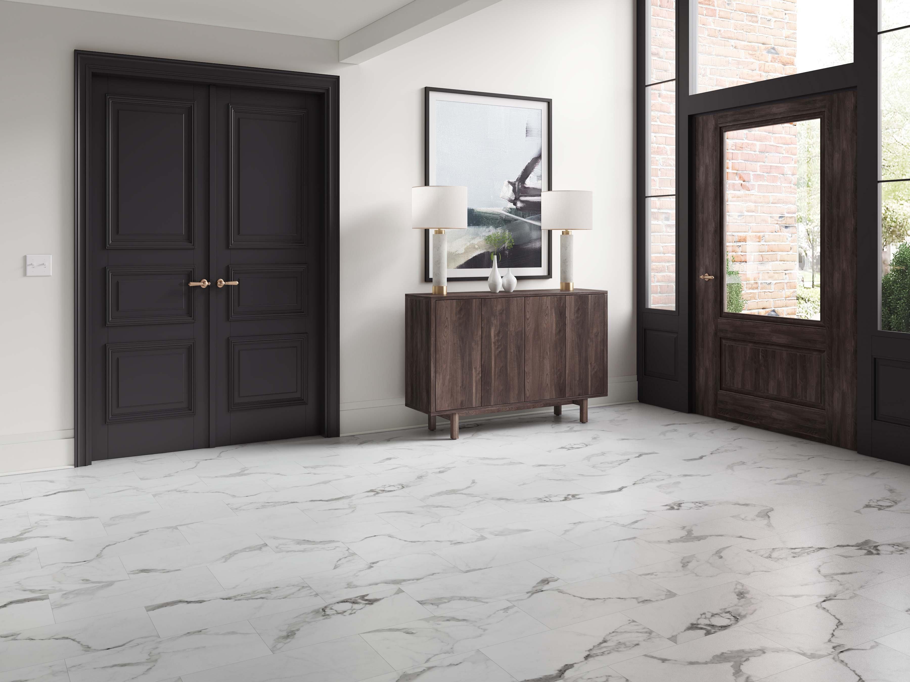Luxury vinyl flooring is 100% waterproof and stands up to most anything life throws its way! 5mm x 12in x 24in DuraLux Performance Bianco Matte Waterproof Rigid Core Luxury Vinyl Tile - Foam Pad is a highly durable and waterproof flooring option that is suitable for any room in the house, including basements, sunrooms, and full bathrooms. Plus, its rigid stone-based core makes each plank dent-resistant and scratch-resistant, so DuraLux Performance is perfect for high-traffic areas.