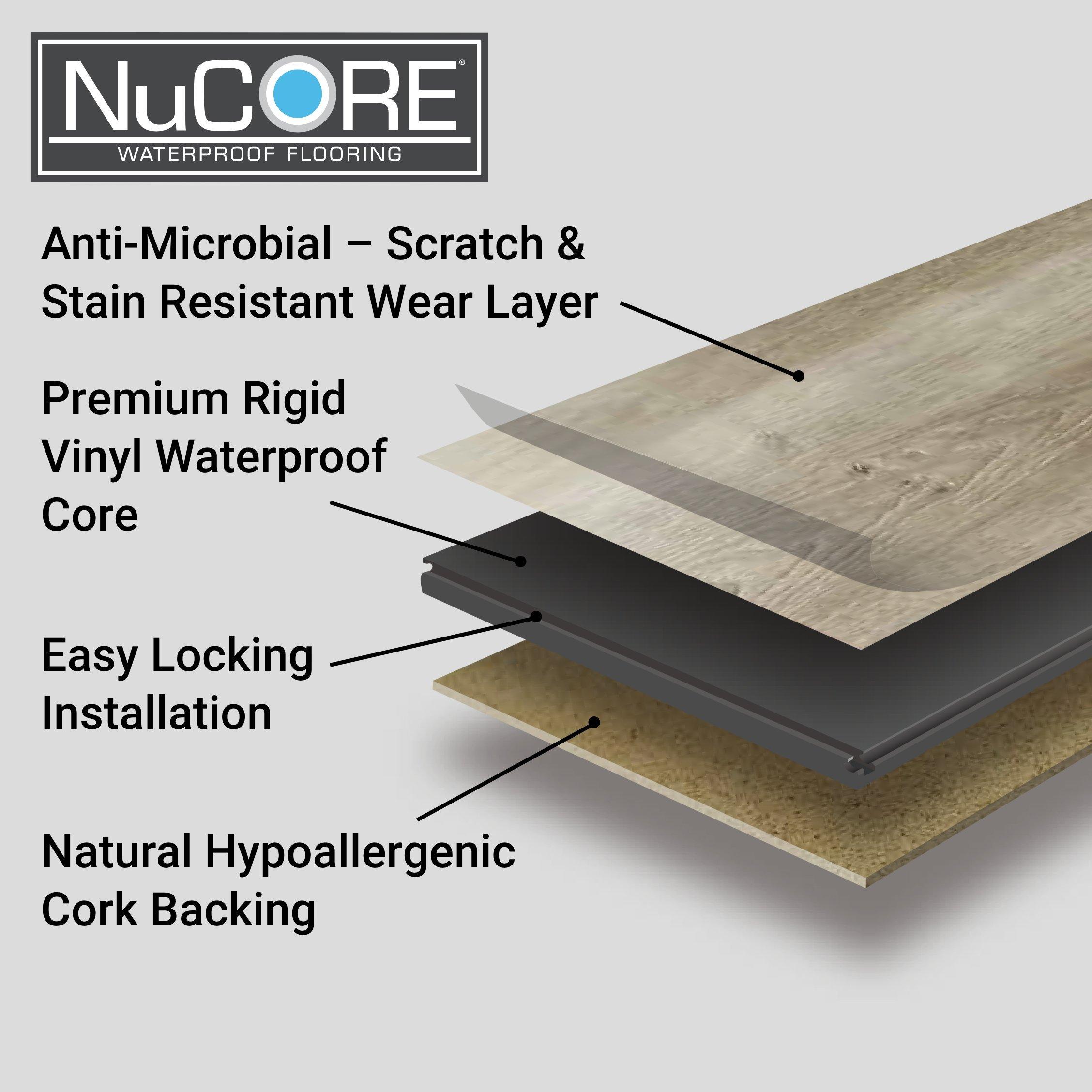 8mm x 9in x 72in NuCore Chastain Creek Waterproof Rigid Core Luxury Vinyl Plank - Cork Pad looks and feels like wood and tile, but can be installed where real wood cannot. With quick and easy installation, it's the perfect flooring option for any room! Even better, the anti-microbial coating on each plank makes it resistant to staining or odors caused by mold or mildew. With a lifetime res./ 20 yr comm. warranty, it's sure to be a long-lasting flooring option for any space.