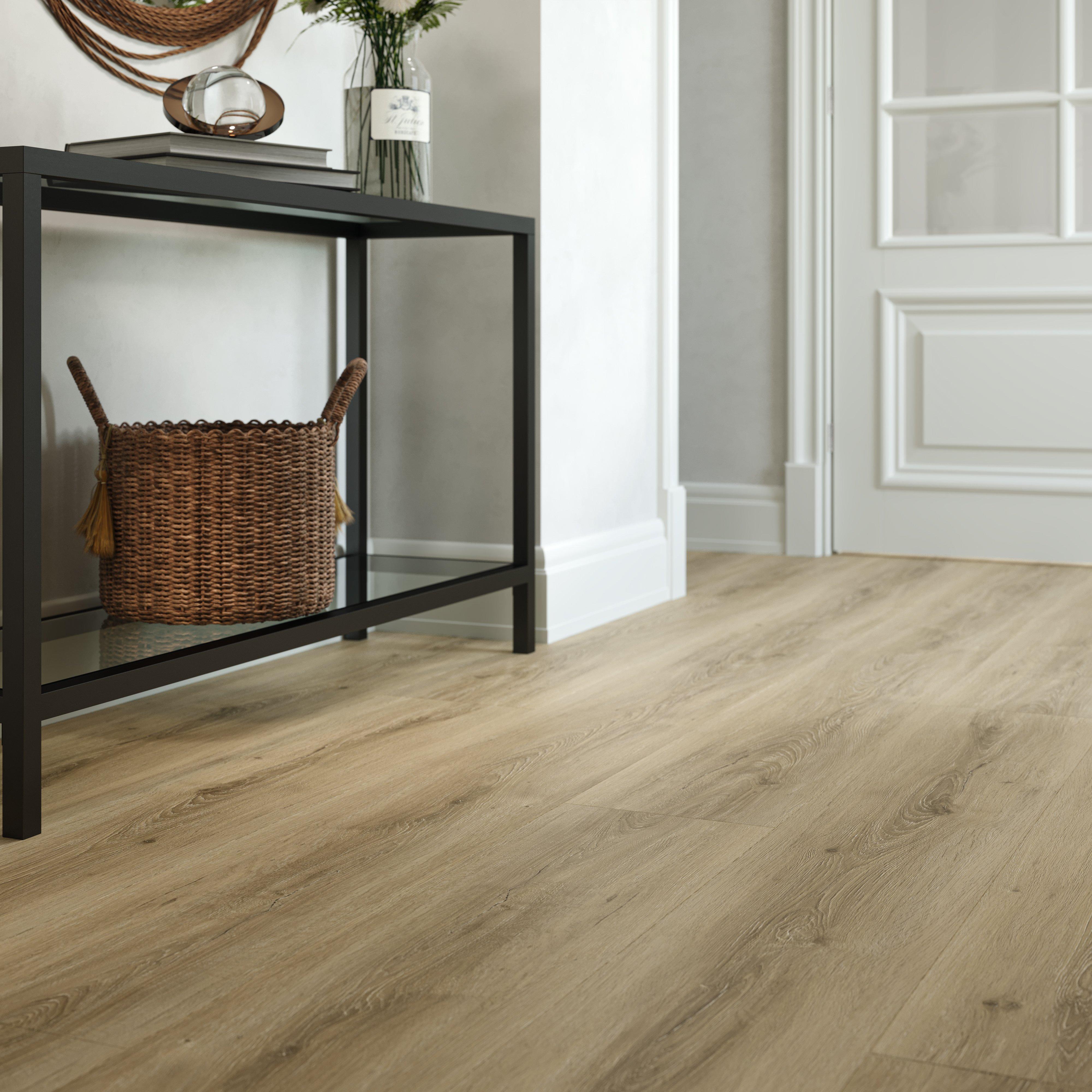 Pre-attached hypoallergenic cork pad creates a quieter, warmer floor and 5.5+ mm total flooring thickness. Sentinel Protect Plus underlayment recommended for increased performance.