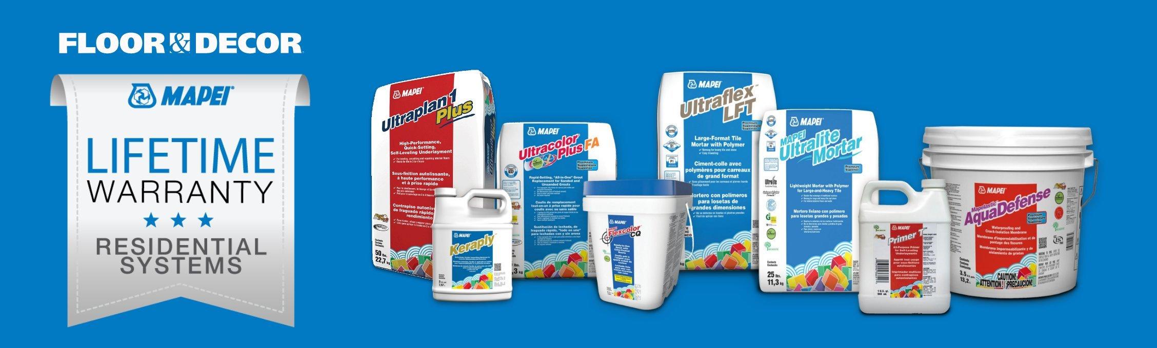 Exclusive to Floor & Decor, MAPEI’s Tile and Stone Installation Systems will warrant your entire tile installation for life. Installations that use a grouping of eligible surface-preparation, tile-setting and grouting products will qualify for the Residential System Lifetime Warranty. One solution from each category must be used in the tile installation in order to be eligible. All eligible products used must be installed according to the Technical Data Sheets provided to receive eligibility for the warranty.