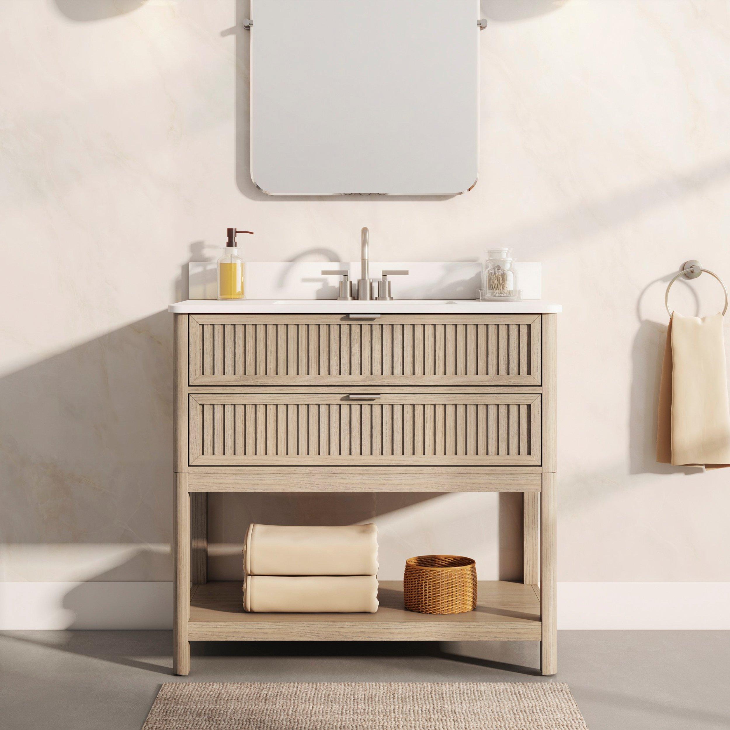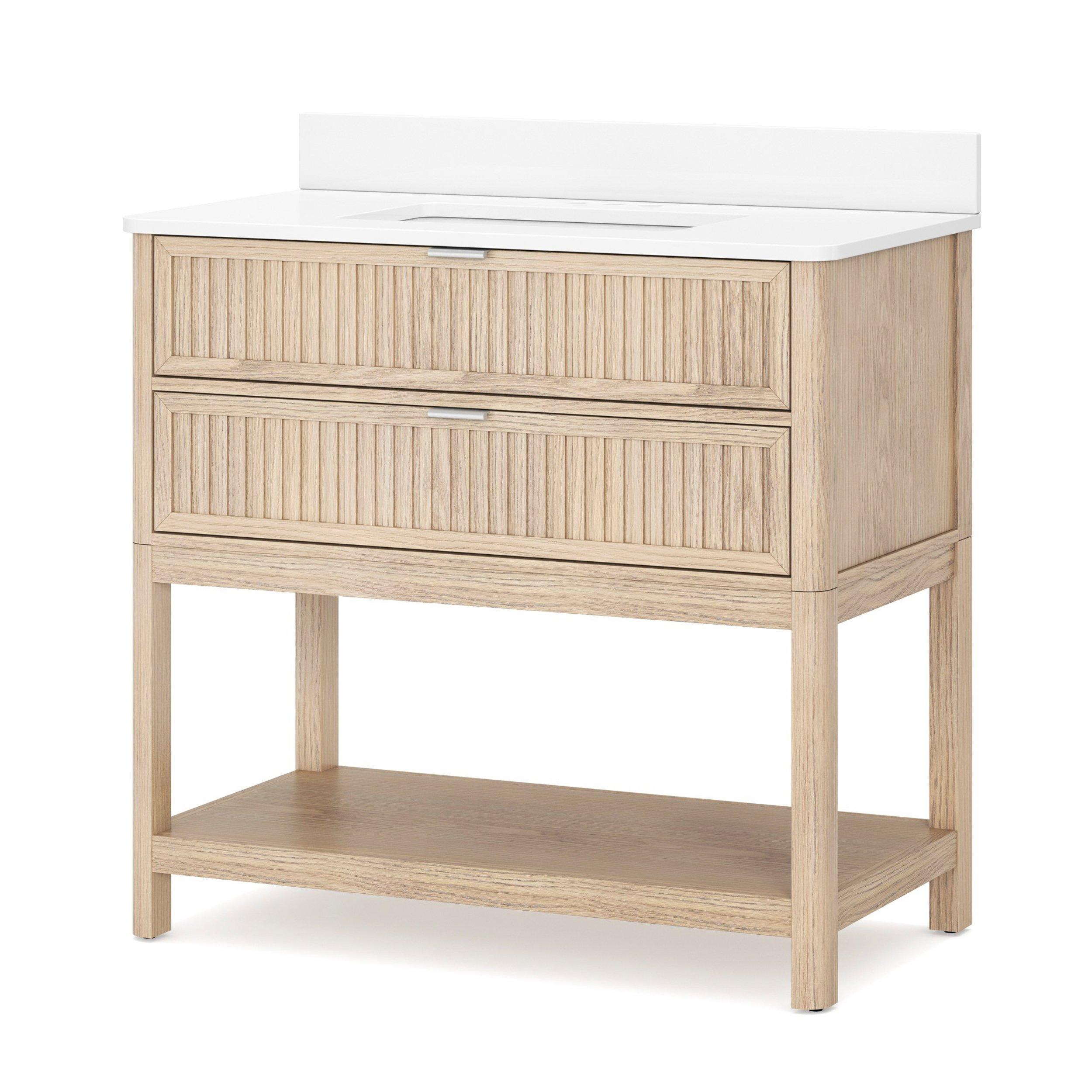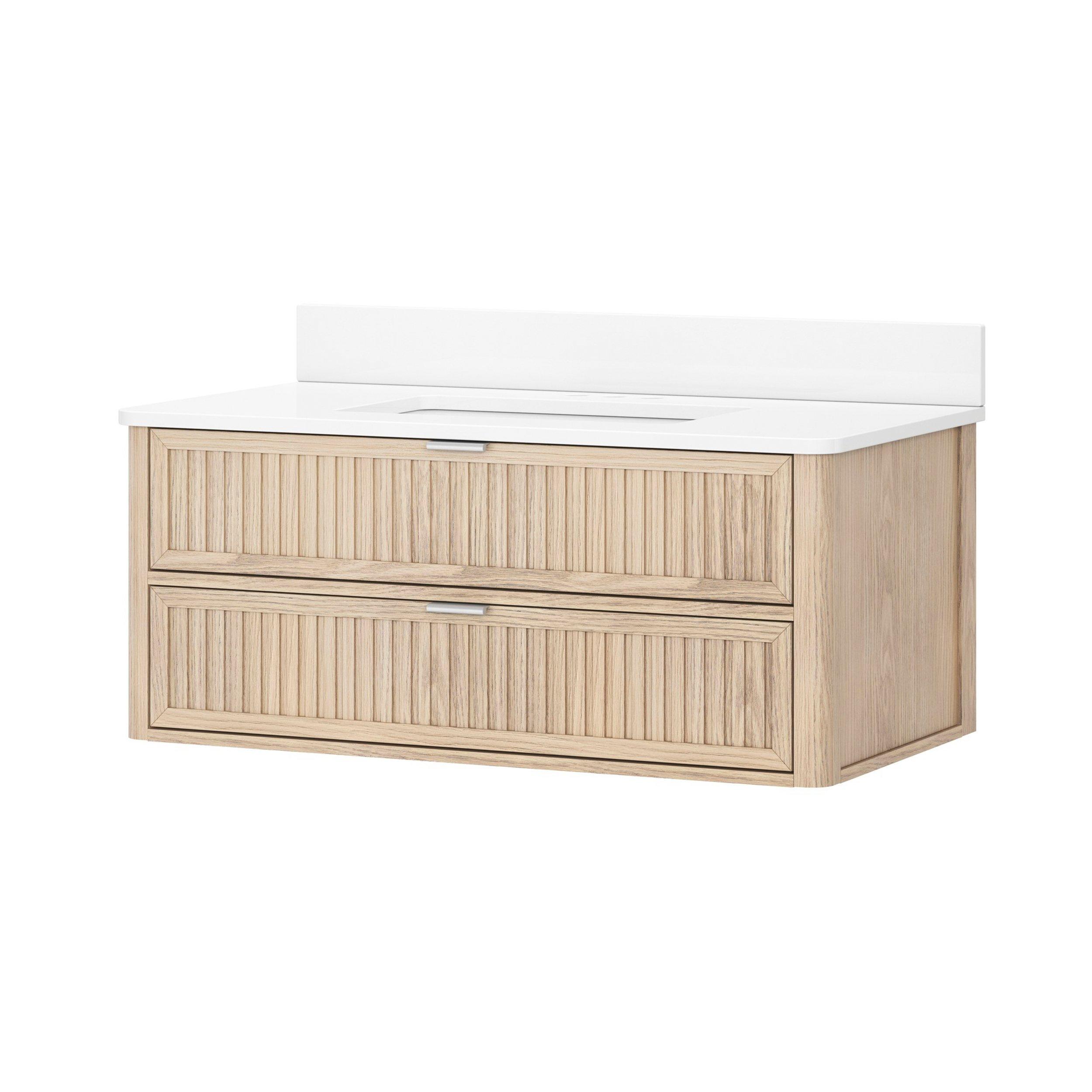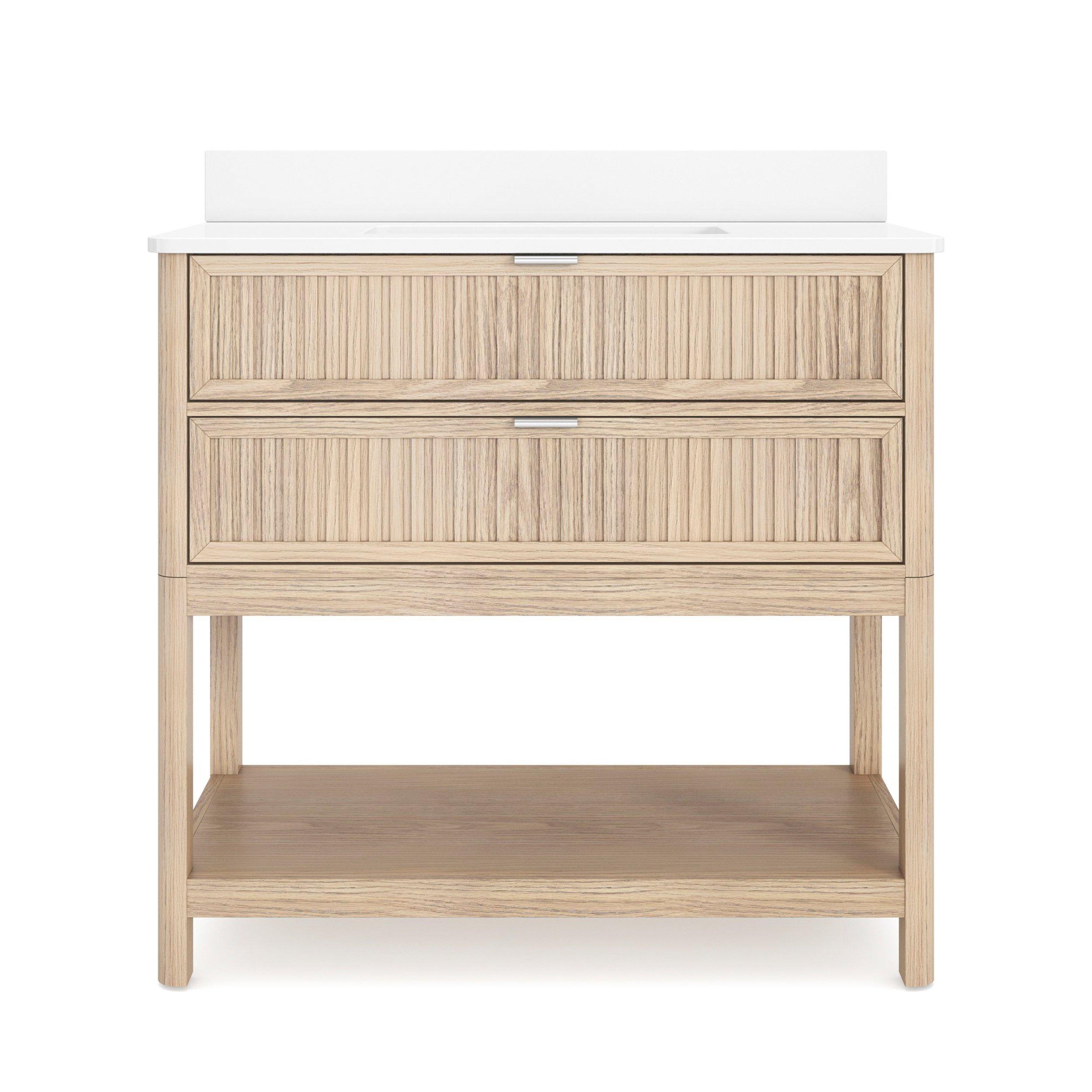 Complete your bathroom with the beautiful Palma 37 in. Natural Vanity with Engineered Stone Top. This wall mounted or freestanding features durable solid wood, mdf cabinets in stunning natural with a white composite vanity top and brushed multi hardware. A charming single undermount sink in brilliant white is included. The Palma 37 in. Natural Vanity with Engineered Stone Top is a versatile choice to customize multiple bathroom settings.
