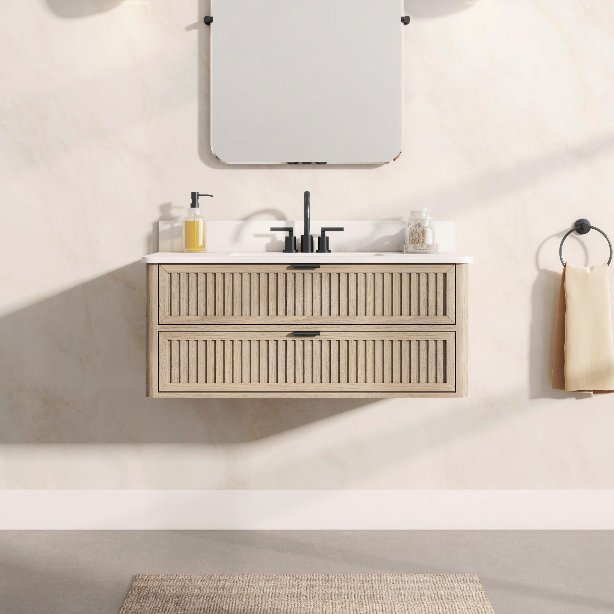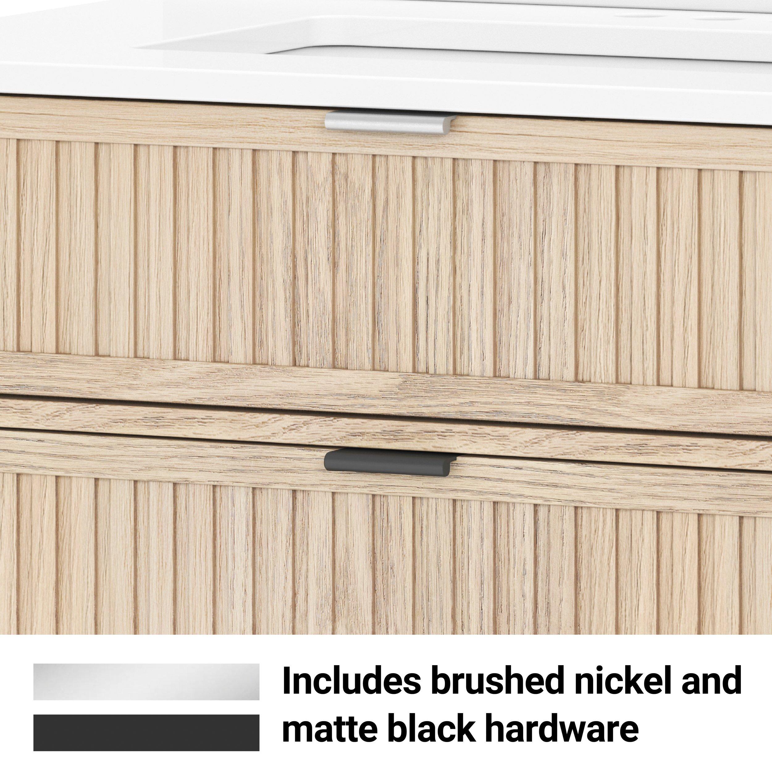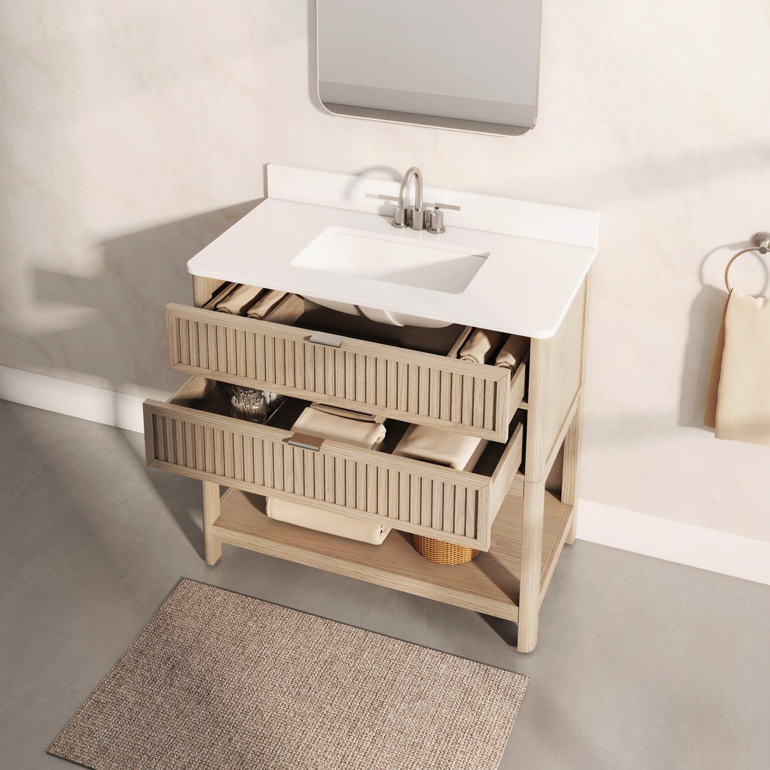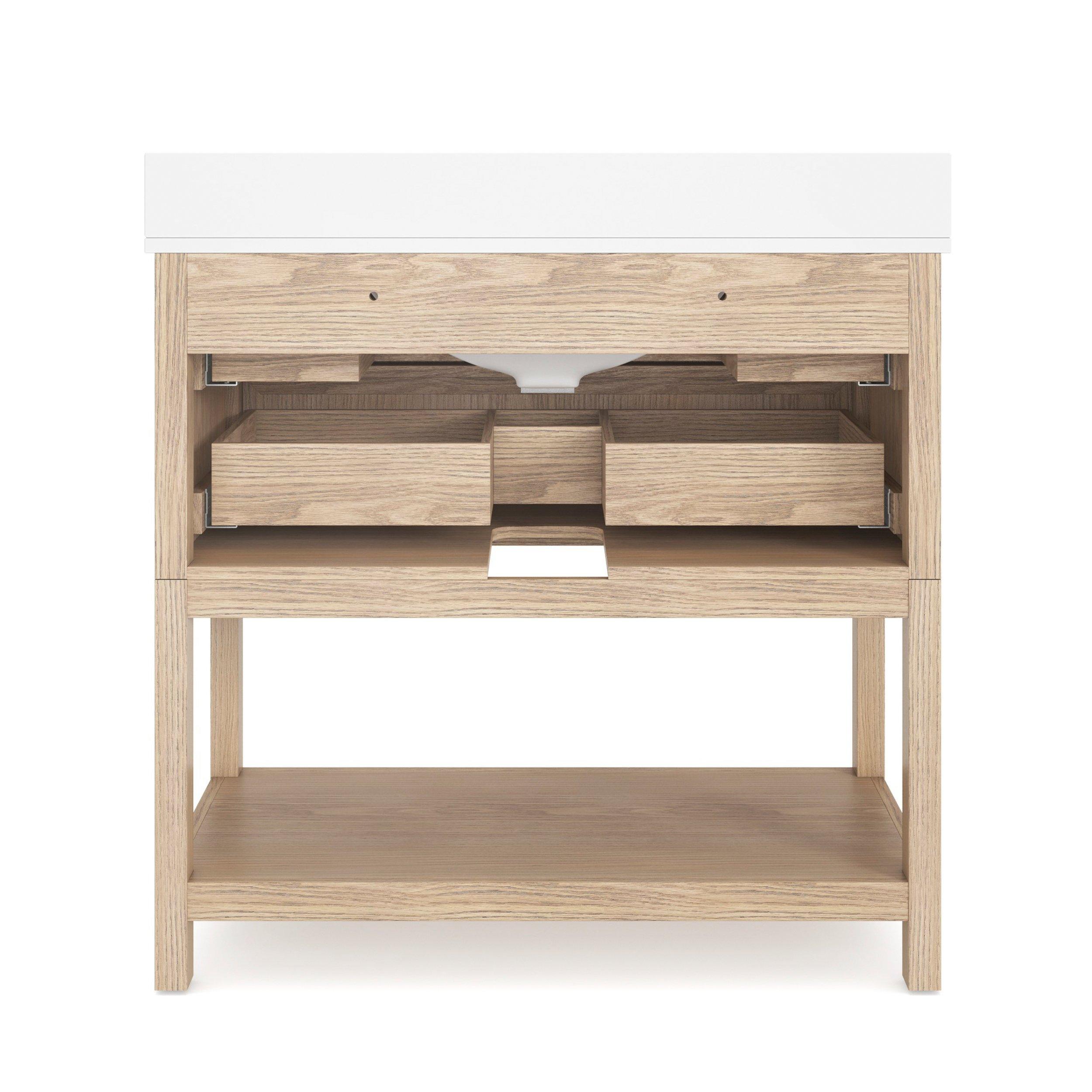 Complete your bathroom with the beautiful Palma 37 in. Natural Vanity with Engineered Stone Top. This wall mounted or freestanding features durable solid wood, mdf cabinets in stunning natural with a white composite vanity top and brushed multi hardware. A charming single undermount sink in brilliant white is included. The Palma 37 in. Natural Vanity with Engineered Stone Top is a versatile choice to customize multiple bathroom settings.