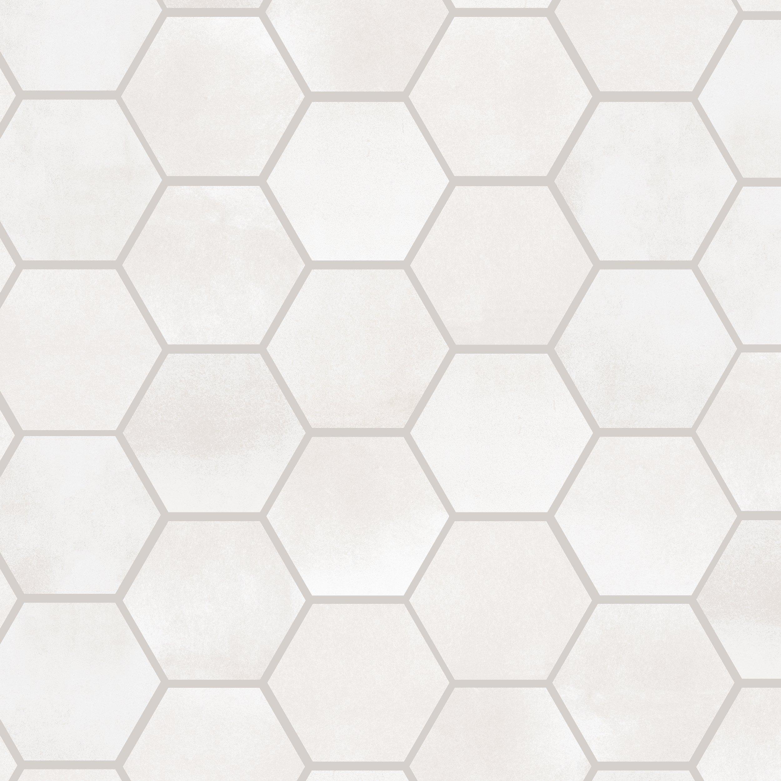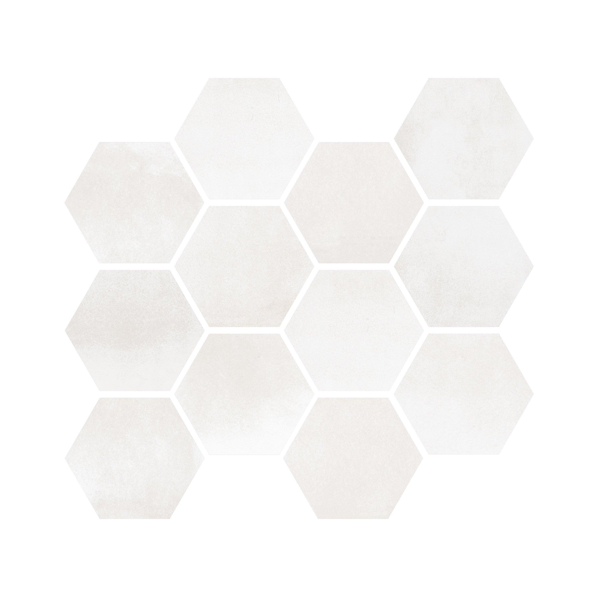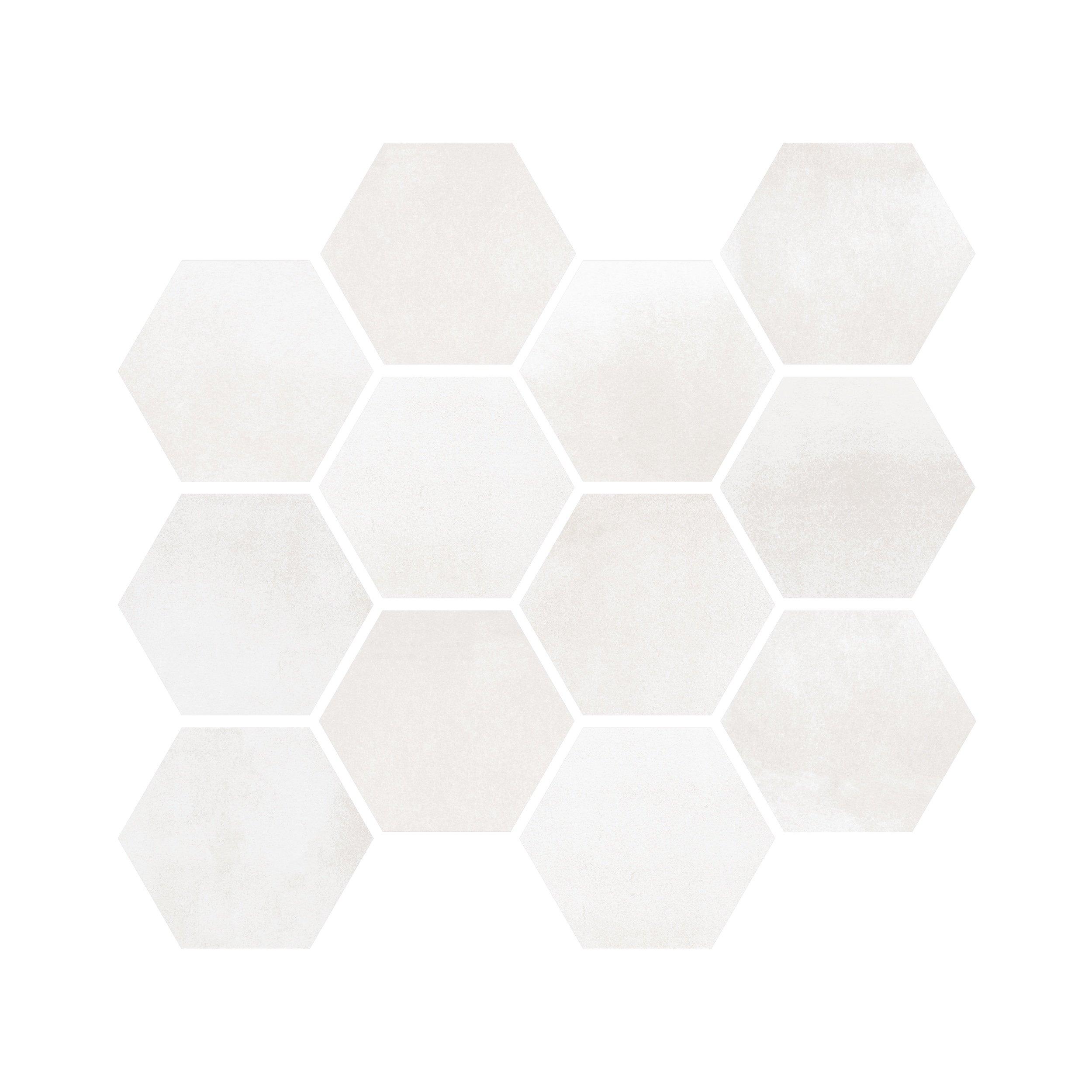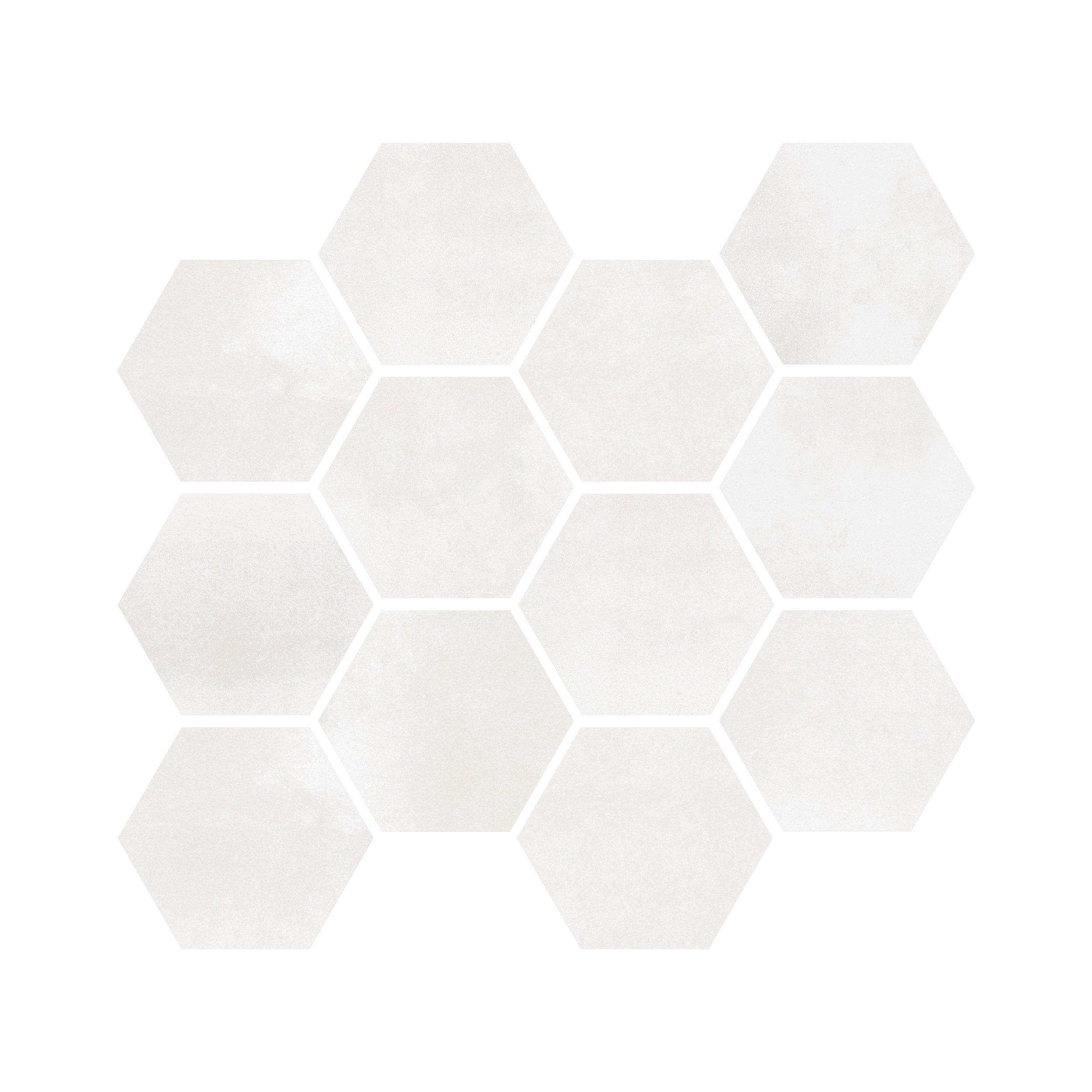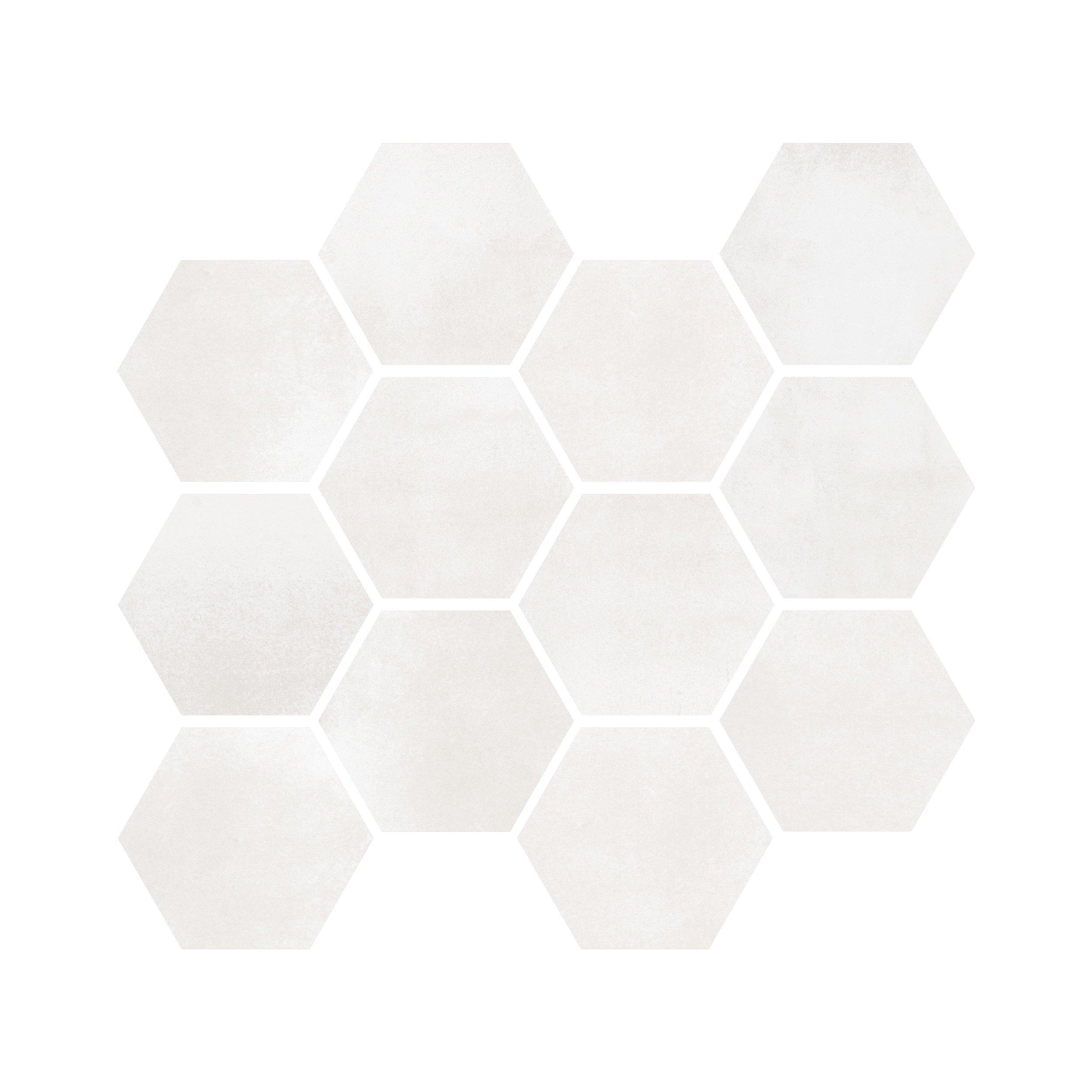 This white matte Luxe Sand Hexagon Matte Porcelain Mosaic is 12 x 12.