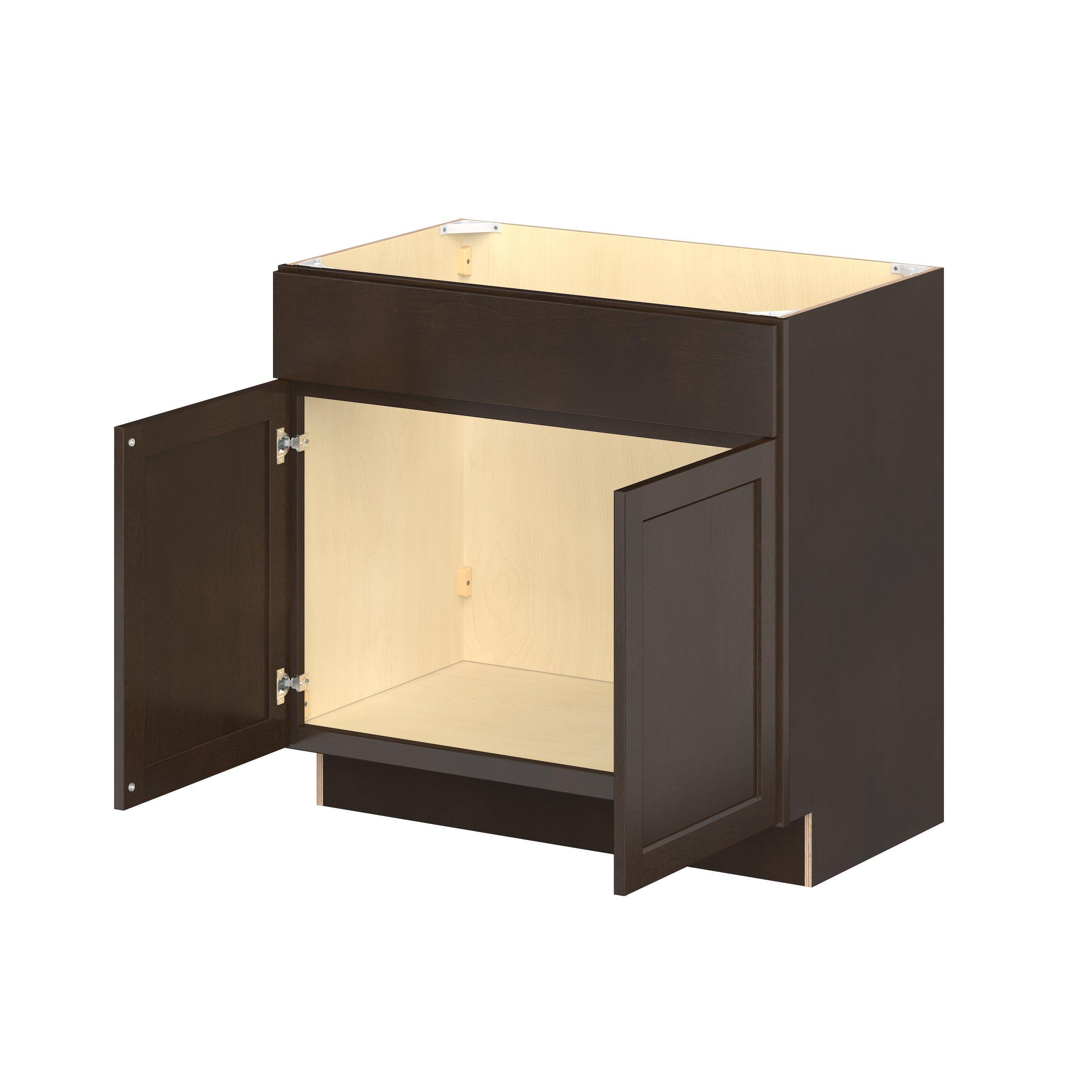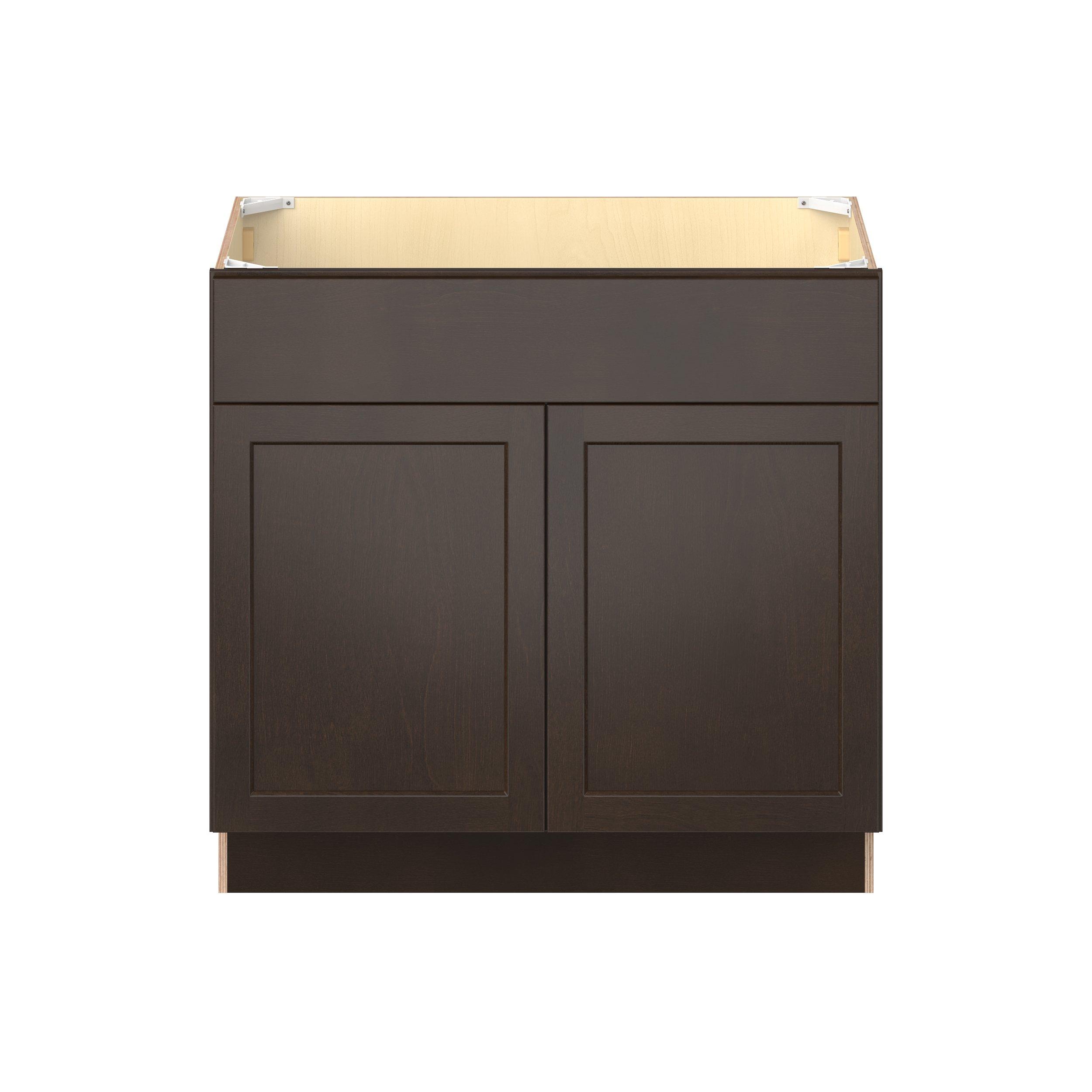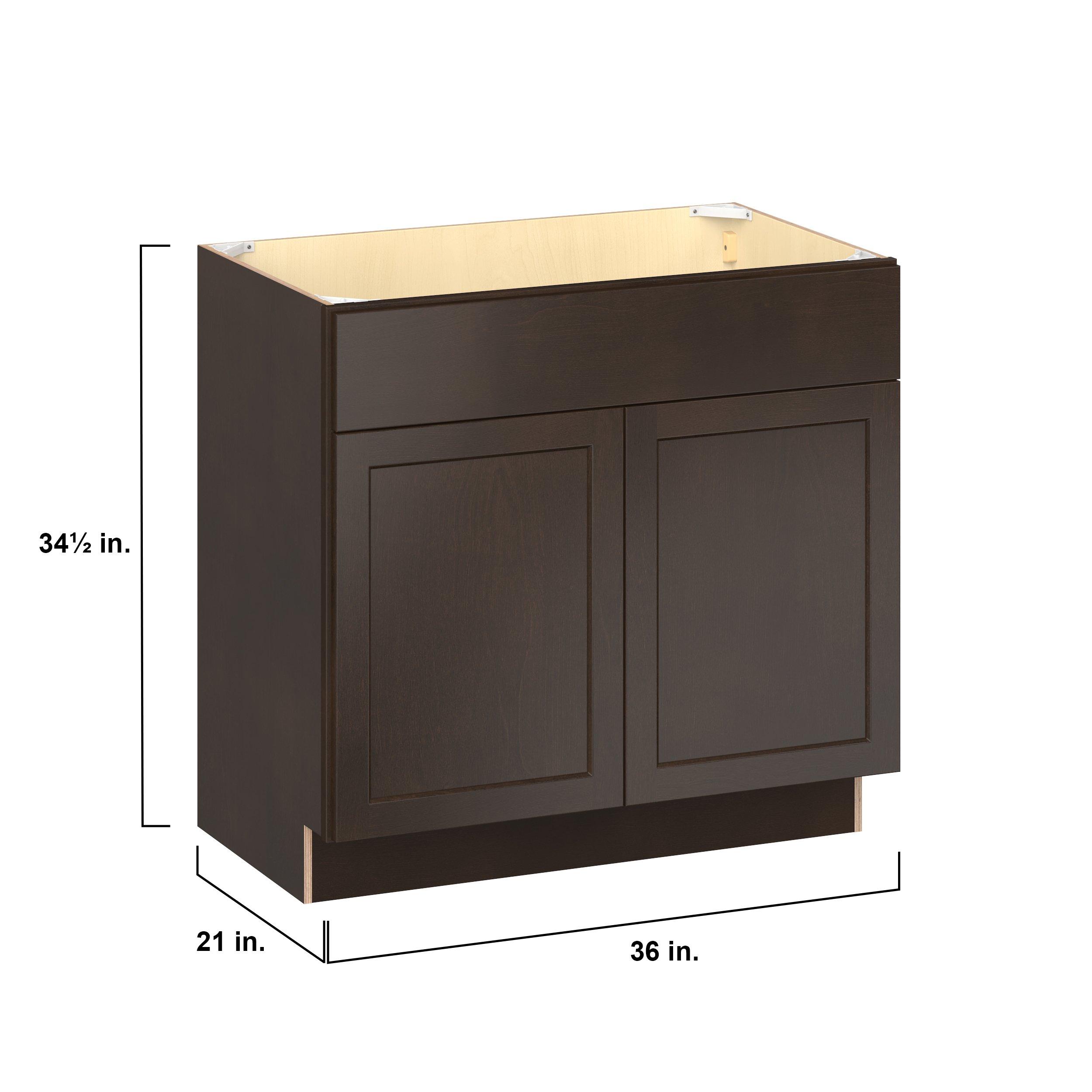 Embrace the timeless charm of the Baxley classic shaker door style. Studio Design Collection Baxley 36 in. Stained Cocoa Vanity Sink Base Cabinet features all plywood construction, offering both superior strength and sophistication to your space. Featuring 5-piece solid wood doors and dovetail drawer joints, these cabinets offer durability and elegance. Baxley classic shaker door style is designed to retain its stunning appearance and withstand the test of time.