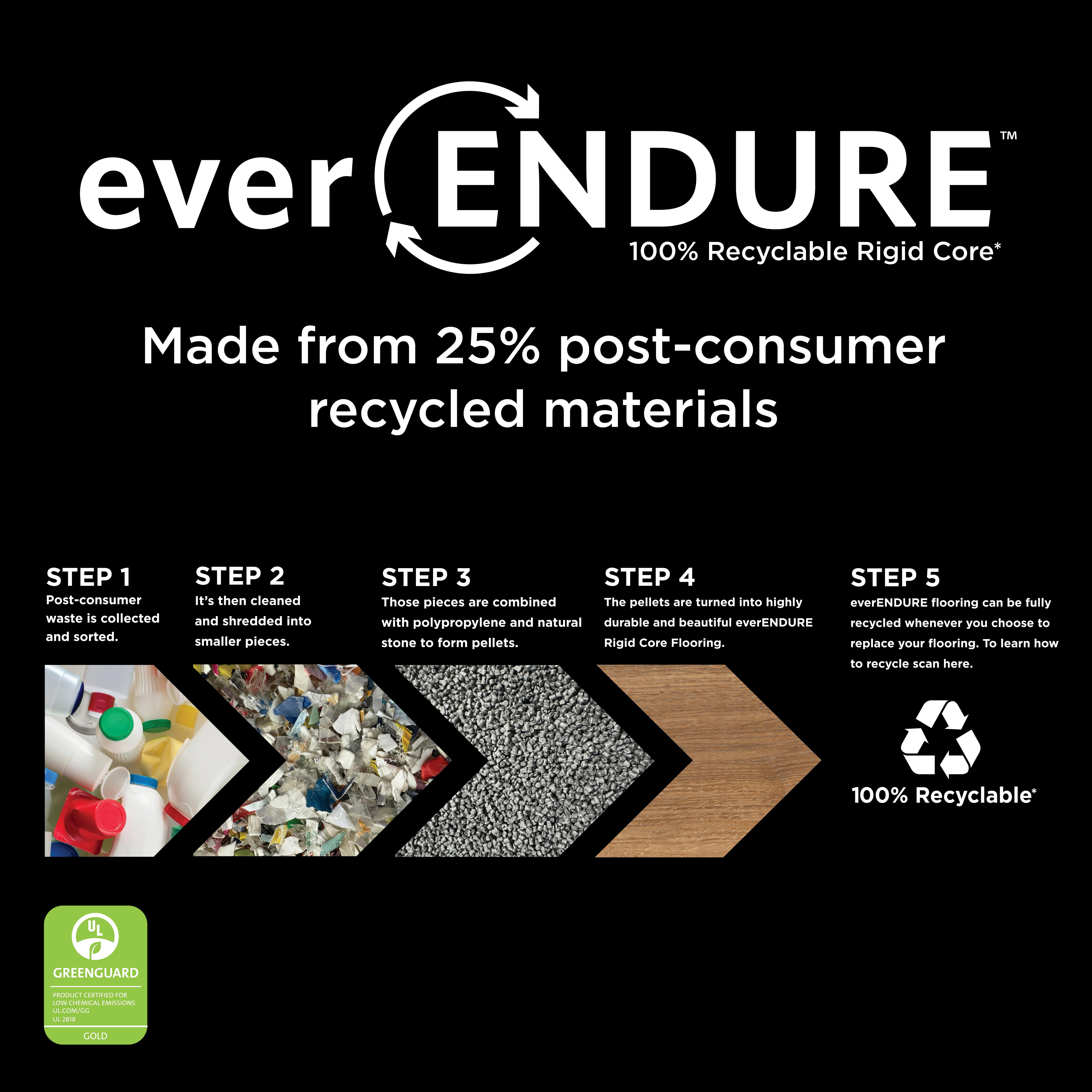 EverENDURE recyclable rigid core vinyl flooring blends modern design and exceptional performance with circular innovation. Crafted from 25% recycled materials and 100% recyclable after use, this flooring gives post-consumer plastics like yogurt cups and milk jugs a second life and helps reduce landfill waste while adding lasting beauty to your home.
