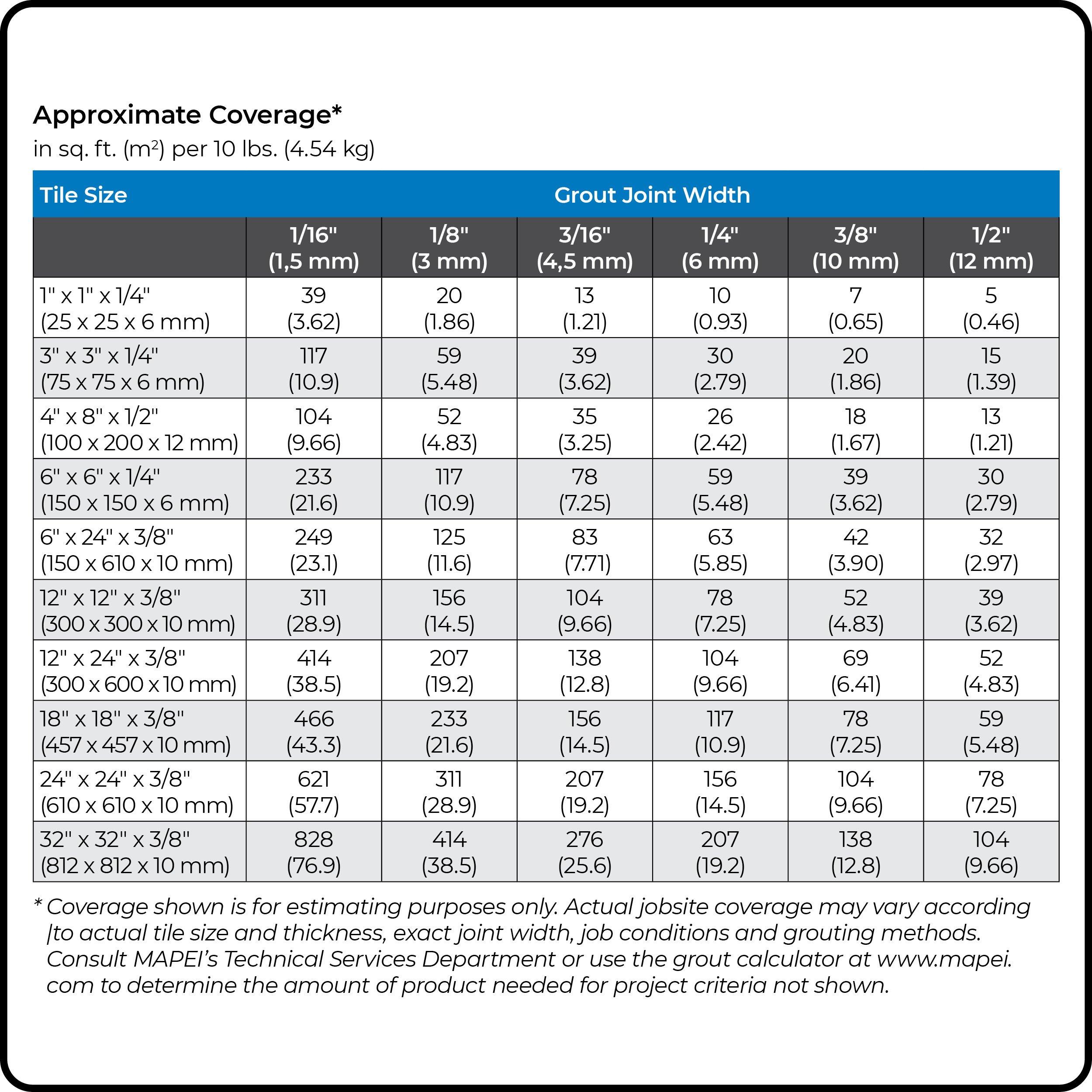 The estimated amount of coverage based on product size and manufacturer’s recommend (or commonly used) install application.