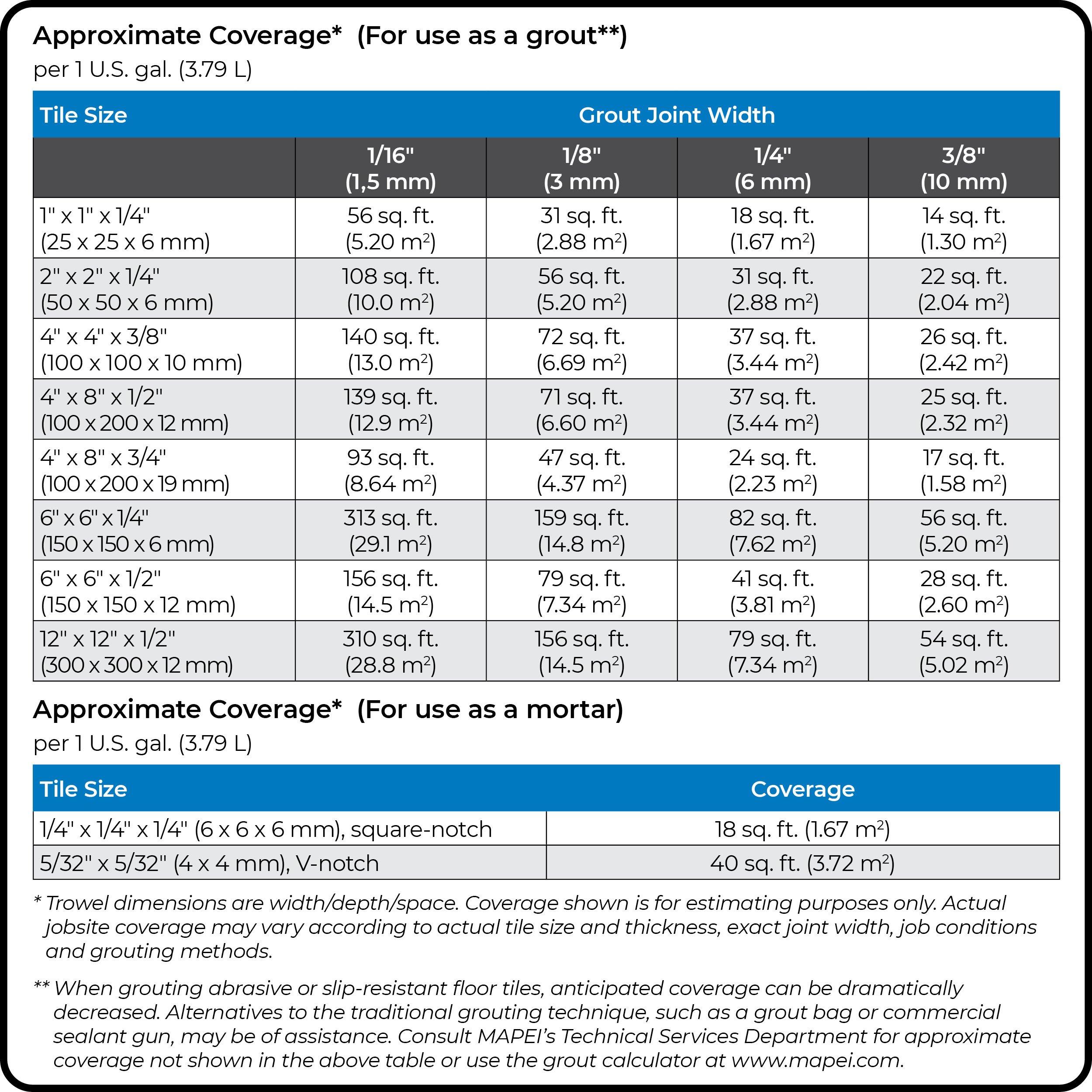 • For grout joints from 1/16" to 3/8" (1.5 to 10 mm)