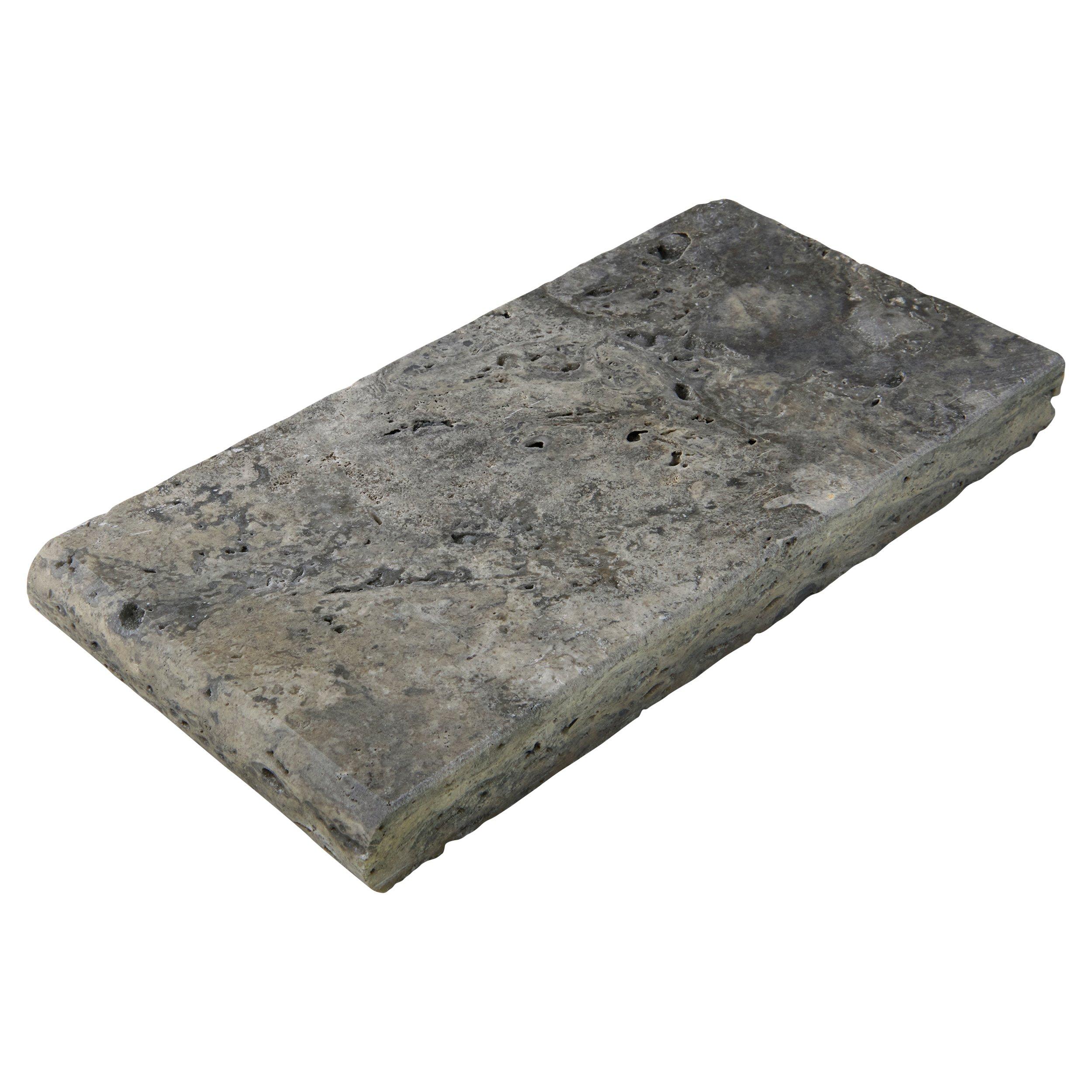 This Silver Tumbled Travertine Bullnose Coping 3cm. Paver is 6 x 12 and is gray.